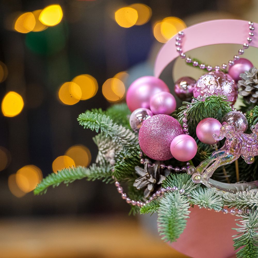 Оригинальная новогодняя композиция с нобилисом в розовом оформлении