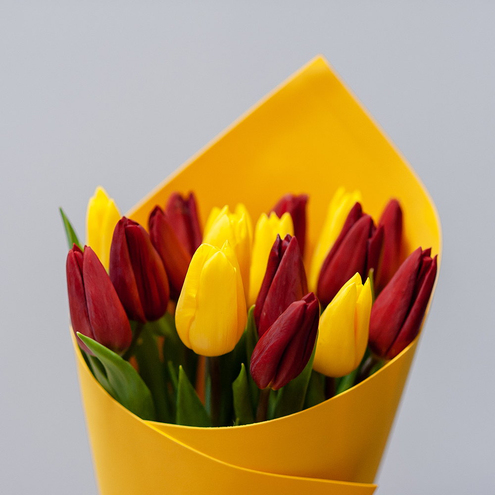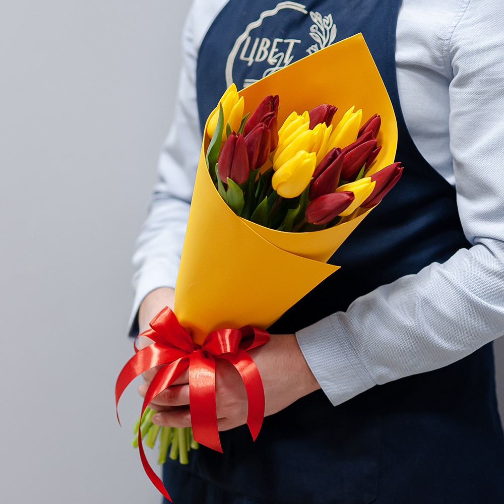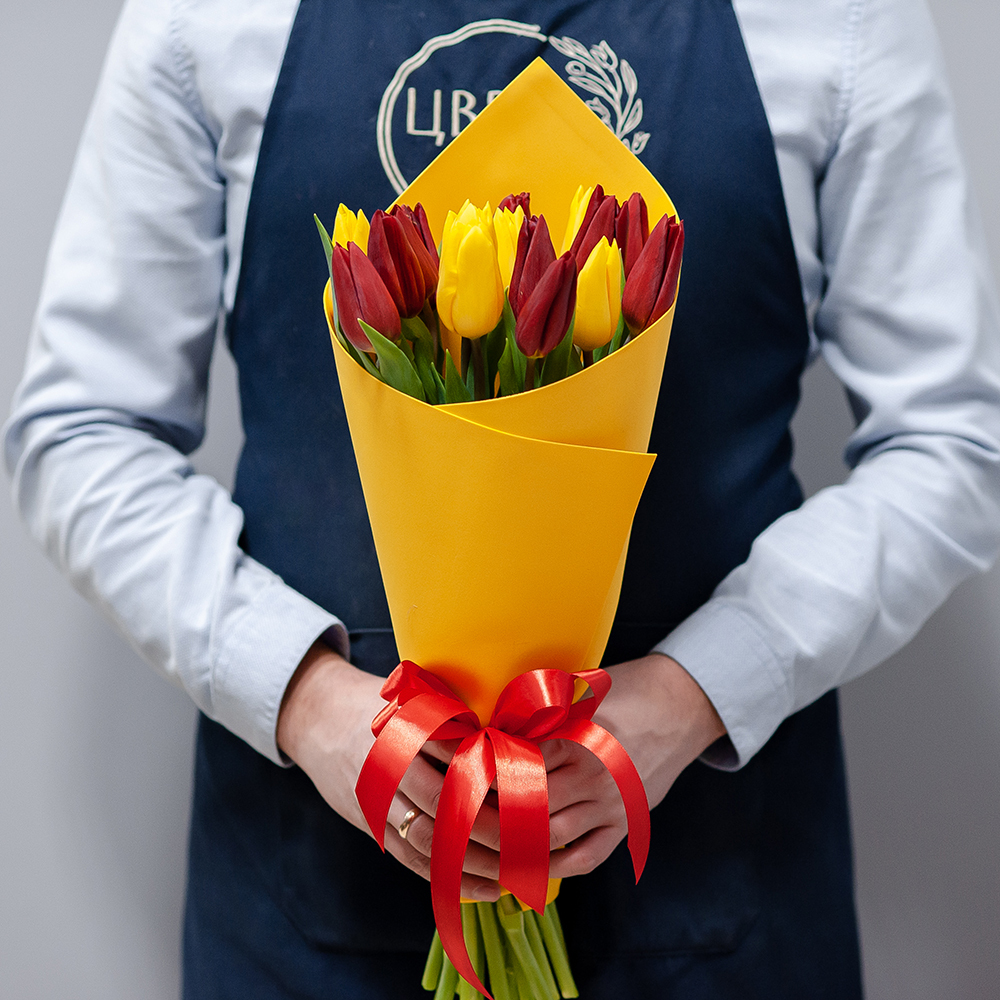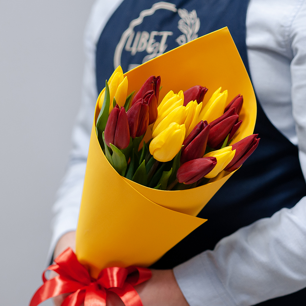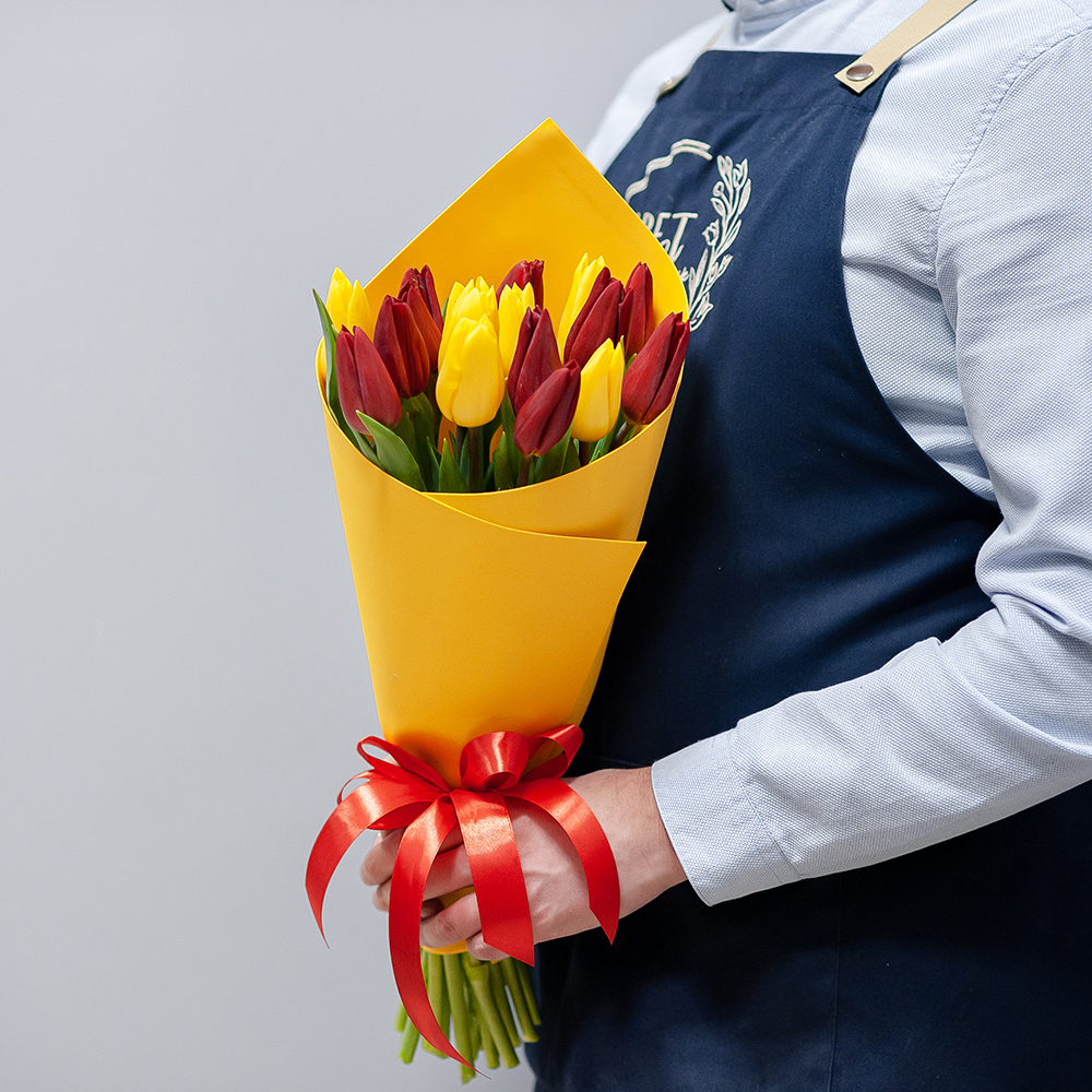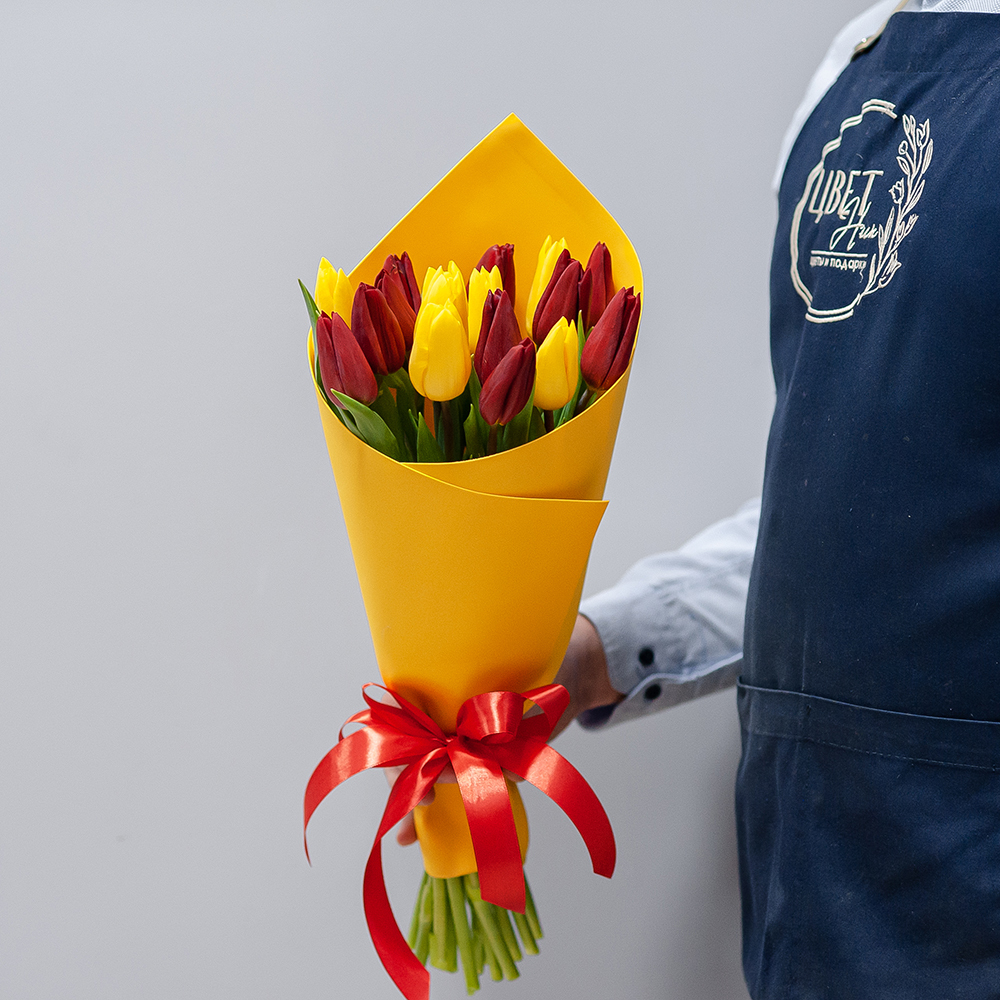 15 красно-желтых тюльпанов в оформлении