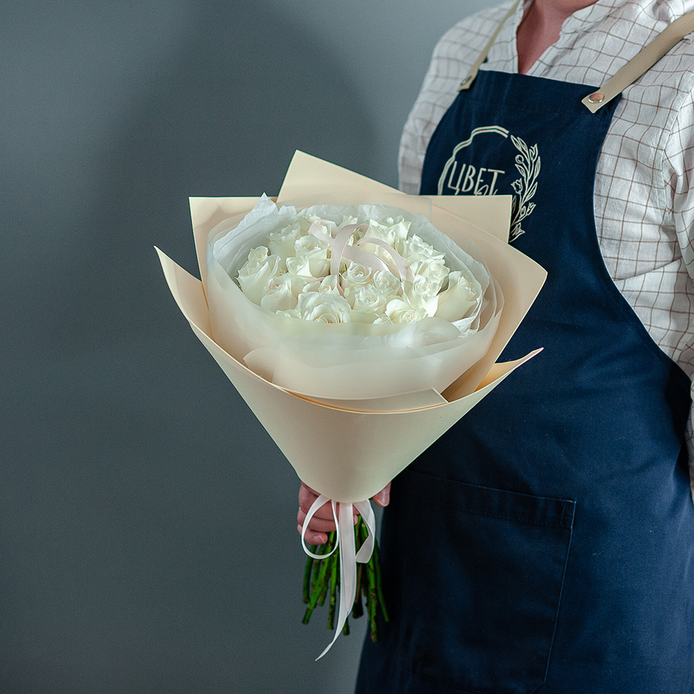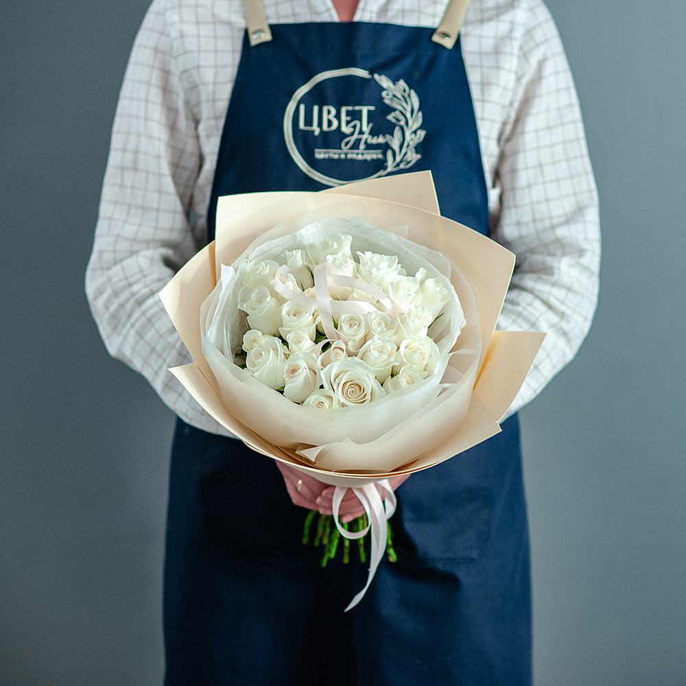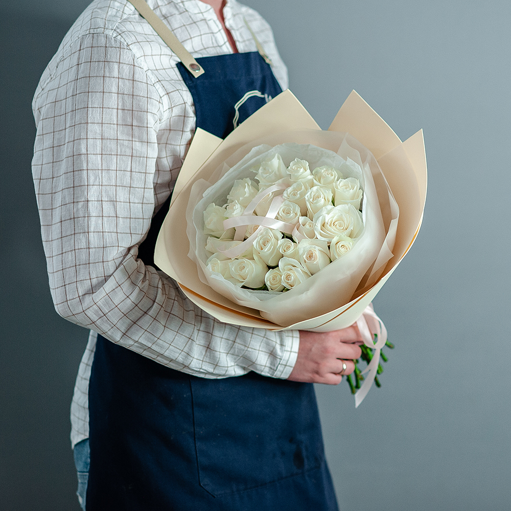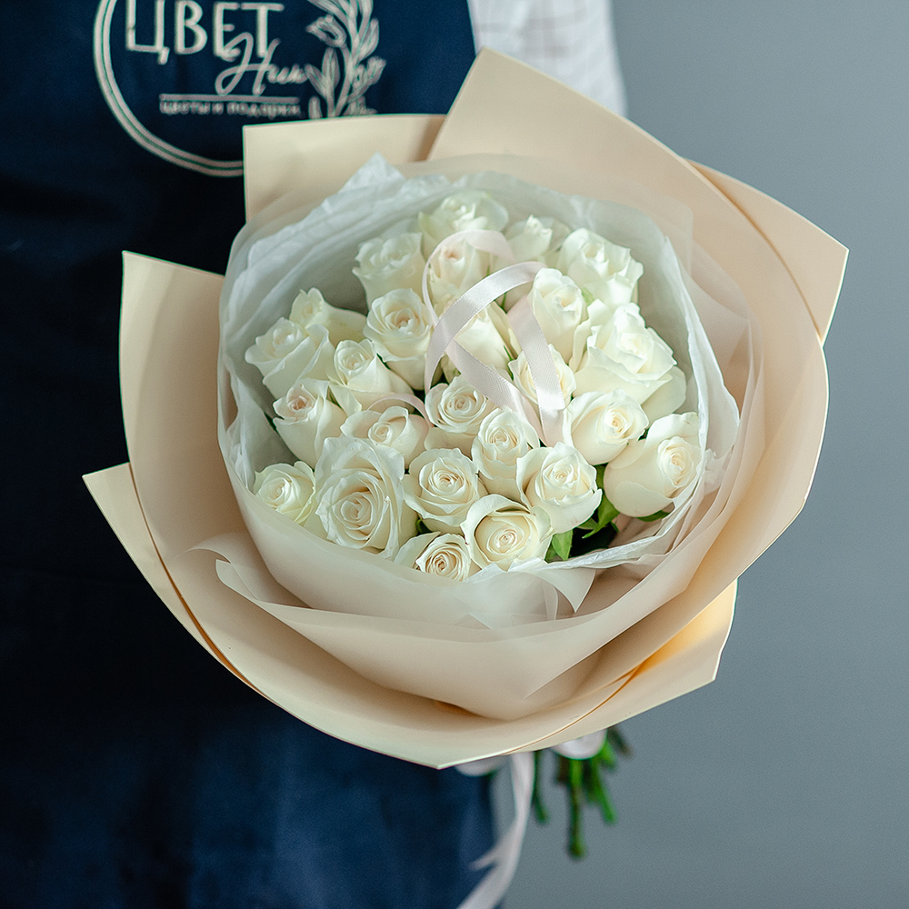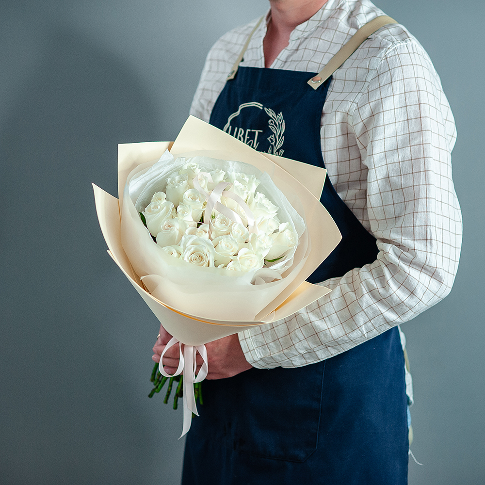 Букет из 25 белых кенийских роз** — это идеальный подарок для любого случая. Кенийские розы отличаются своей элегантностью и изяществом, а их тонкий аромат создаёт атмосферу нежности и уюта. Букет из этих роз станет прекрасным подарком на любой праздник или просто приятным знаком внимания. Нежное оформление букета подчёркивает красоту цветов и делает его ещё более привлекательным. Благодаря стильной упаковке и лаконичному дизайну букет выглядит элегантно и изысканно. Он будет радовать получателя своей красотой и свежестью в течение долгого времени. Букет из 25 белых кенийских роз — это прекрасный способ выразить свои чувства и создать праздничное настроение.
