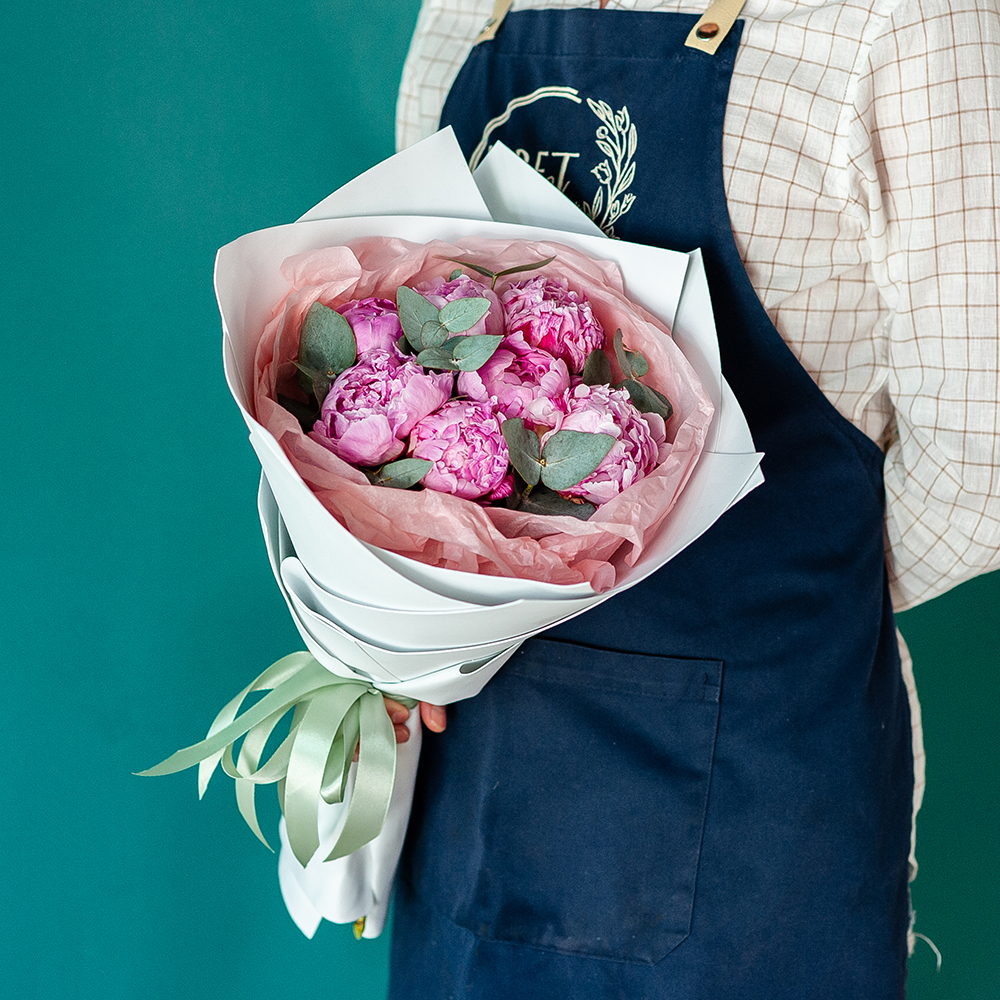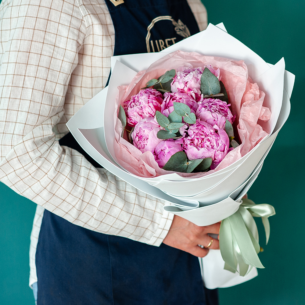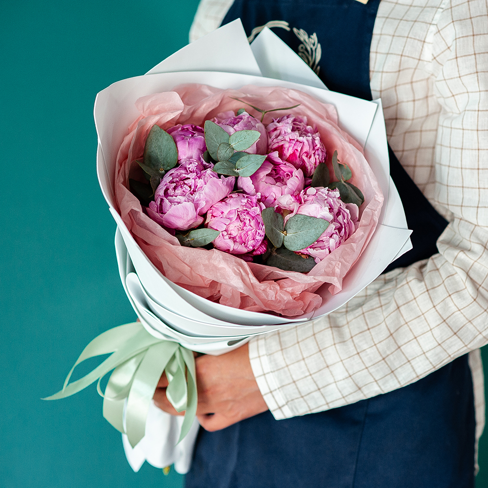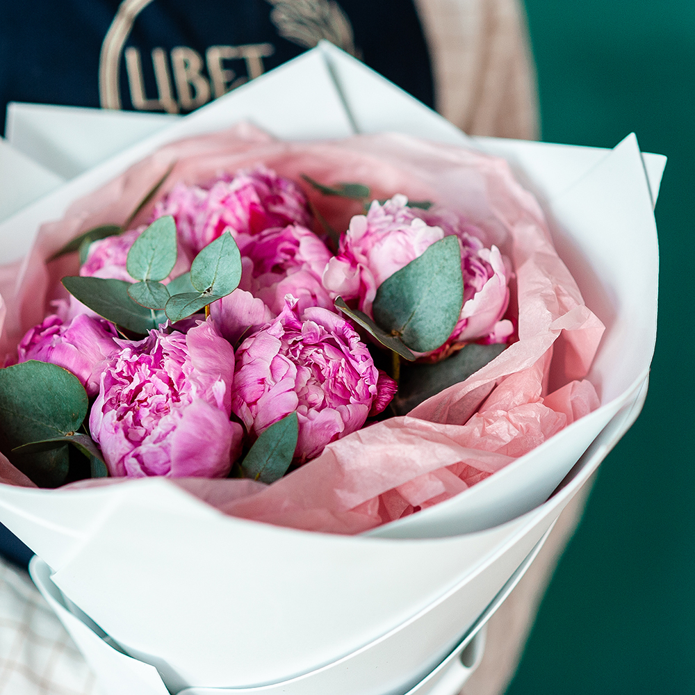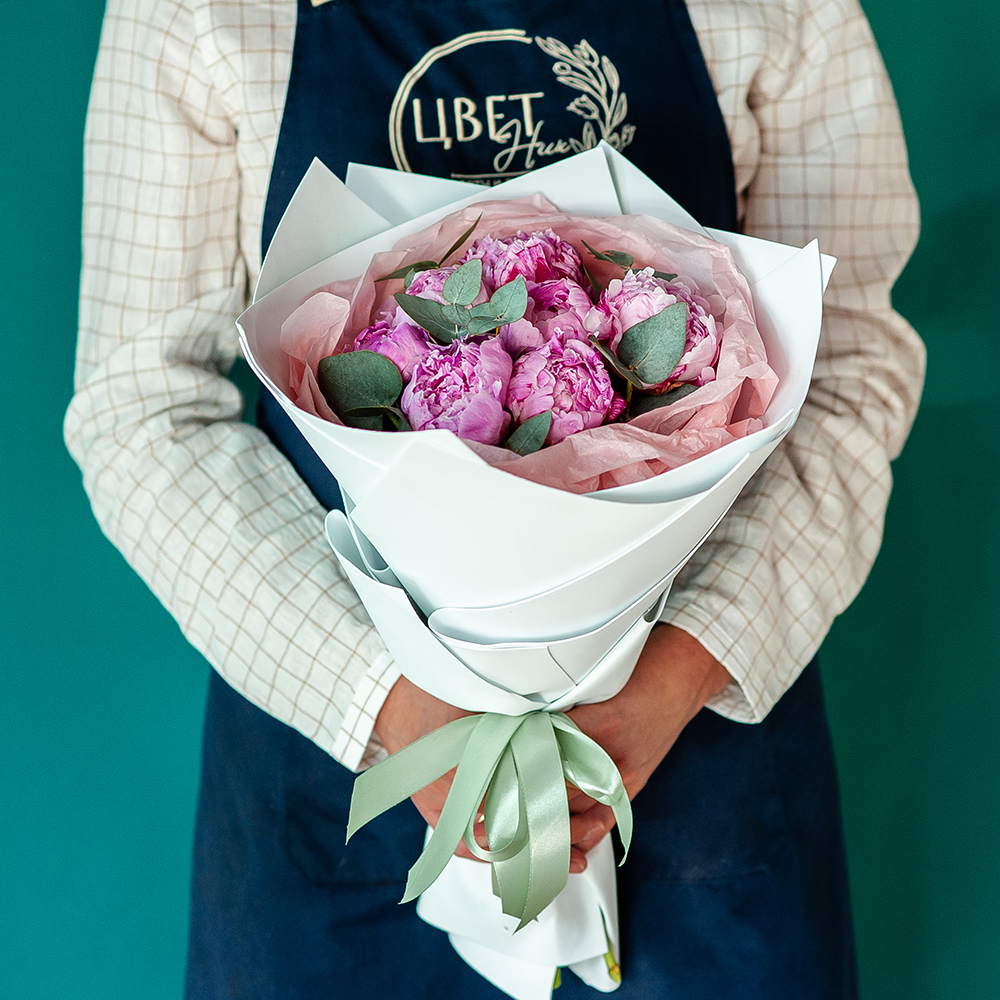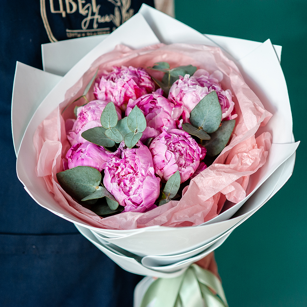 Букет из пионов с доставкой по Рязани Подарите радость и нежность с помощью восхитительного букета пионов! Нежные розовые пионы в сочетании с ароматной зеленью создают изысканную и стильную композицию, которая станет идеальным подарком для любого случая. ?? Состав: свежие пионы, ветки эвкалипта, стильная упаковка. ?? Оформление: фоамиран, бумага тишью, атласная лента. ?? Доставка: оперативно по Рязани прямо в руки получателю. ?? Повод: день рождения, юбилей, признание в чувствах, благодарность или просто чтобы поднять настроение! Сделайте заказ прямо сейчас, и мы доставим букет по указанному адресу точно в срок! ???