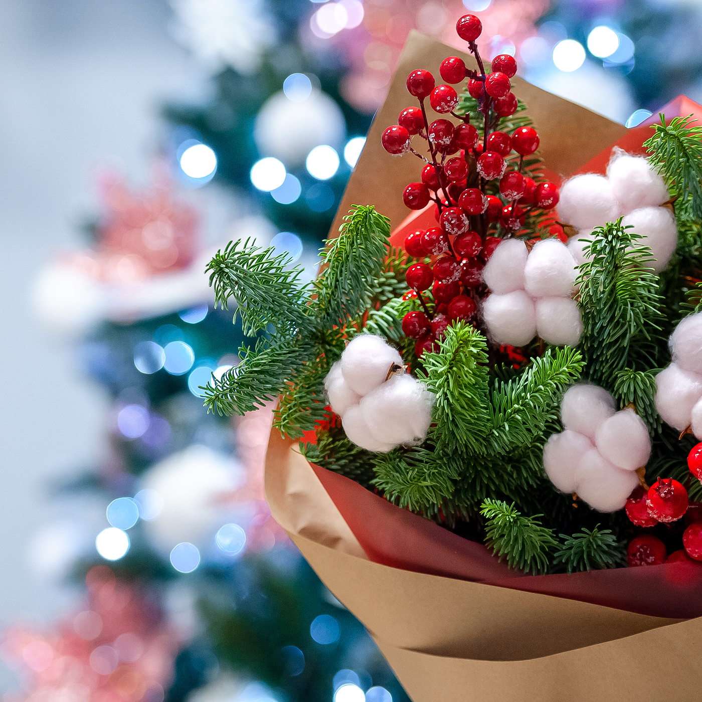 Букет из нобилиса и хлопка, оформленный в крафт