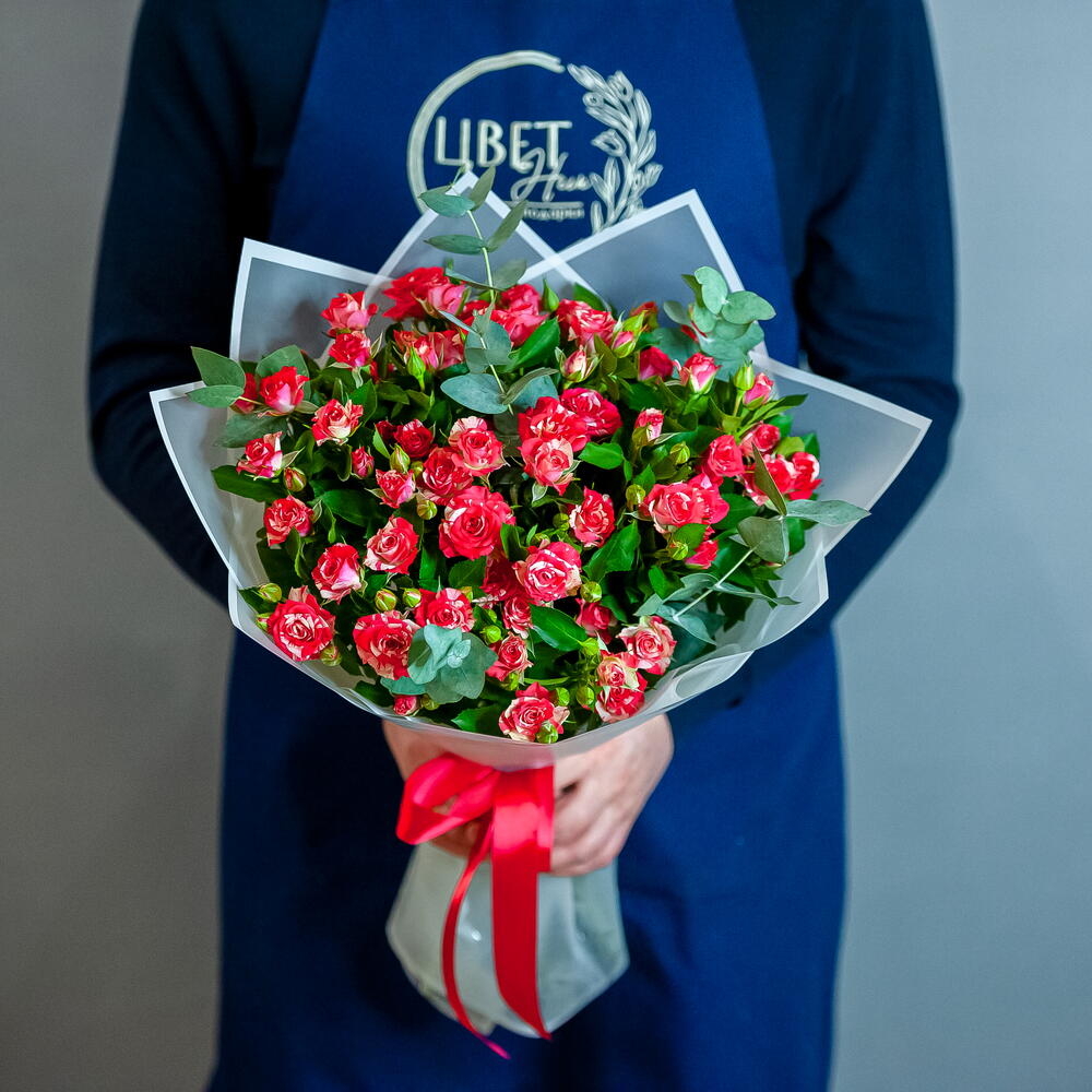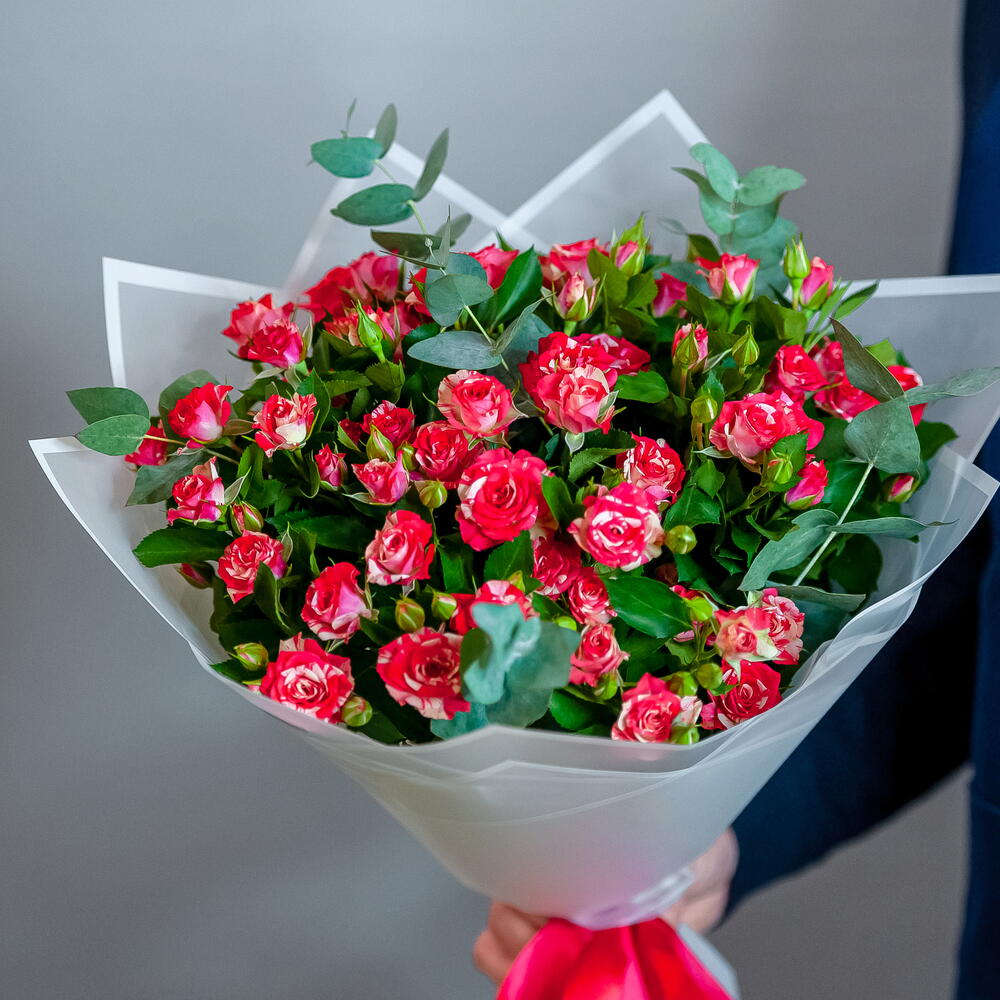 Букет ярких кустовых роз в светлом оформлении