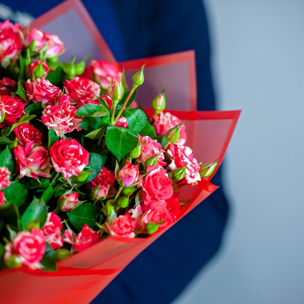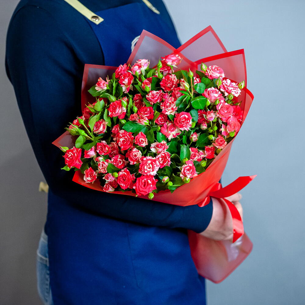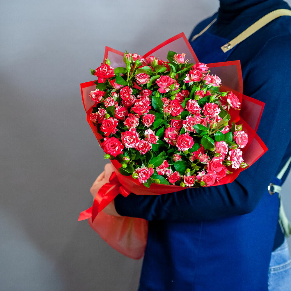 Букет ярких кустовых роз в в красном оформлении