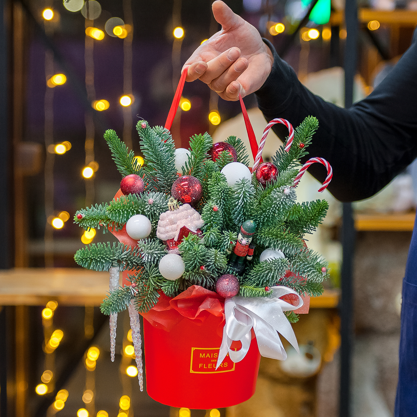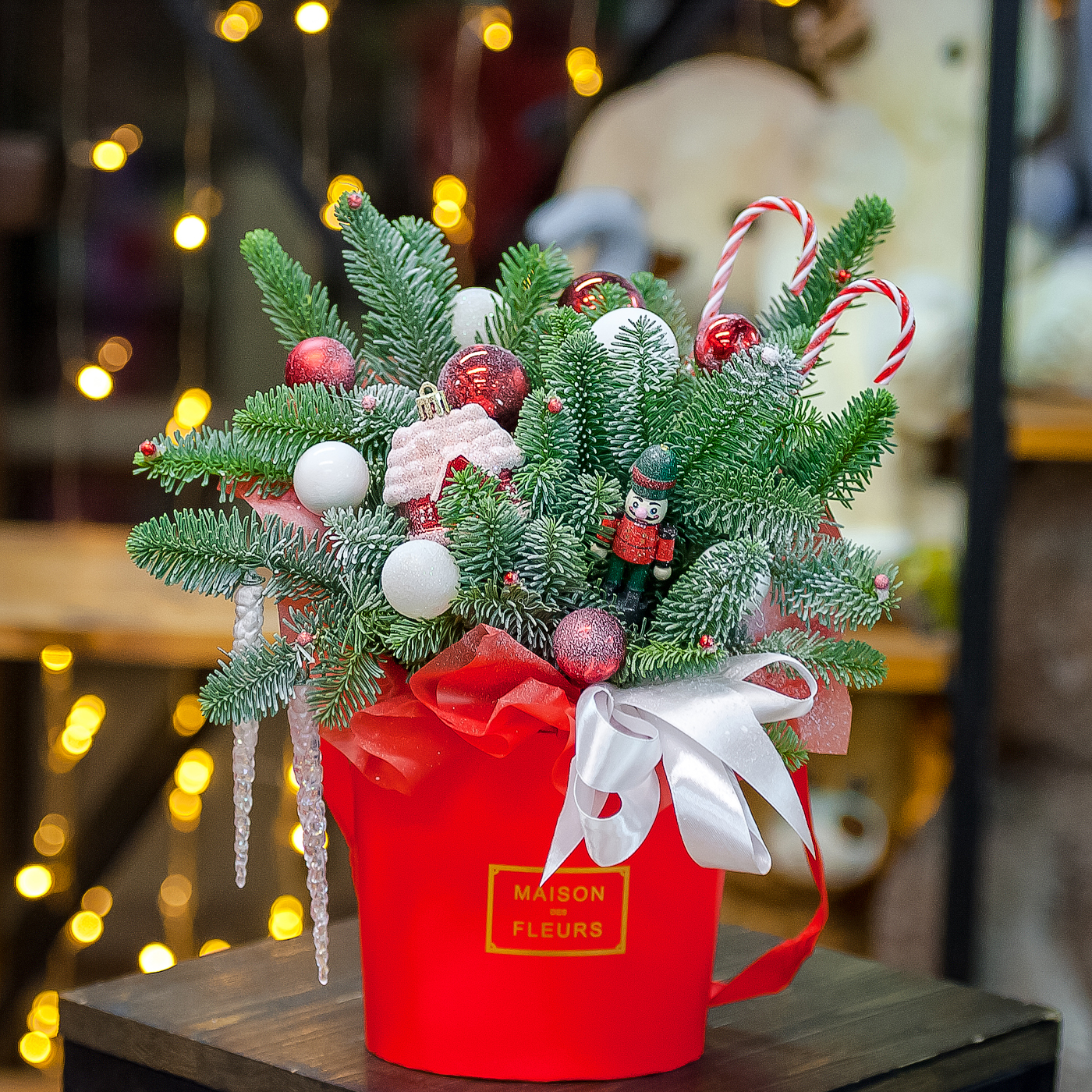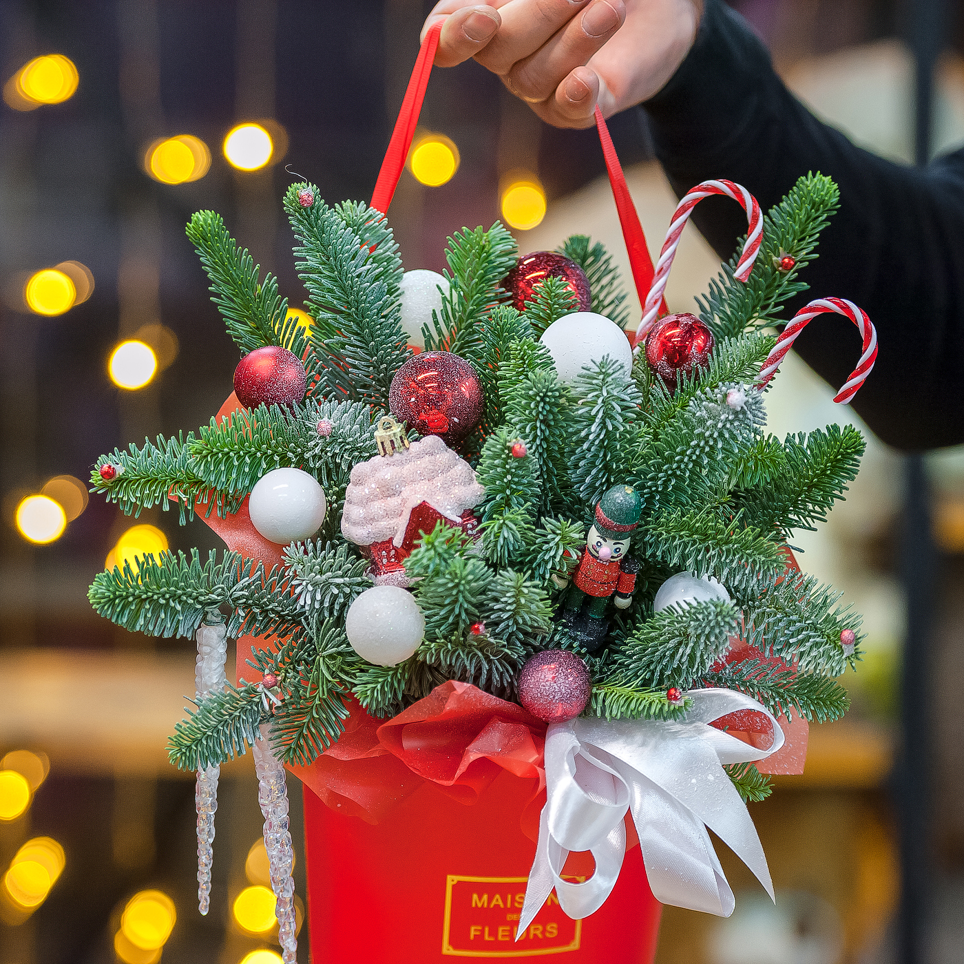 Новогодняя композиция в красном оформлении с нобилисом
