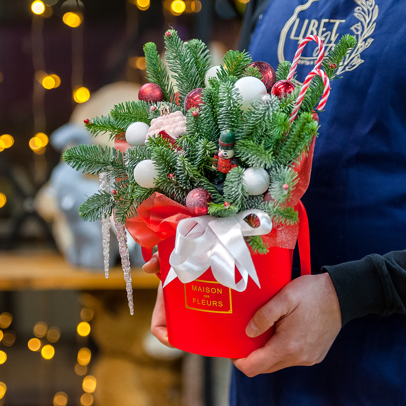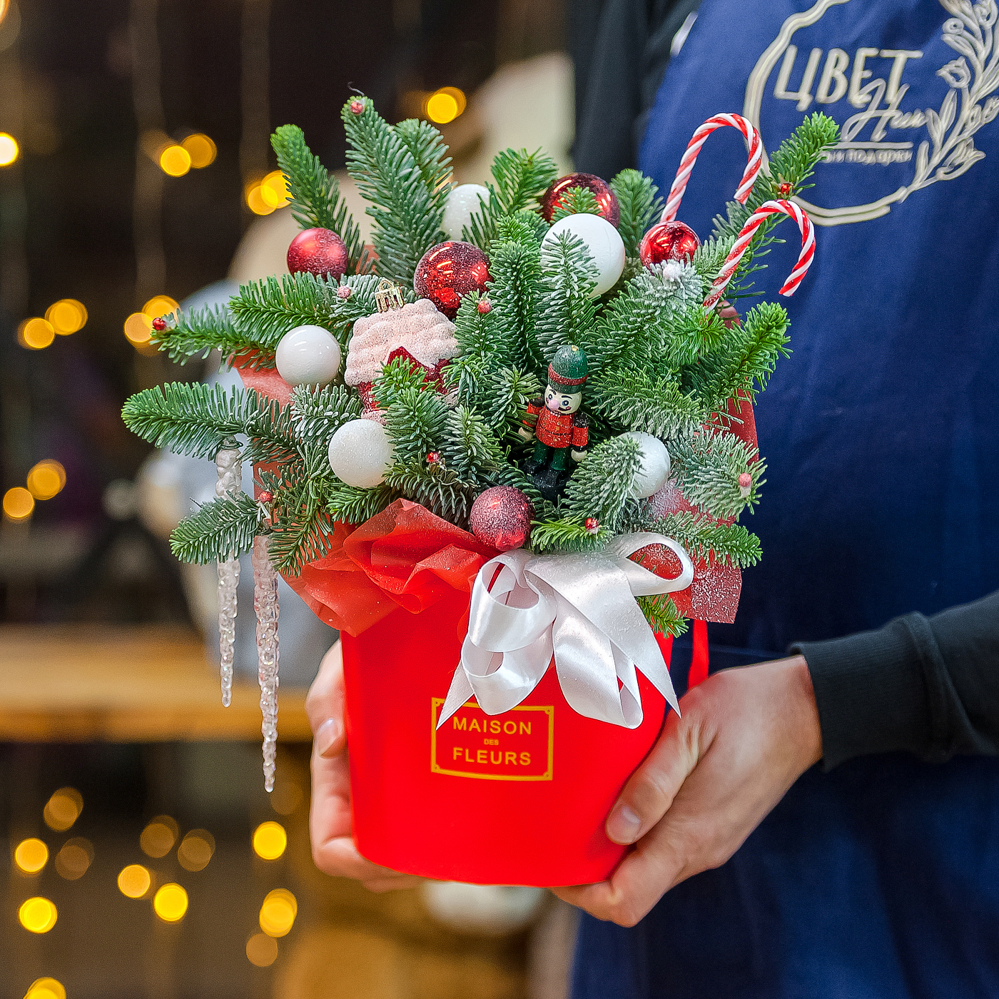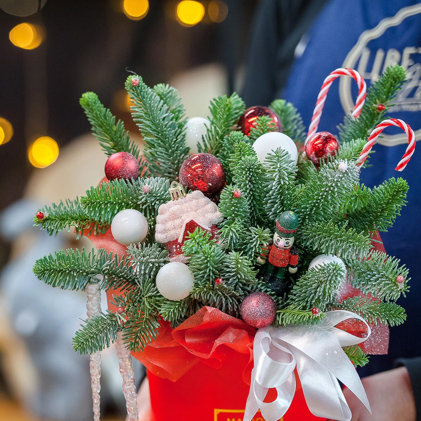 Новогодняя композиция в красном оформлении с нобилисом