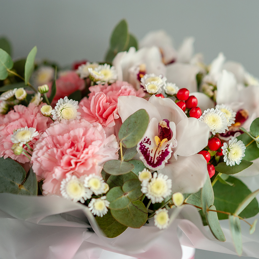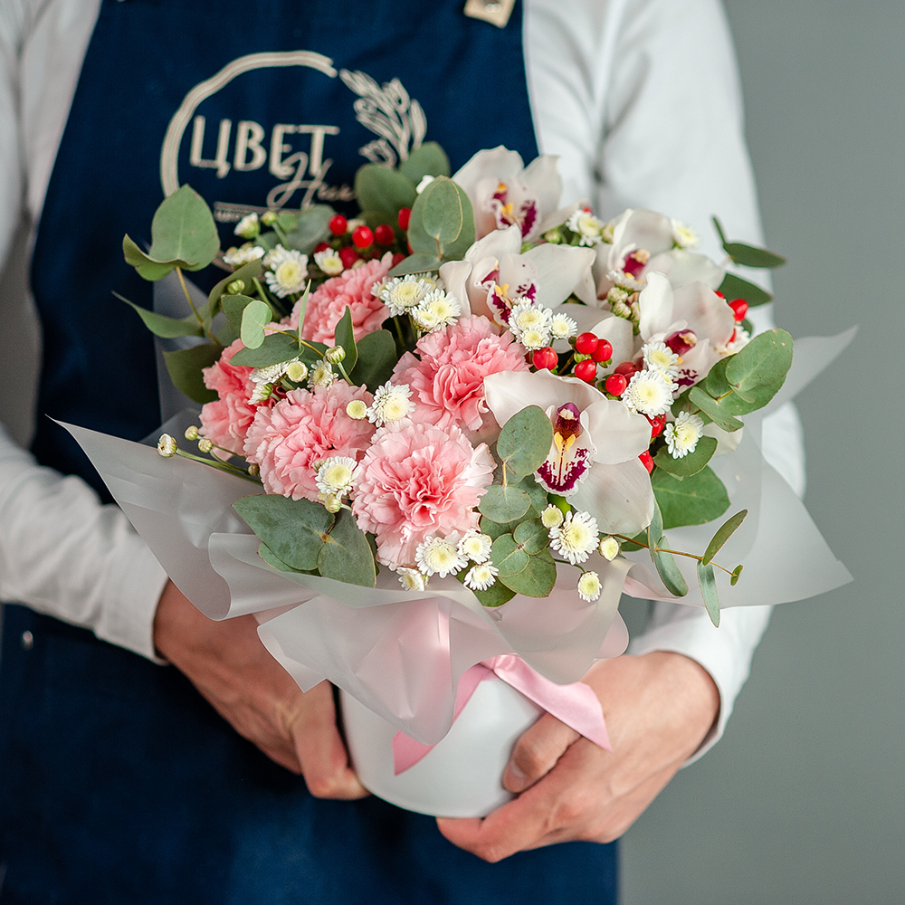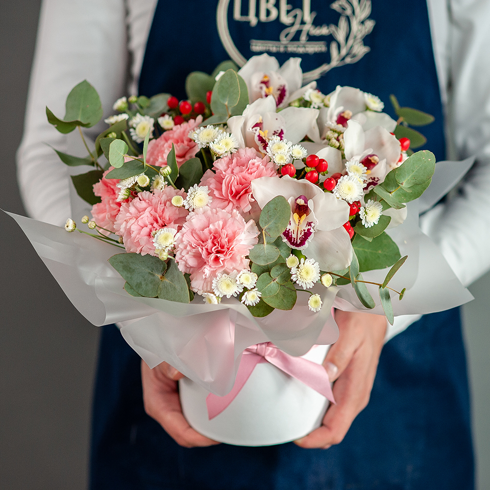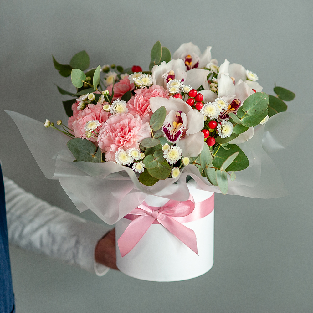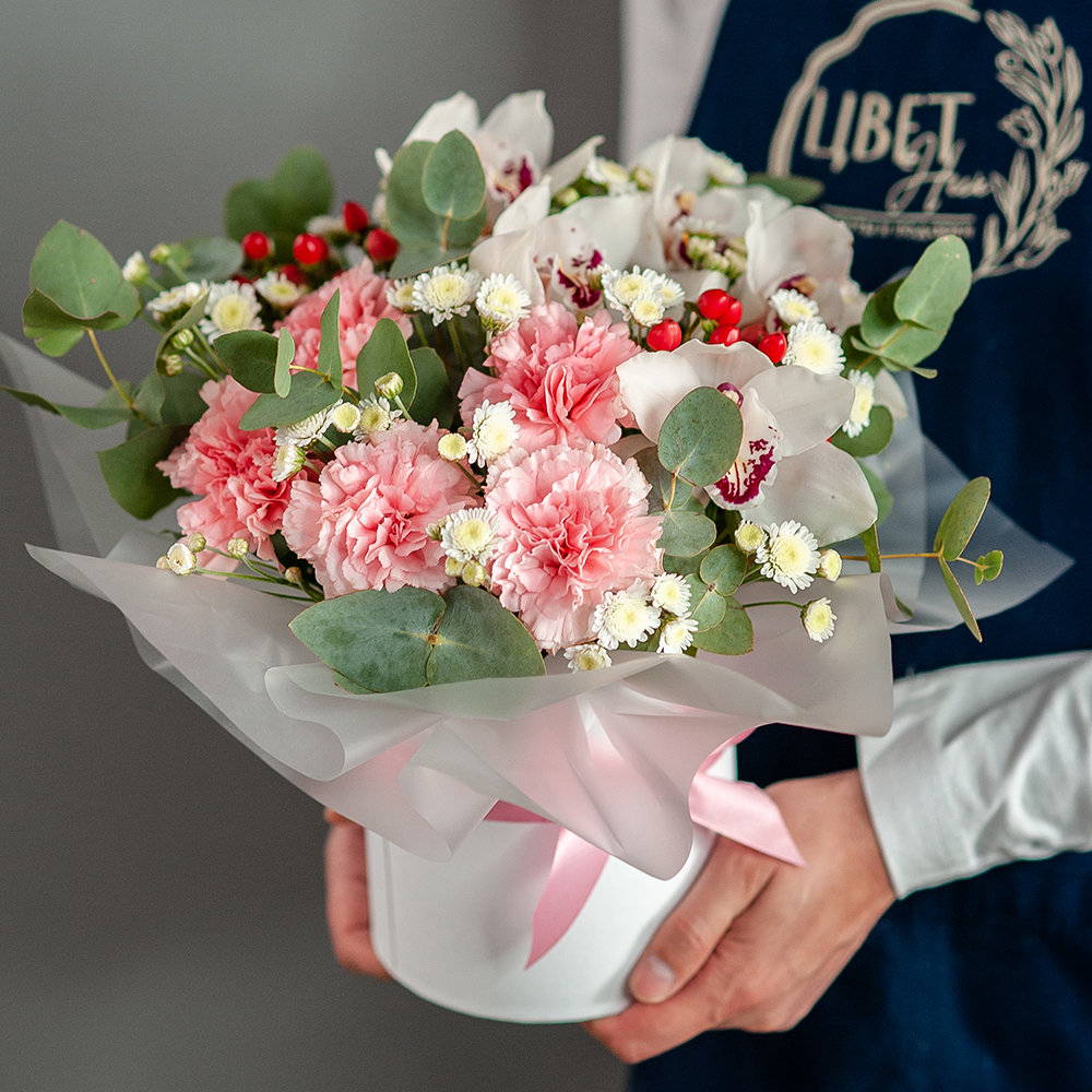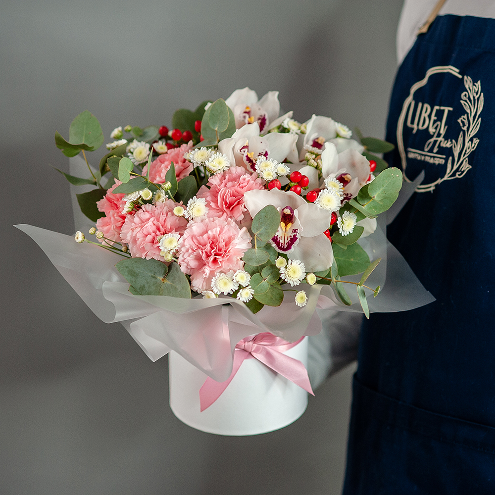 Нежная цветочная композиция в шляпной коробке с доставкой по Рязани Подарите радость и заряд положительных эмоций с этим утонченным цветочным букетом! Легкость и нежность композиции подчеркнут изысканные белые орхидеи, розовые гвоздики, воздушная зелень эвкалипта и мелкие белые ромашки, а красные ягодки добавят яркий акцент. Этот букет – идеальный выбор для поздравления дорогого человека, будь то день рождения, юбилей, 8 марта или просто способ выразить свою любовь и внимание. Упакованный в стильную шляпную коробку с изящной лентой, он не требует вазы и сохранит свою свежесть дольше. Доставка по Рязани Готовый подарок – не требует дополнительной упаковки Сборка вручную профессиональными флористами Закажите прямо сейчас и порадуйте близких восхитительными цветами!