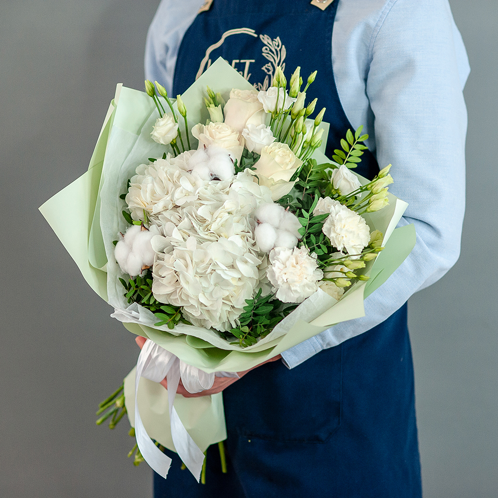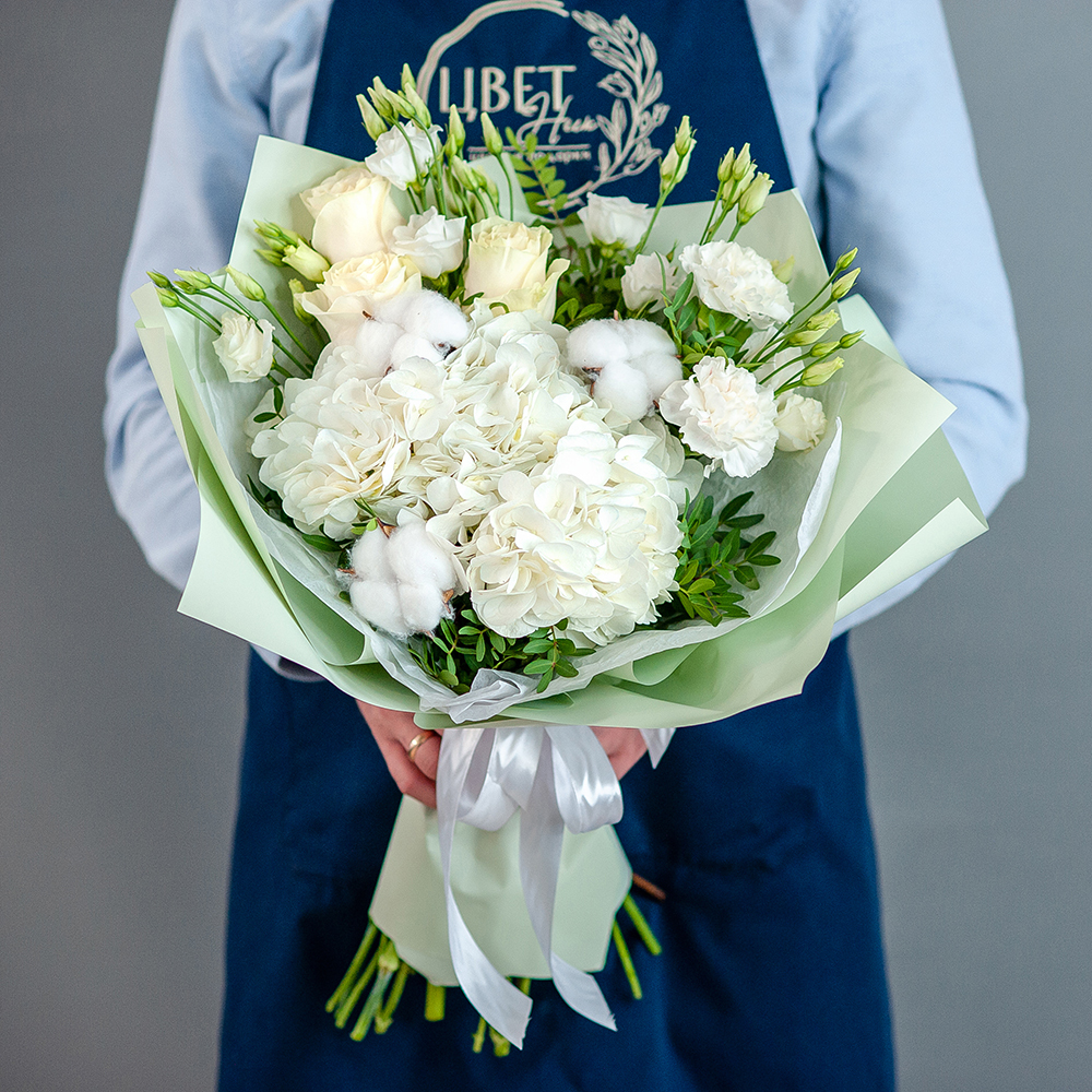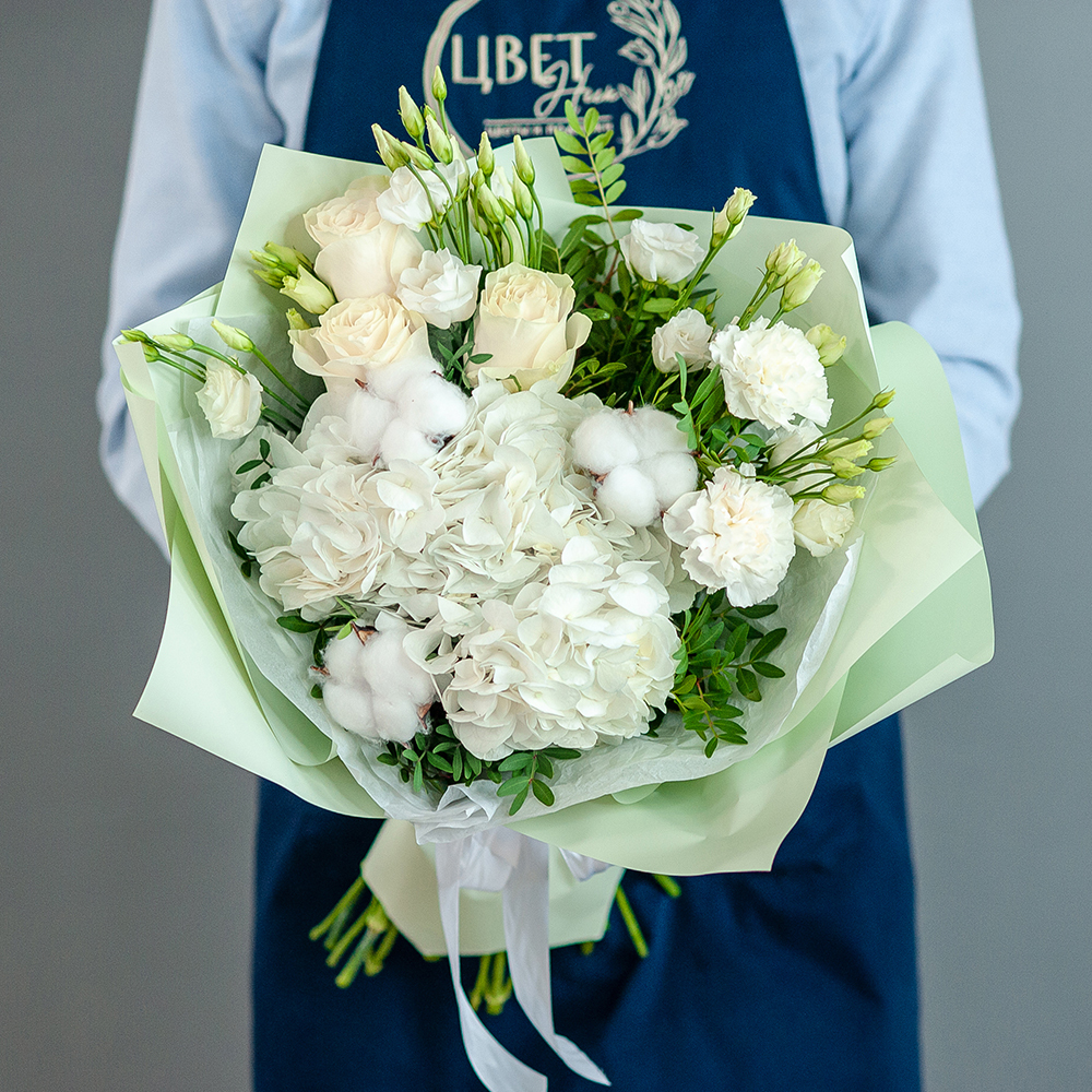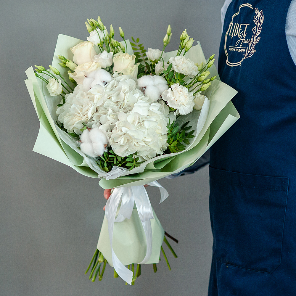 Подарите красоту и утонченность вместе с нашим роскошным букетом «Нежность»! В составе — элегантные белые розы, пышная гортензия, нежные эустомы и воздушные хлопковые соцветия, завернутые в стильную упаковку с атласной лентой. Идеален для: Романтического подарка Поздравления с днем рождения Свадебного торжества Выражения благодарности Доставка по городу Рязань – привезем букет в удобное для вас время! Возможность безналичной оплаты. Закажите «Нежность» прямо сейчас и подарите радость близким!