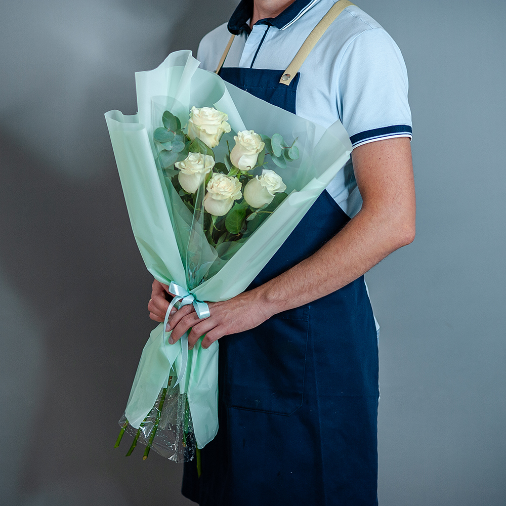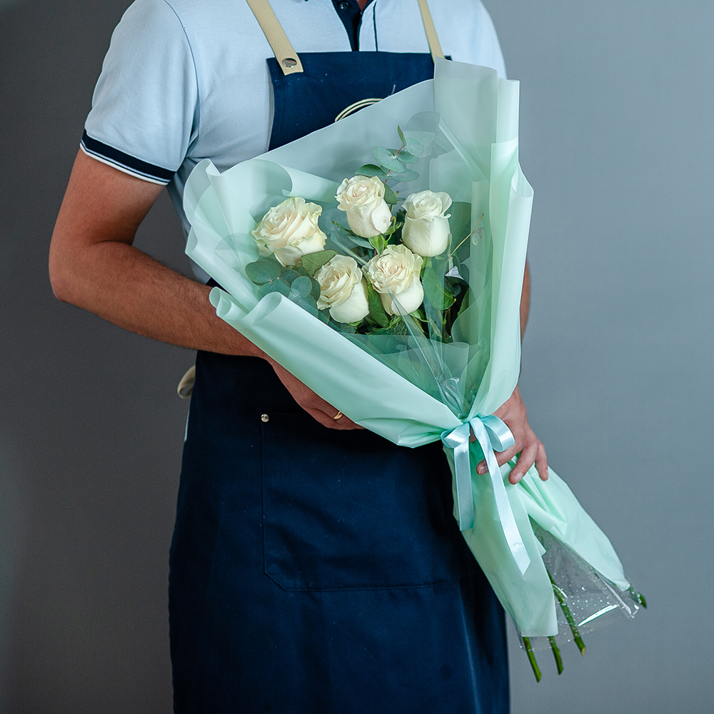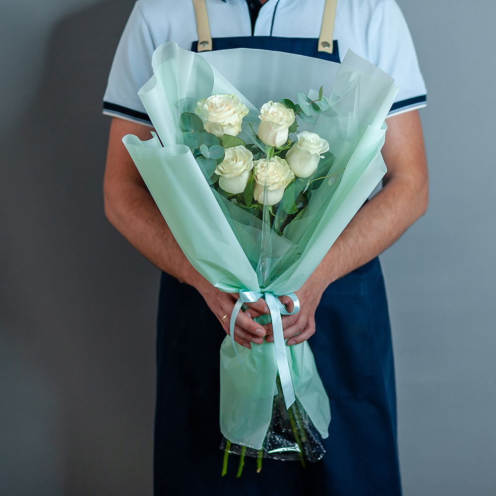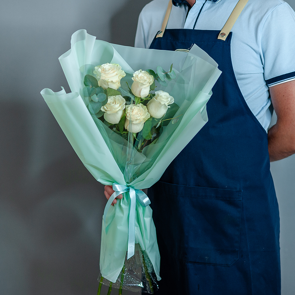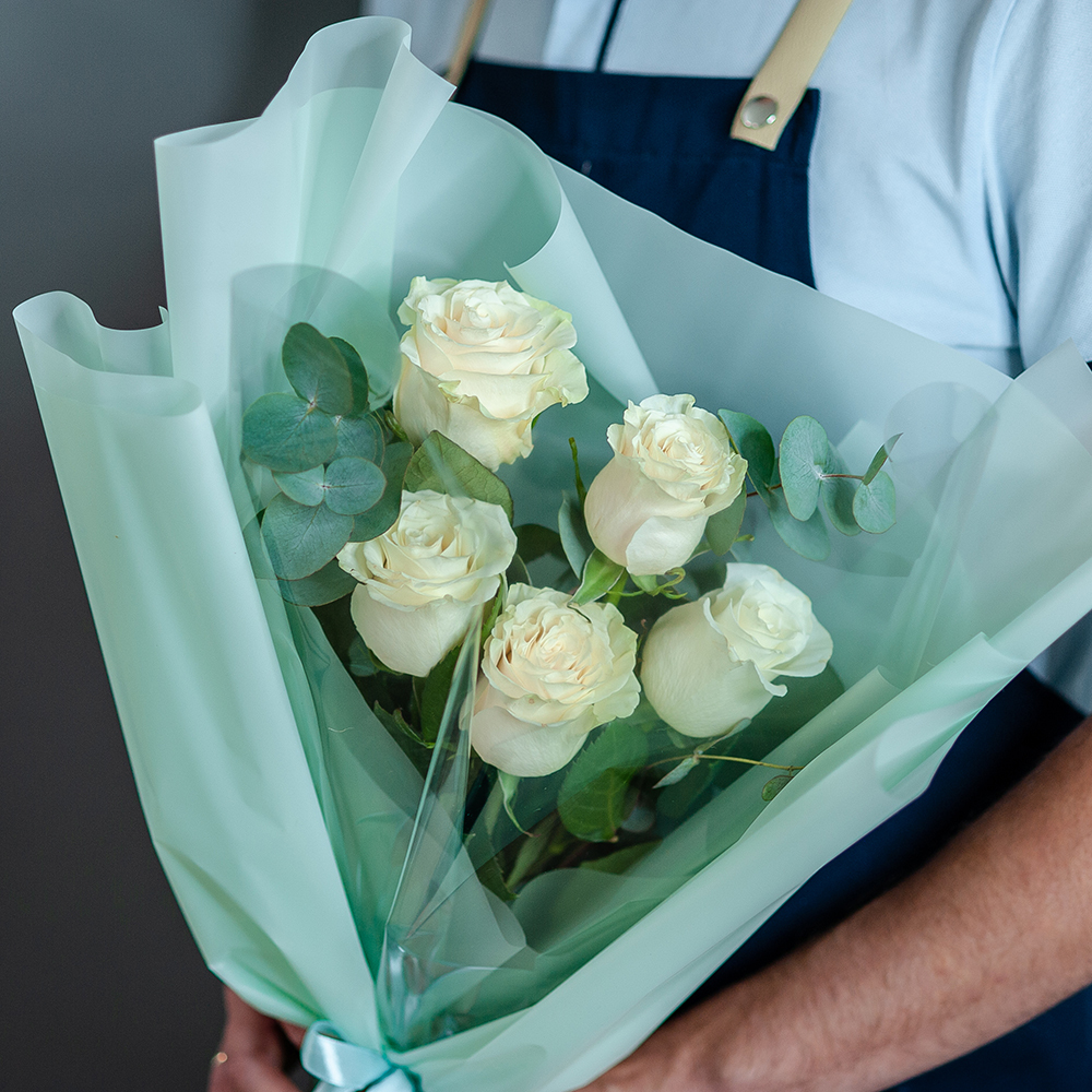 Букет из белых роз с эвкалиптом Элегантный букет из 5 белых роз с эвкалиптом – идеальный подарок для любого торжества! Лаконичное сочетание нежных белых роз и свежей зелени эвкалипта делает этот букет настоящим воплощением утонченности и стильной классики. Подойдет для: Дня рождения Годовщины Свадебного торжества Признания в любви Просто для хорошего настроения Что входит в состав: – 7 свежих белых роз – Веточки эвкалипта – Стильная упаковка в пастельных тонах с лентой Доставка по Рязани – быстро и удобно! Наши флористы подготовят букет перед вручением, чтобы он выглядел безупречно. Закажите сейчас и порадуйте любимых прекрасным подарком!
