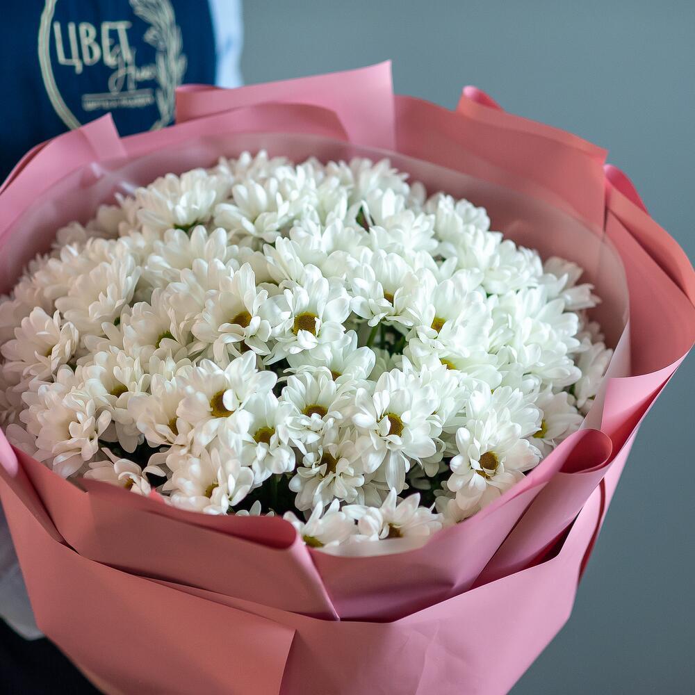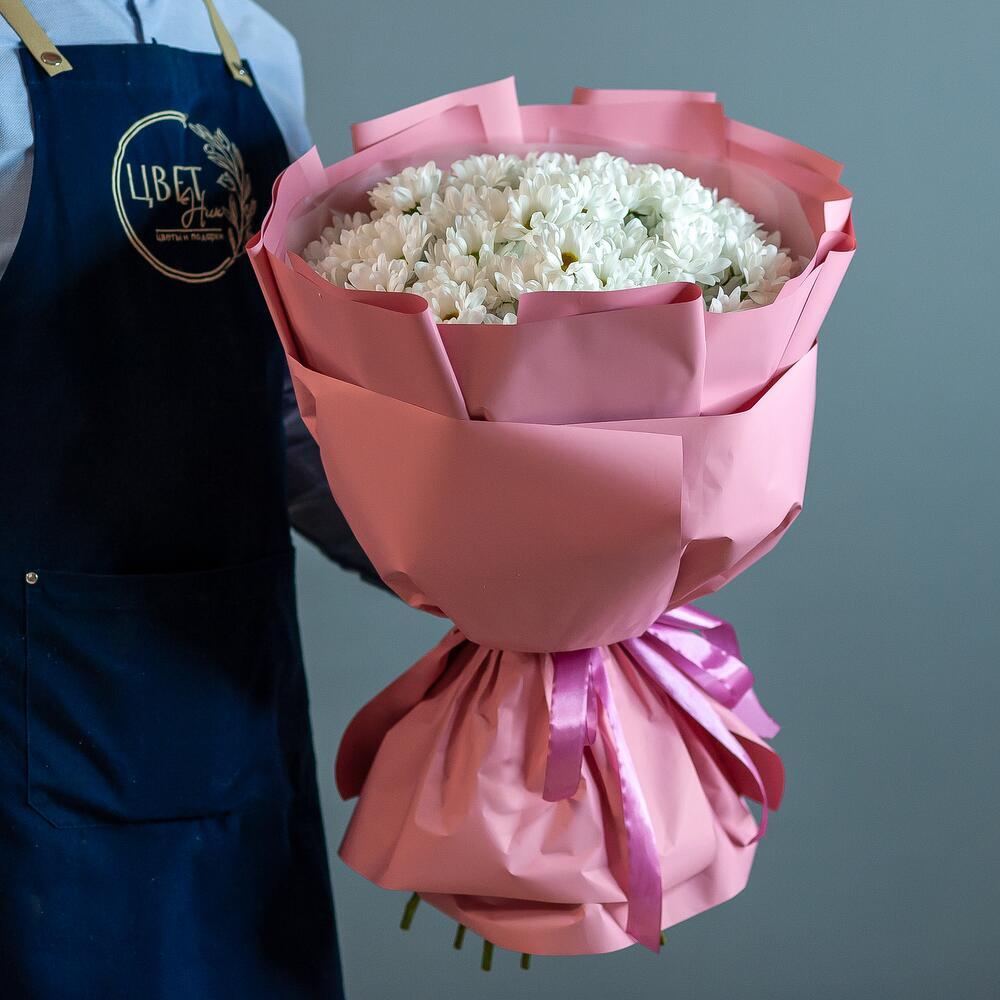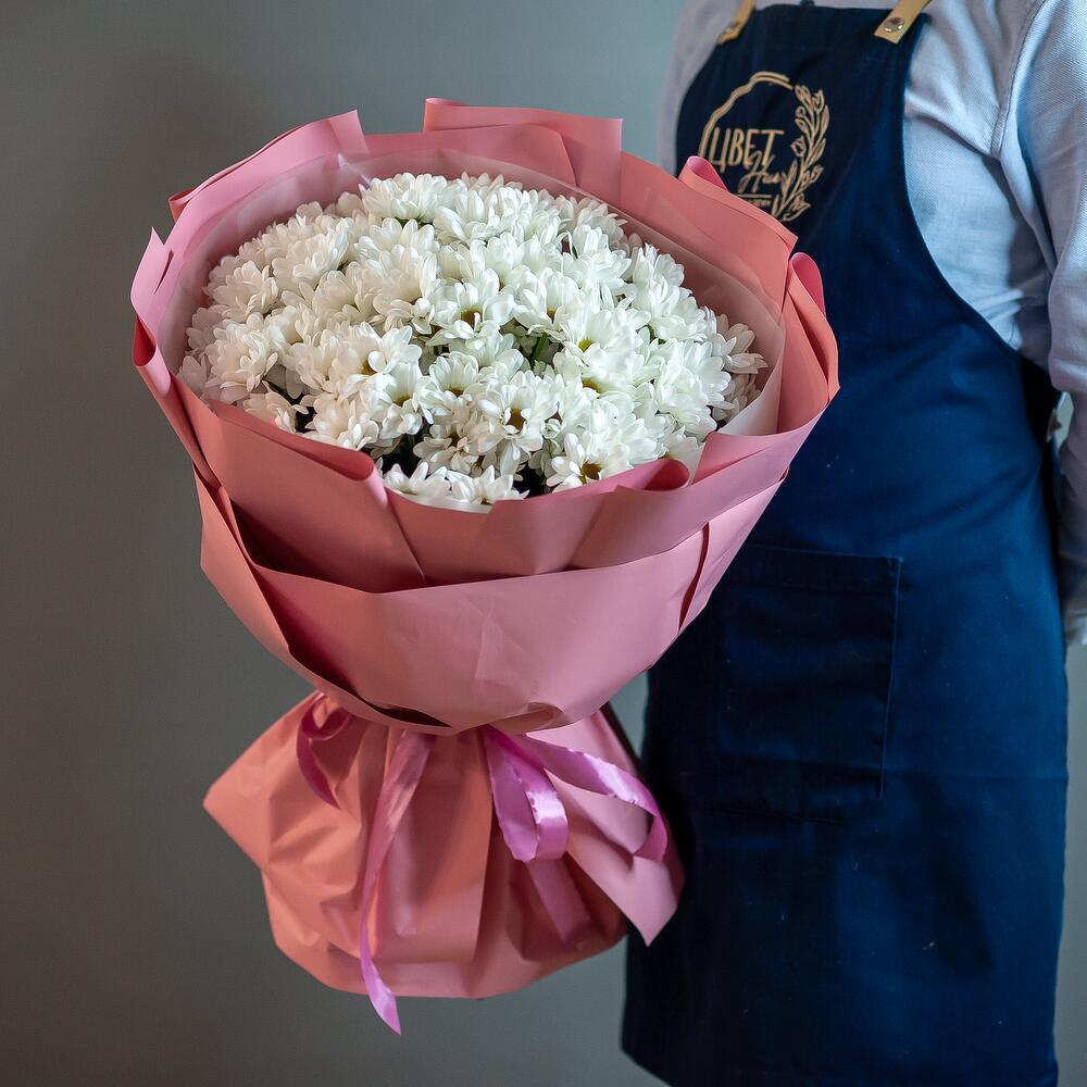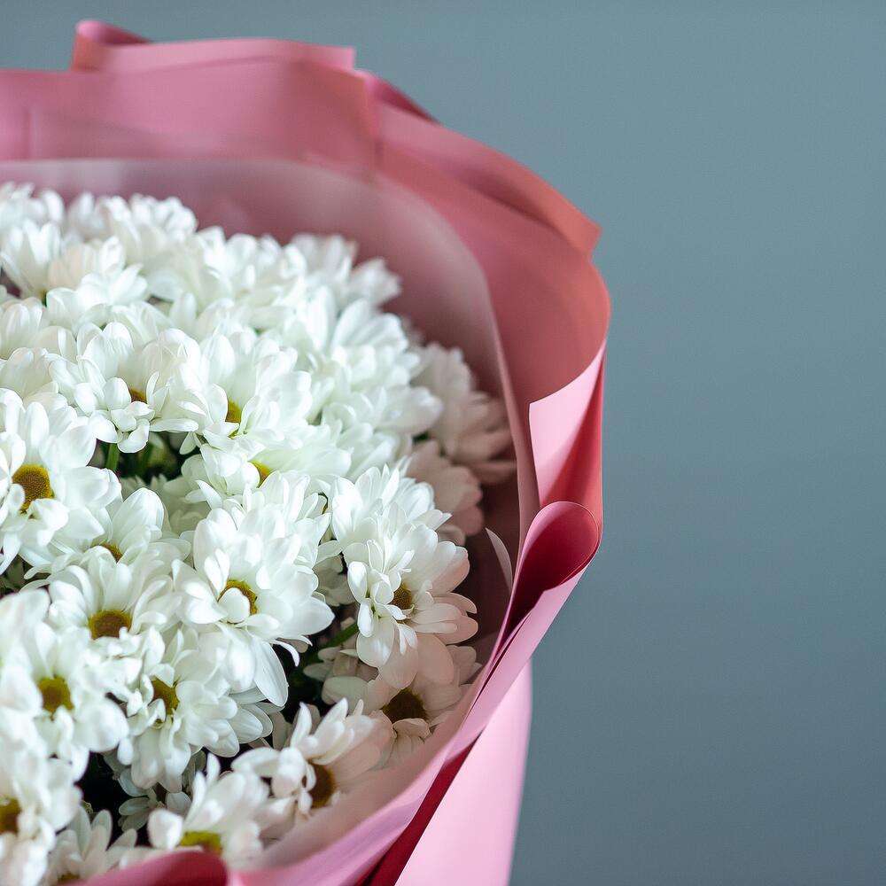 Этот нежный и утончённый букет из белоснежных хризантем дарит ощущение чистоты, свежести и искренности. Роскошные соцветия, собранные в пушистую композицию, будто облако, окутывают теплом и радостью. Оформленный в стильную матовую упаковку нежно-розового оттенка, букет выглядит элегантно и гармонично. Такой подарок станет символом преданности, уважения и искренних чувств, наполняя день радостью и улыбками.