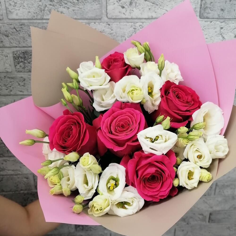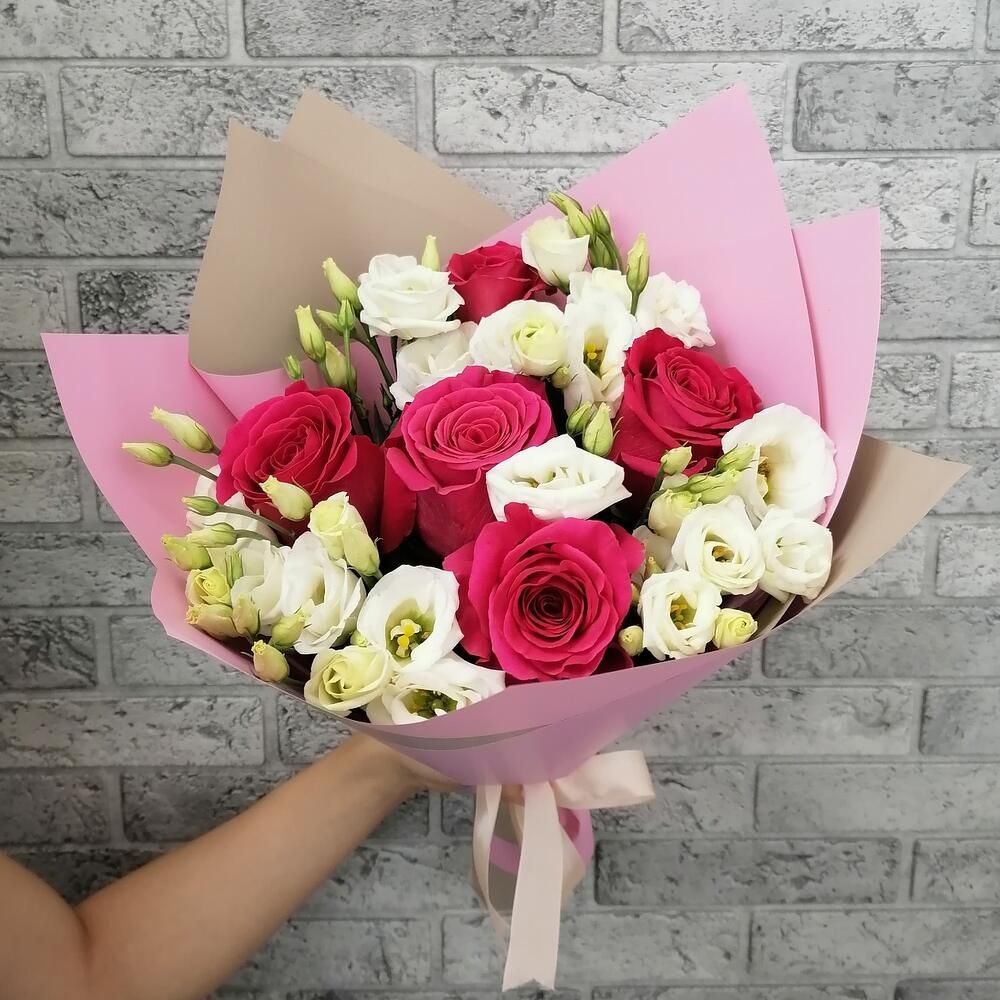 В составе букета: розы, лизиантус, дизайнерская упаковка.