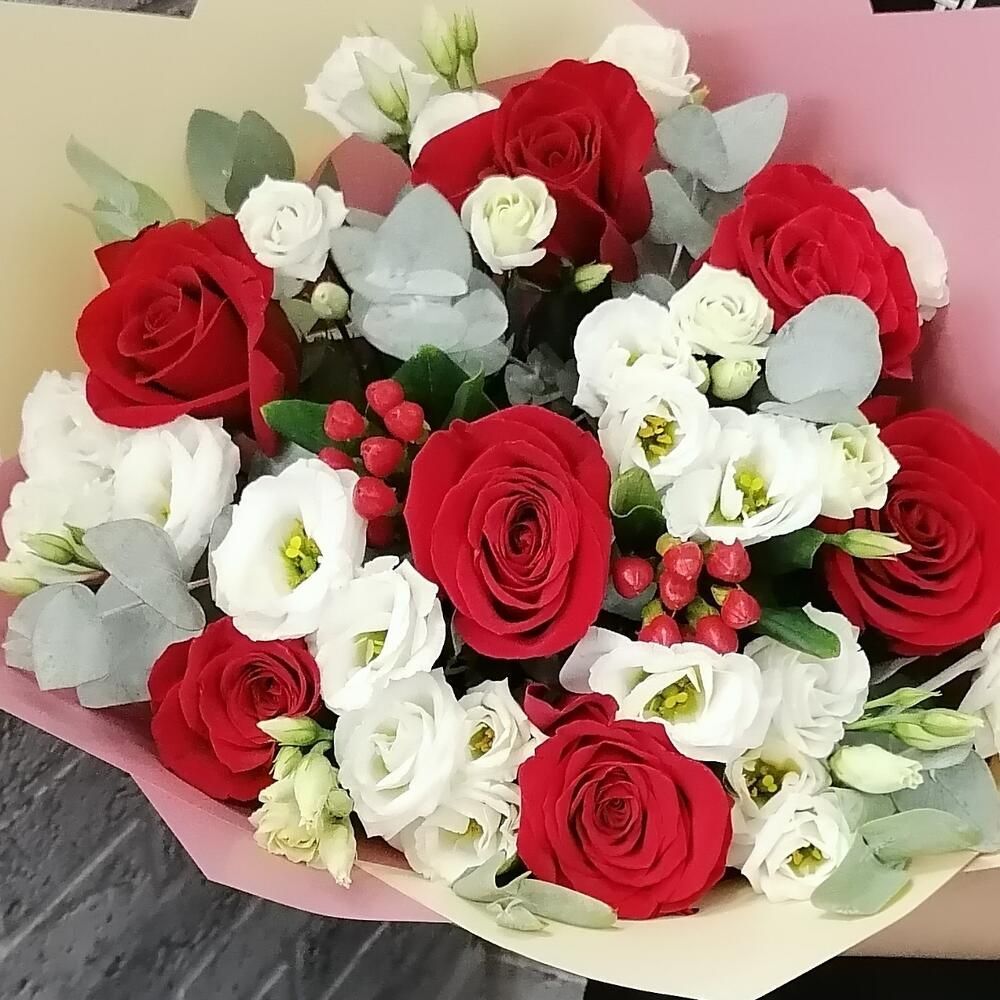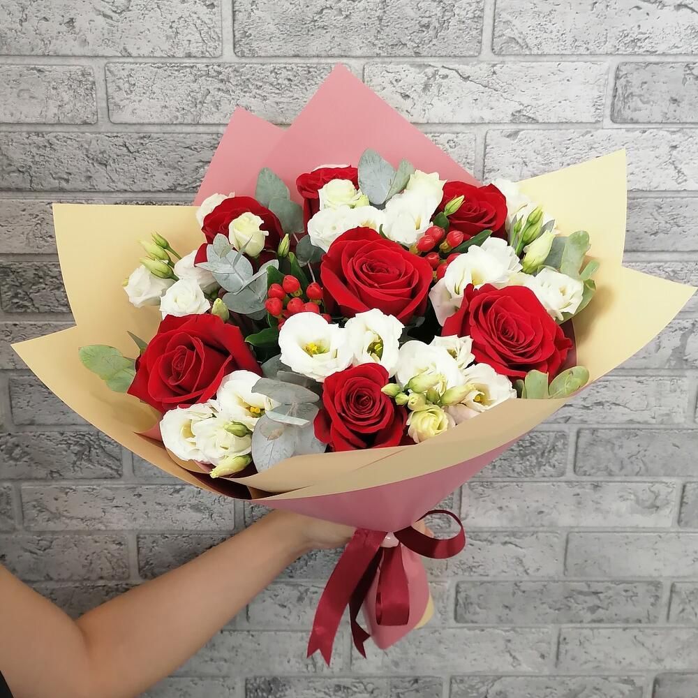 В составе букета: розы, лизиантус, гиперикум, эвкалипт, дизайнерская упаковка.
