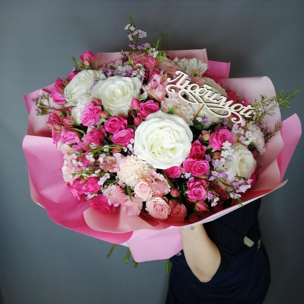 В составе букета: Роза одноголовая, диантус, хамелациум, альстромерия, роза кустовая, салал, упаковка, лента.