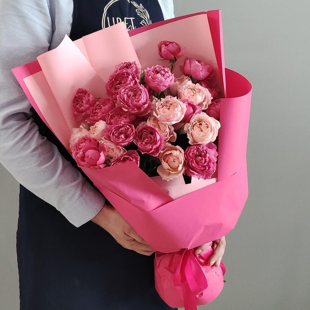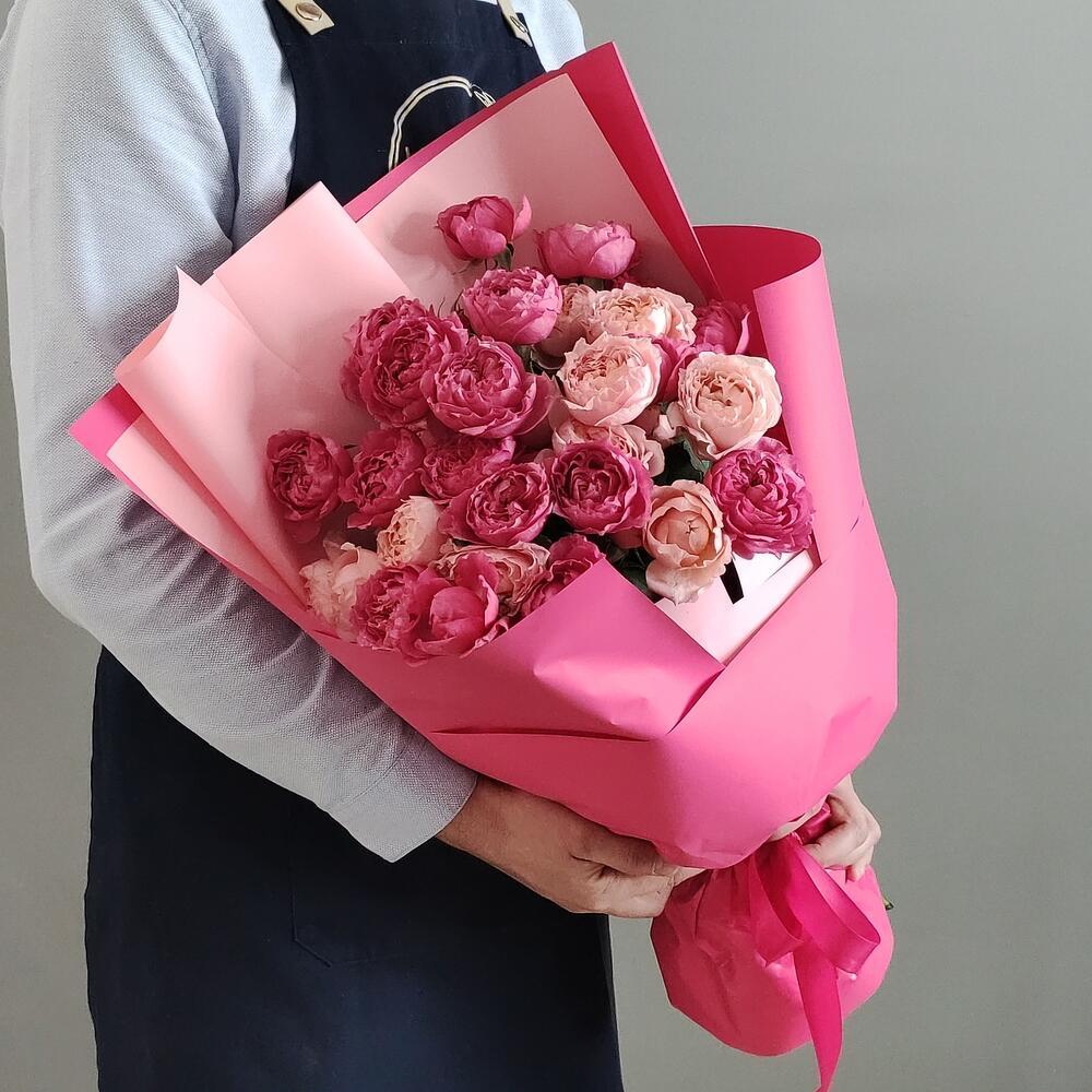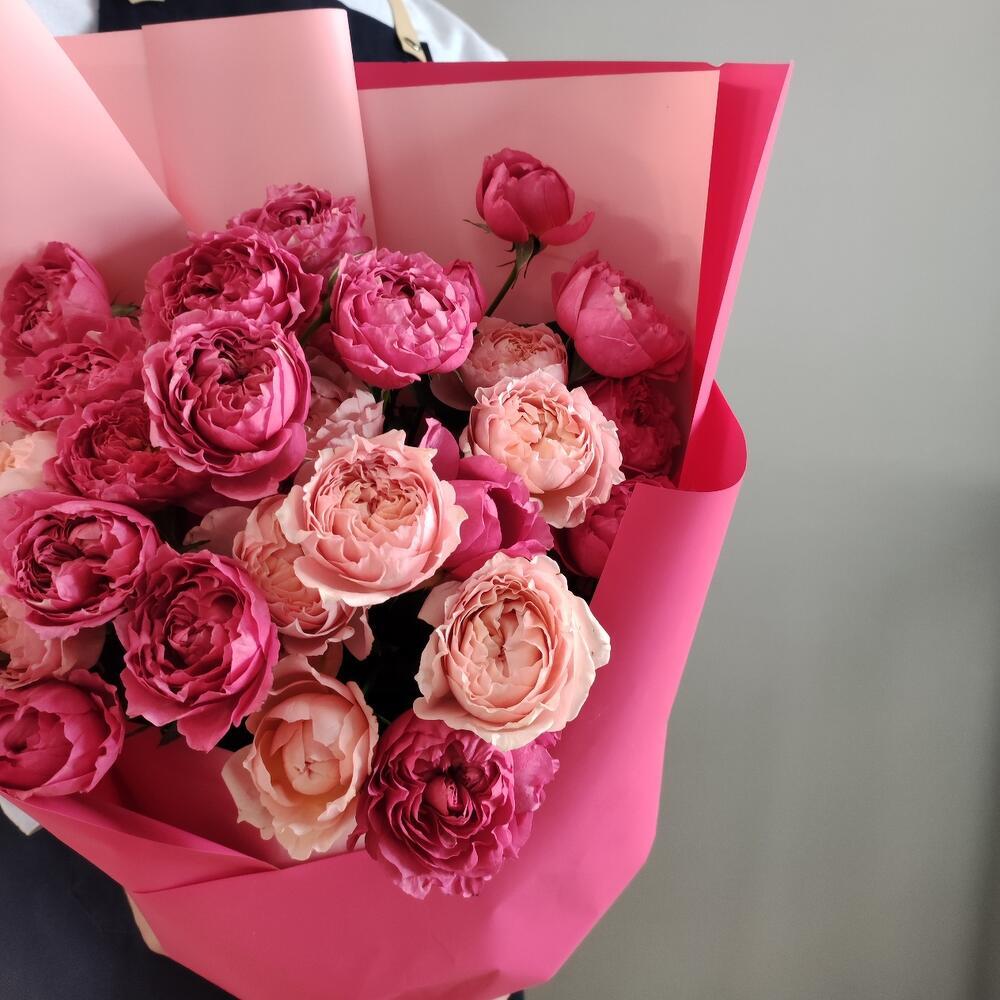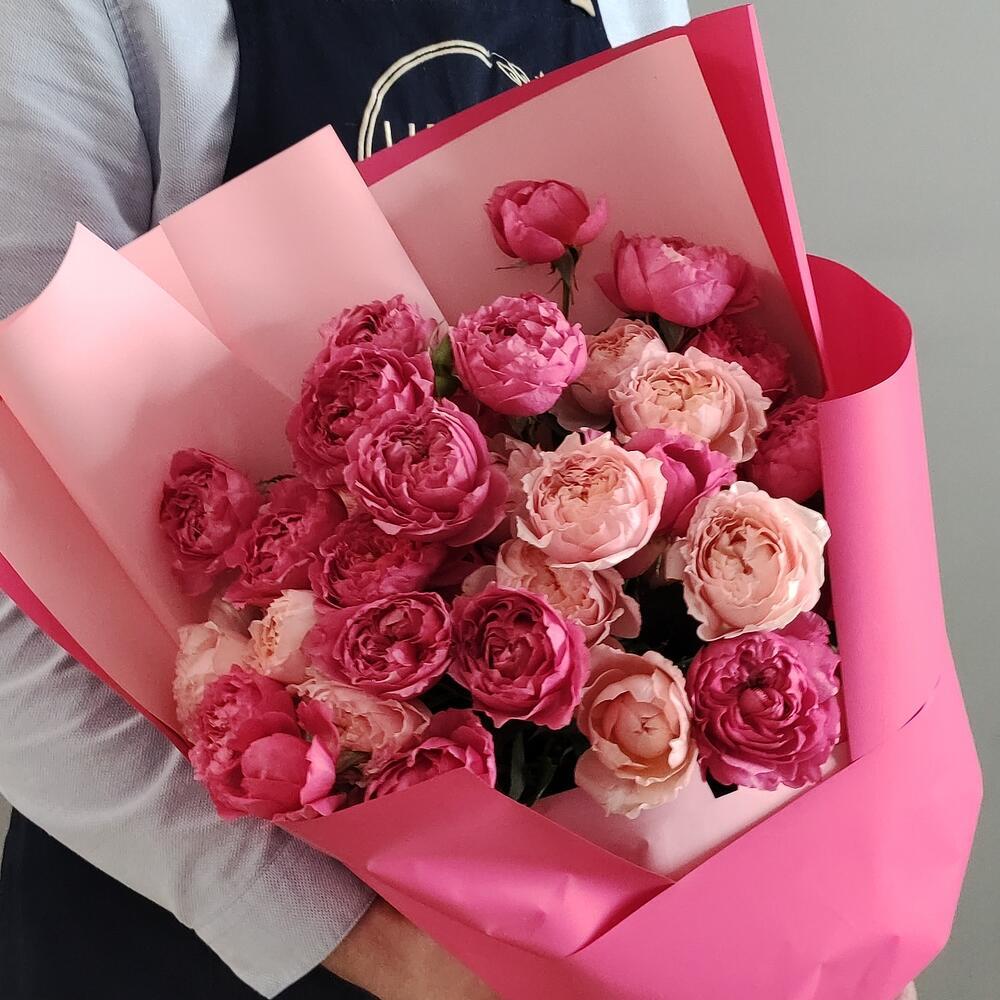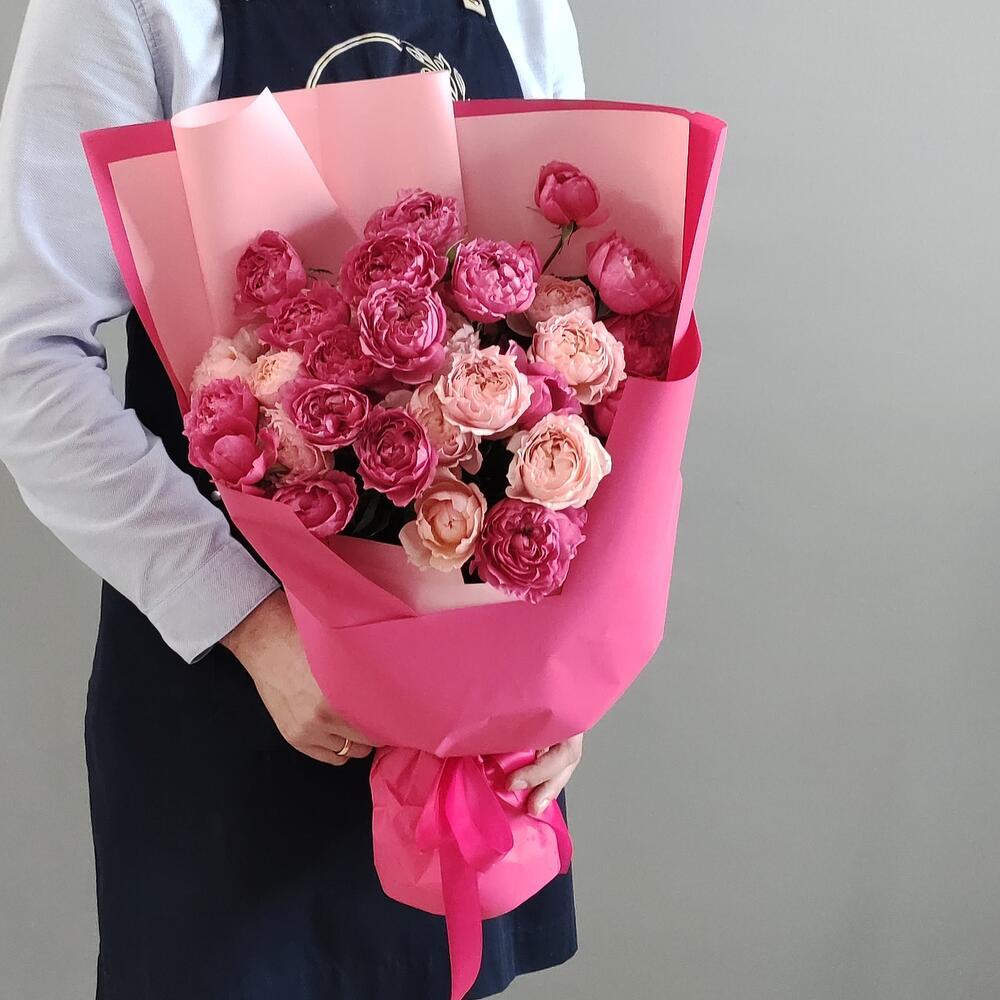 Букет из розовых и малиновых пионовидных кустовых роз в оформлении