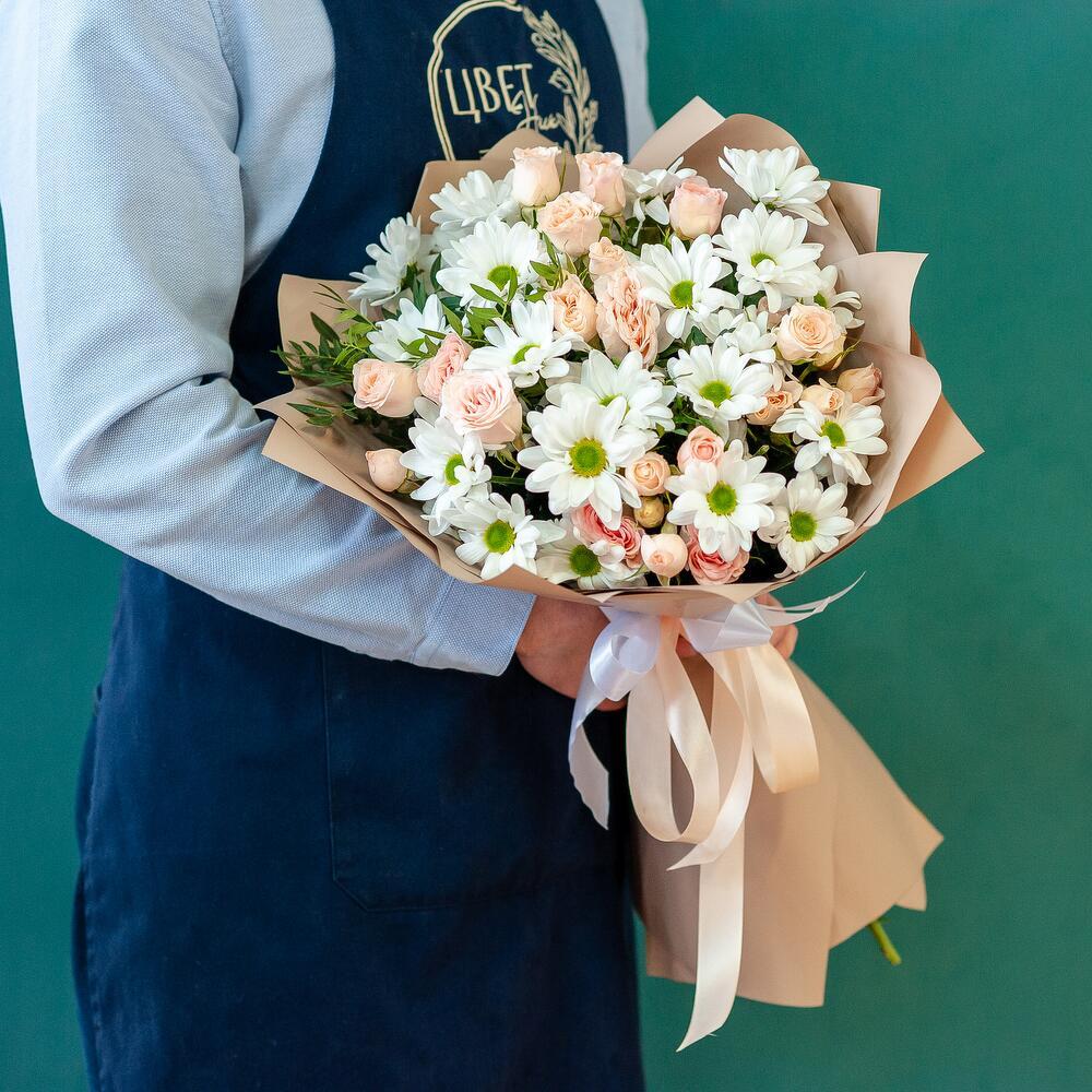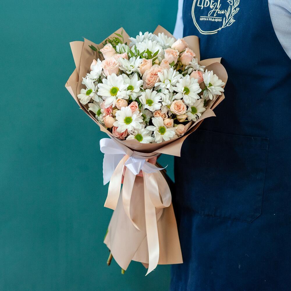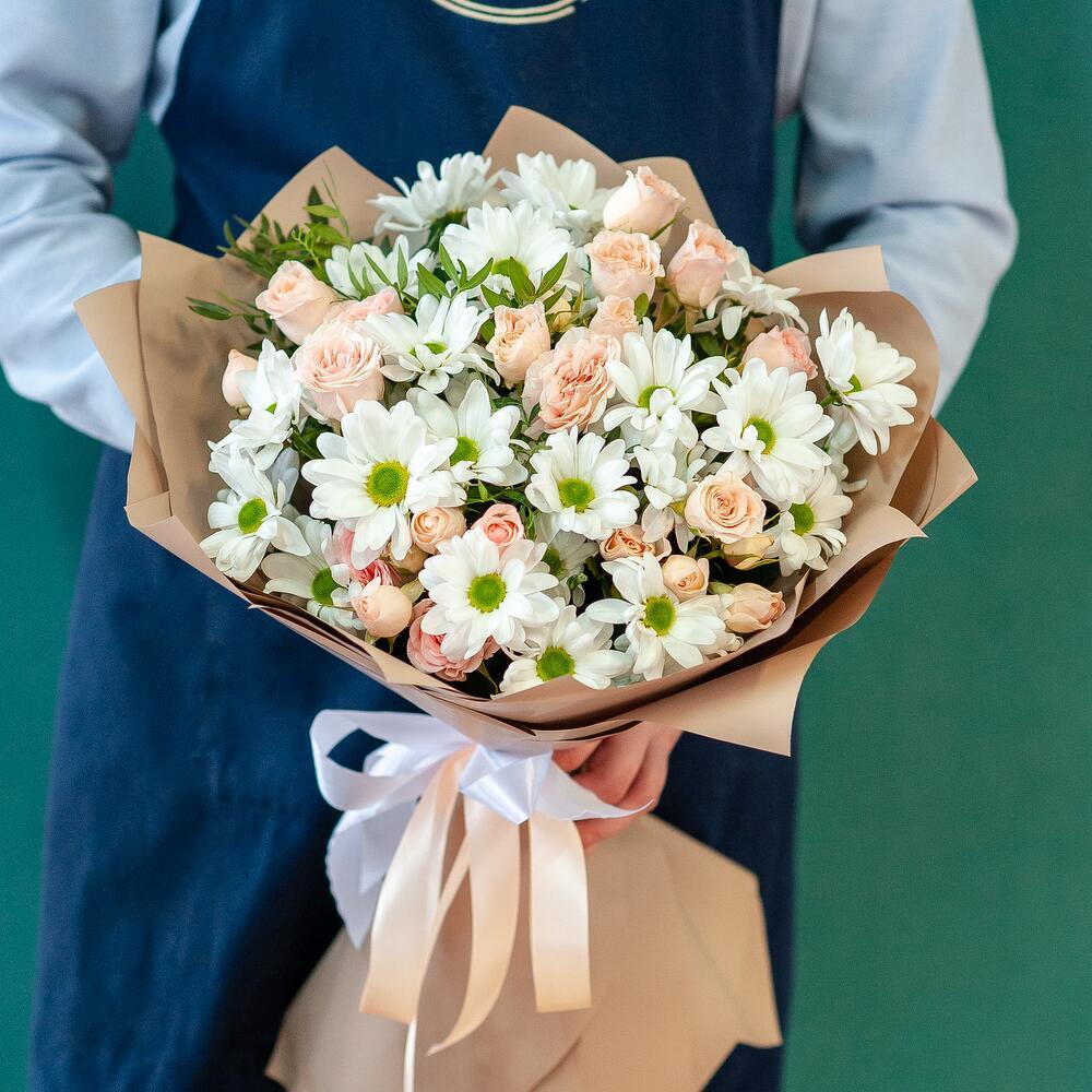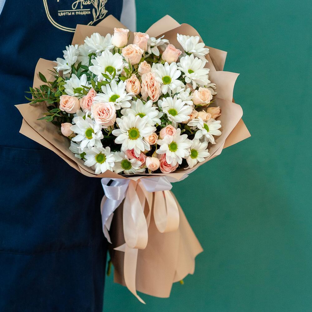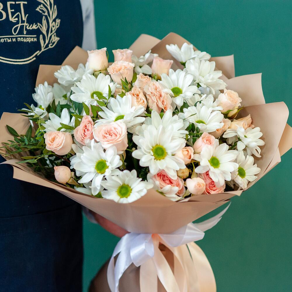 Очаровательный букет, который подарит тепло и радость вашим близким! Нежные белые хризантемы и изысканные кремовые розы создают гармоничное сочетание, символизирующее чистоту и искренность чувств. Букет оформлен в стильную крафтовую упаковку и перевязан красивой атласной лентой. Идеален для любого повода: дня рождения, годовщины, романтического свидания или просто как знак внимания. Доставка по Рязани Возможность добавить открытку с вашим пожеланием Только свежие цветы и профессиональная флористика Дарите красоту и эмоции вместе с нами!