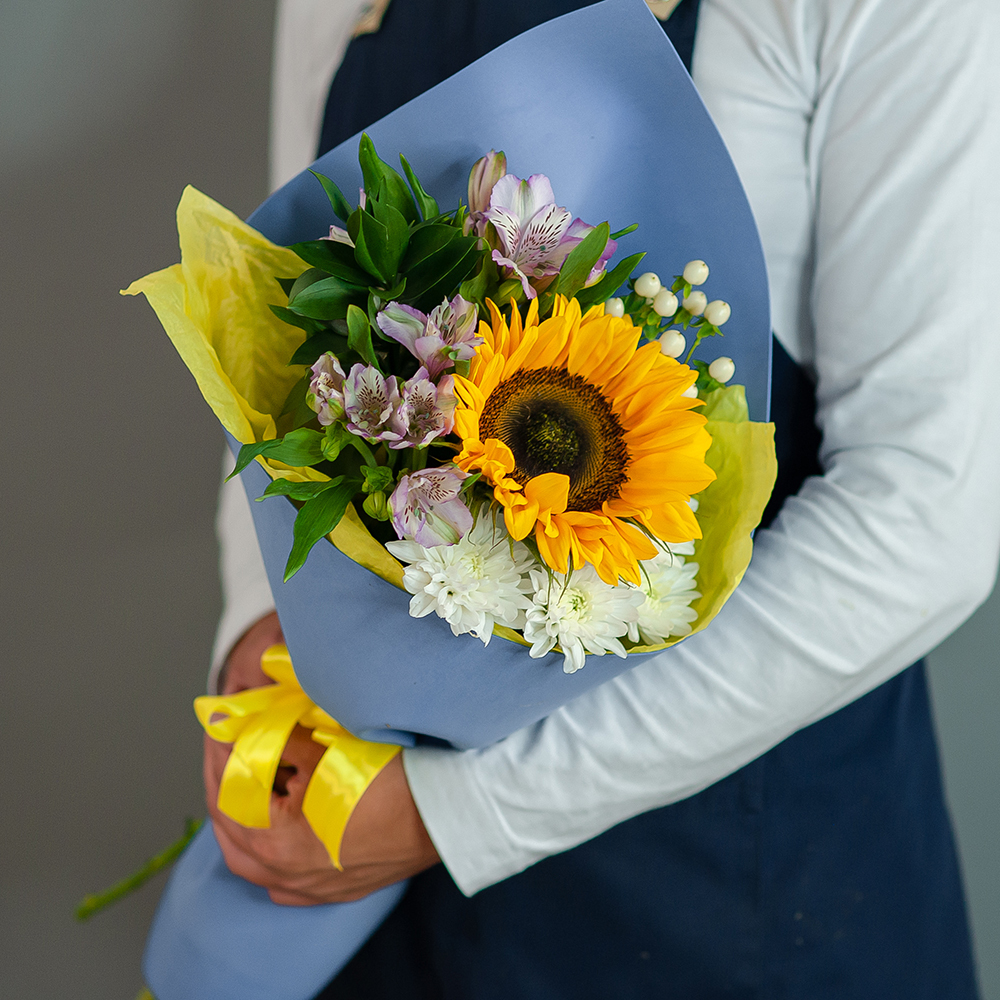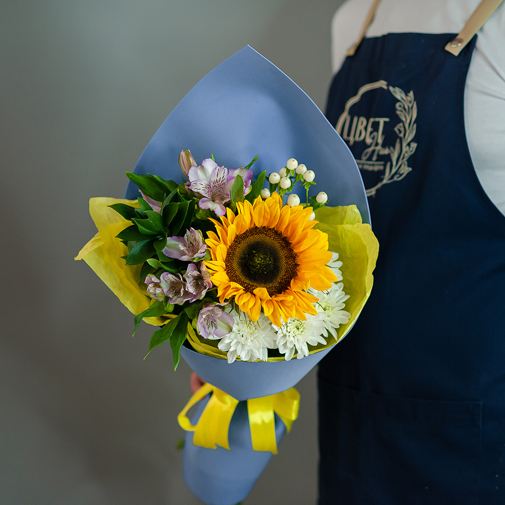 Подсолнух символизирует радость, счастье и тепло. Сочетание синего и жёлтого цветов добавляет букету оригинальности и яркости. Букет станет отличным подарком на любое торжество: от романтического свидания до корпоративного мероприятия. Он подарит получателю ощущение праздника и радости.