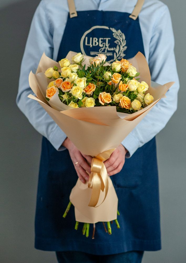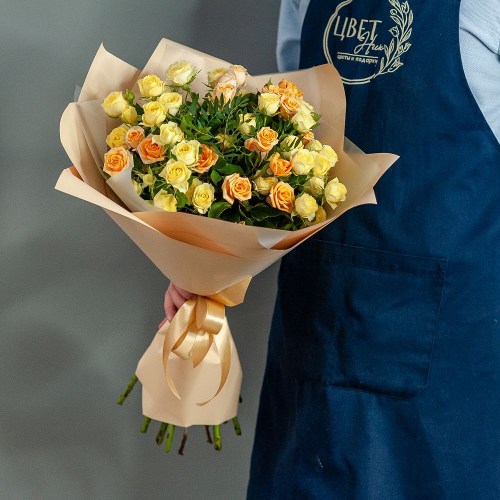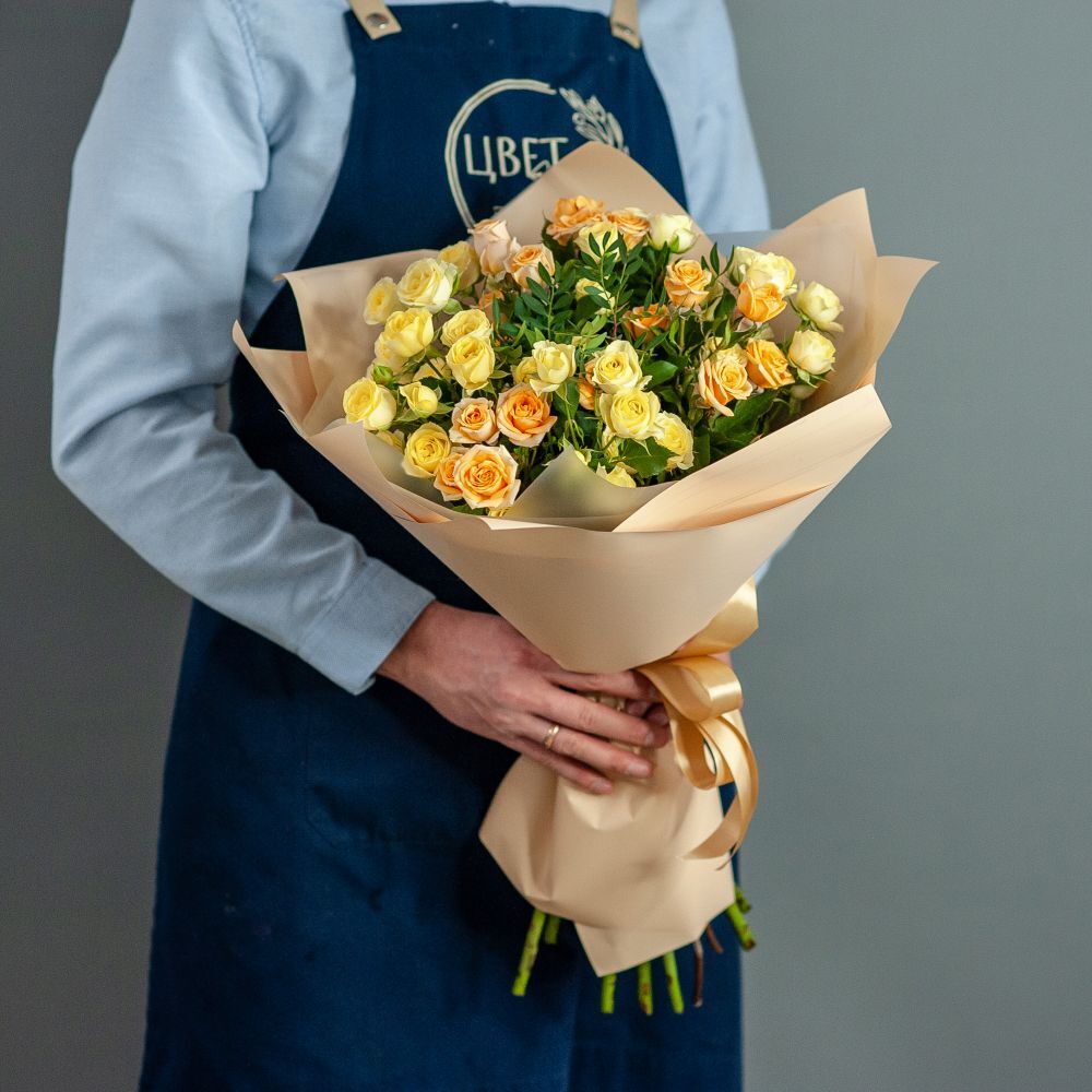 Букет солнечных кустовых роз — яркое и радостное решение для любого повода! Эти милые розы в сочетании с красивым оформлением добавят в ваше пространство тепло и положительные эмоции. Идеально подходит для подарка на день рождения, юбилей или просто так, чтобы поднять настроение близким. Подарите яркие эмоции с этим чудесным букетом! В составе букета на фото 9 веточек.