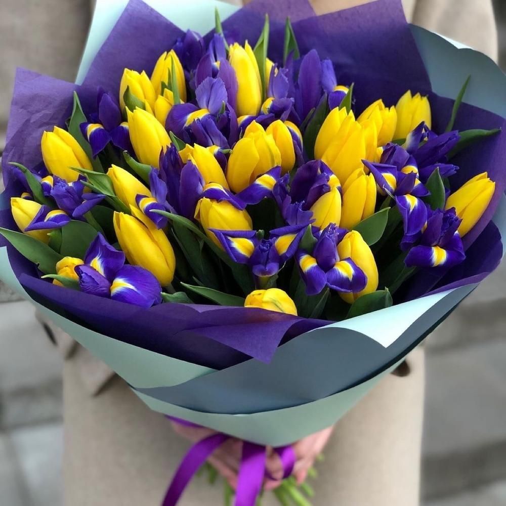 25 тюльпанов и 14 ирисов в крафте