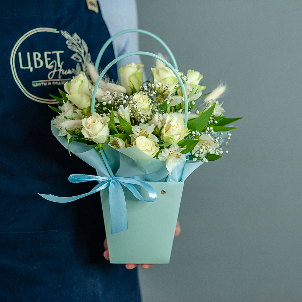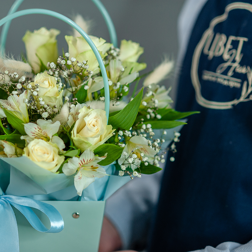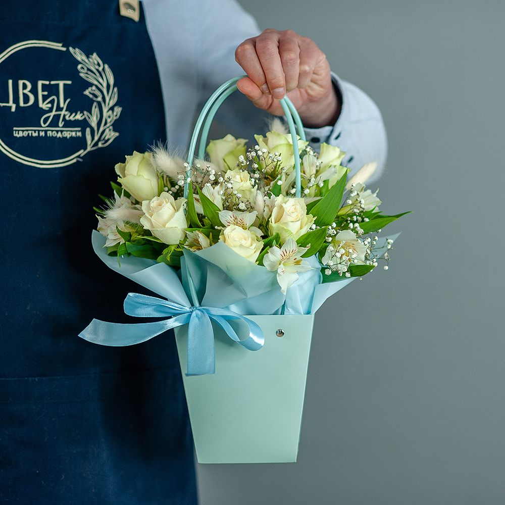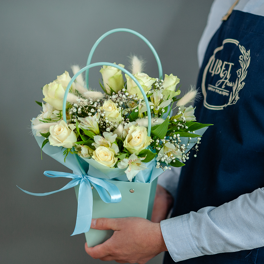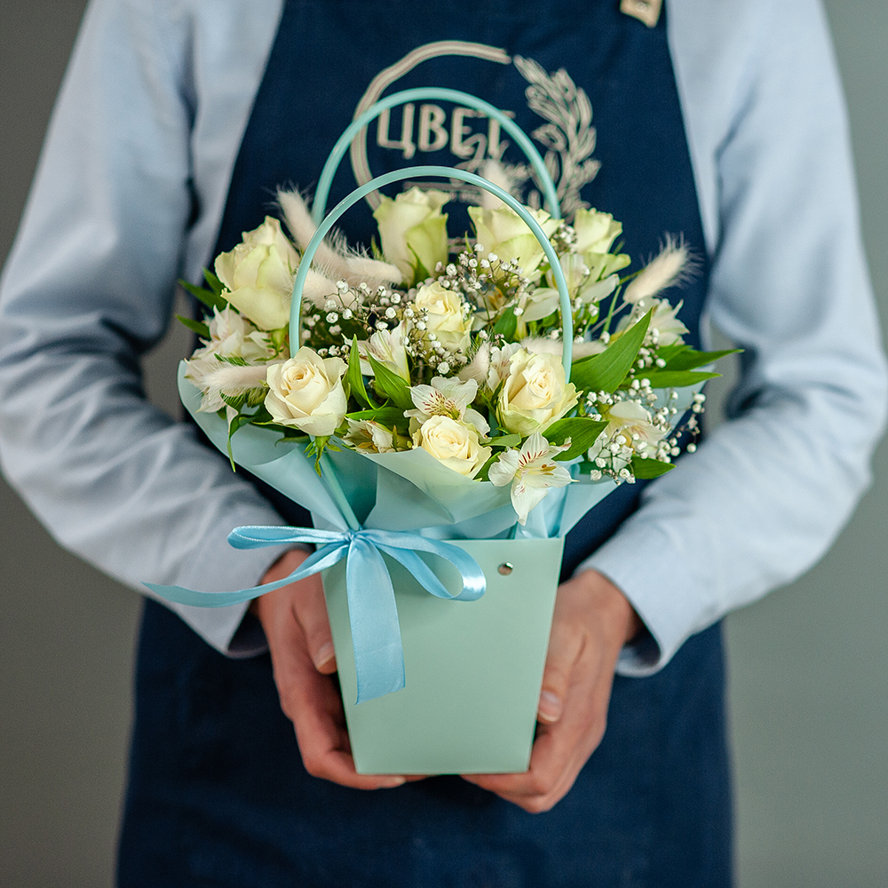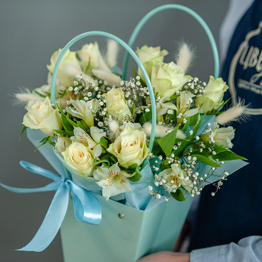 Композиция из кенийской розы в нежных тонах - это стильный и элегантный подарок, который подойдет для любого повода. Букет состоит из разнообразных цветов, включая кенийскую розу, альстромерию, гипсофилу и лагурус. Это создает уникальный и яркий образ, который будет радовать получателя своей свежестью и красотой. Особенностью композиции является использование оазиса, который позволяет цветам сохранять свежесть и красоту на протяжении длительного времени.