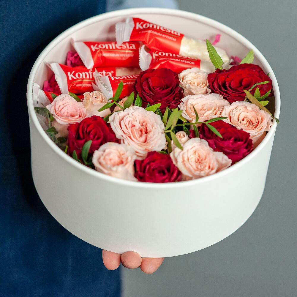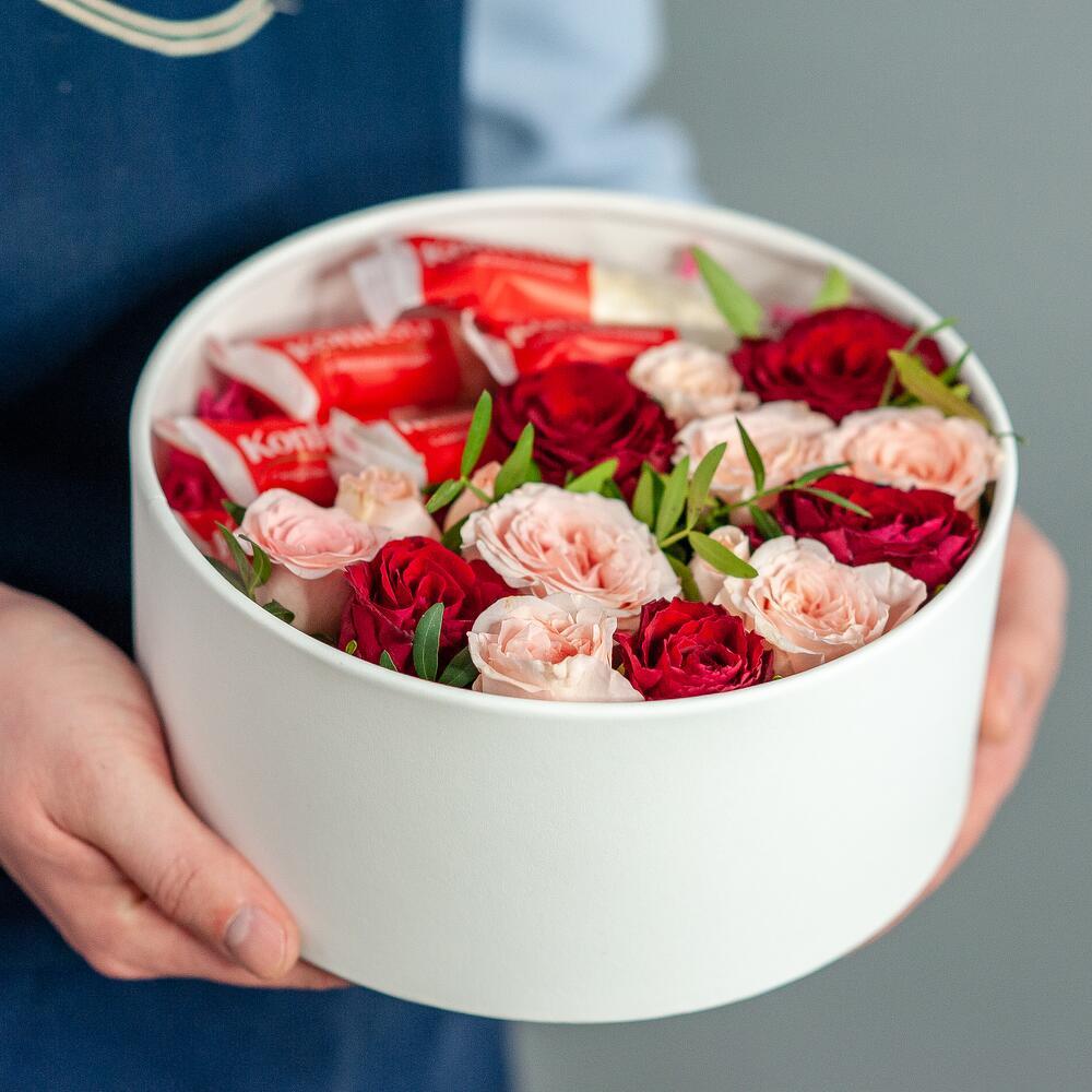 Цветы и конфеты, собранные в одной коробочке, дополненные личным посланием. Идеальный вариант для поздравления