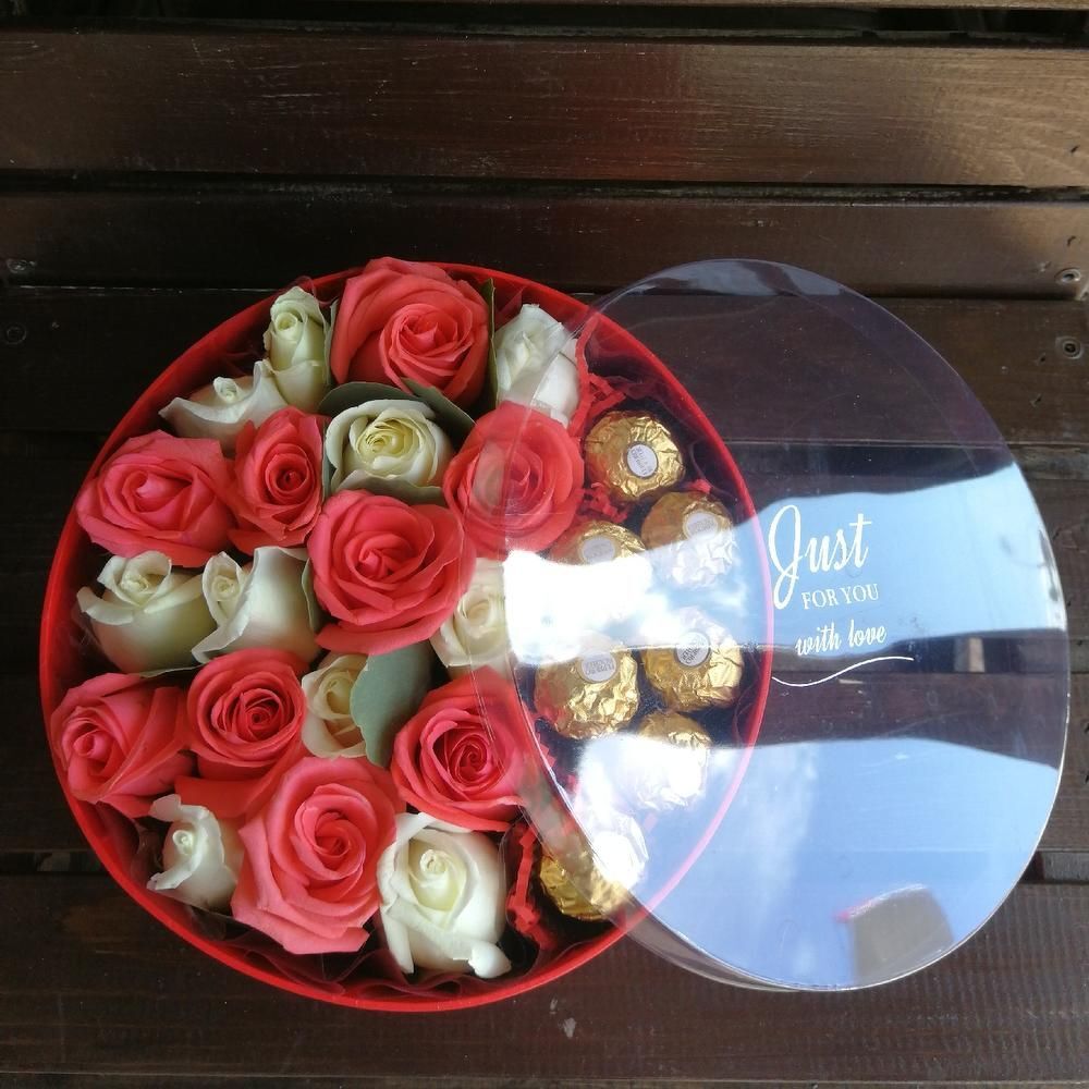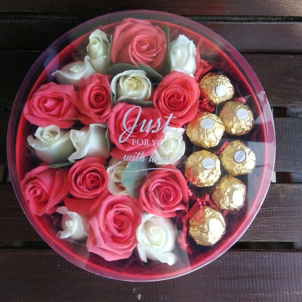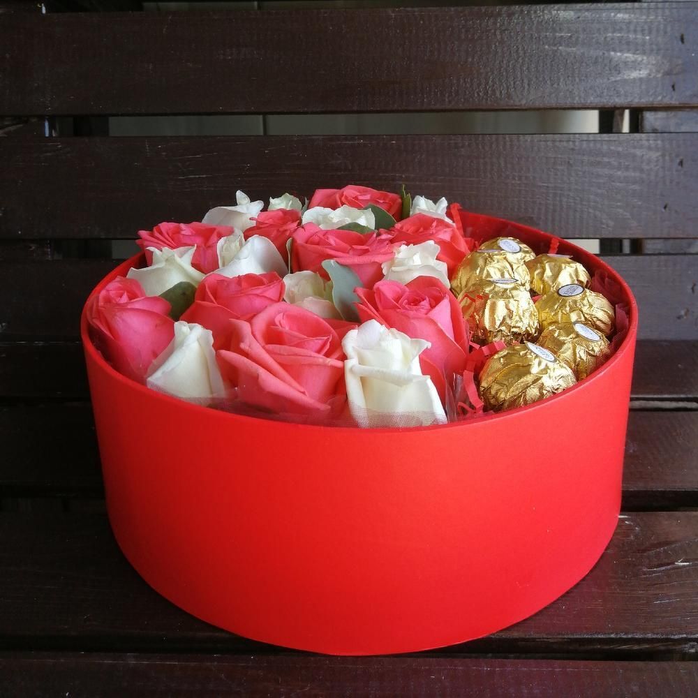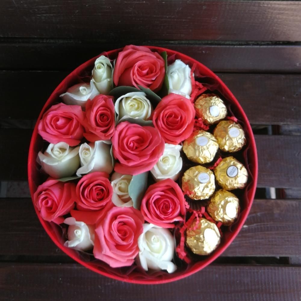 Подарочная коробка с живыми свежими цветами и вкусными конфетами будет оригинальным знаком внимания! Возможно исполнение с другим наполнением