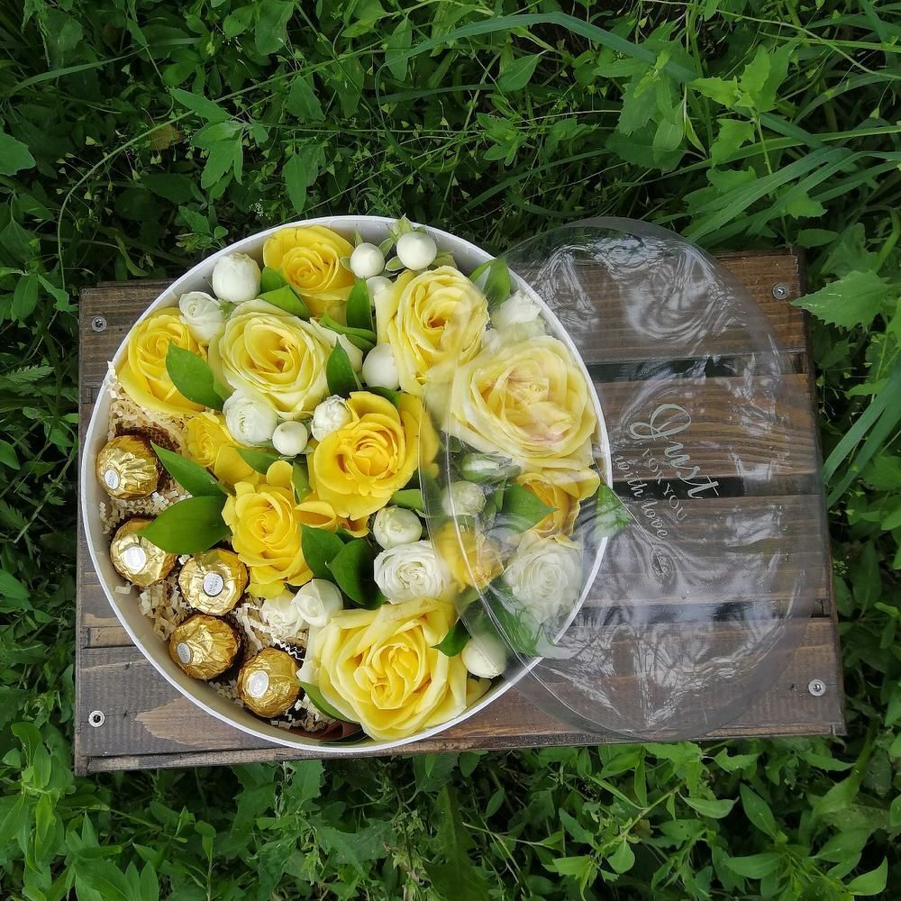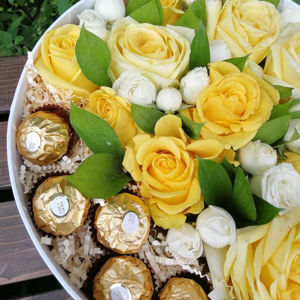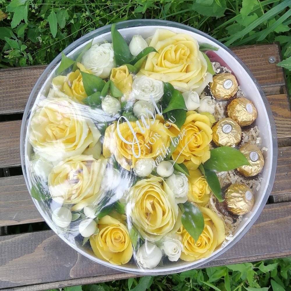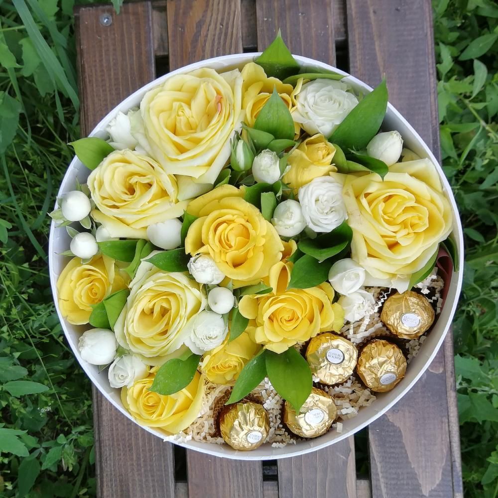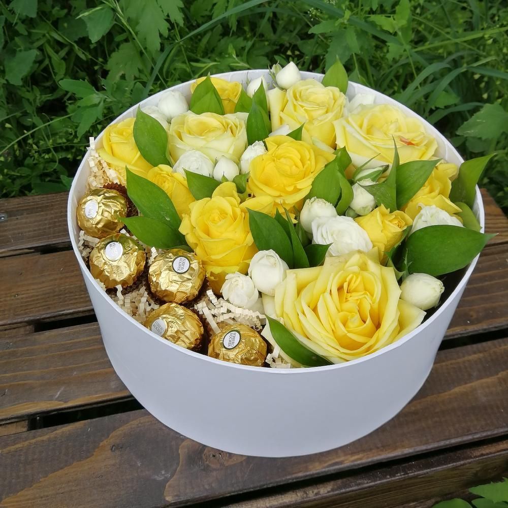 Подарочная коробка с живыми свежими цветами и вкусными конфетами будет оригинальным знаком внимания! Возможно исполнение с другим наполнением