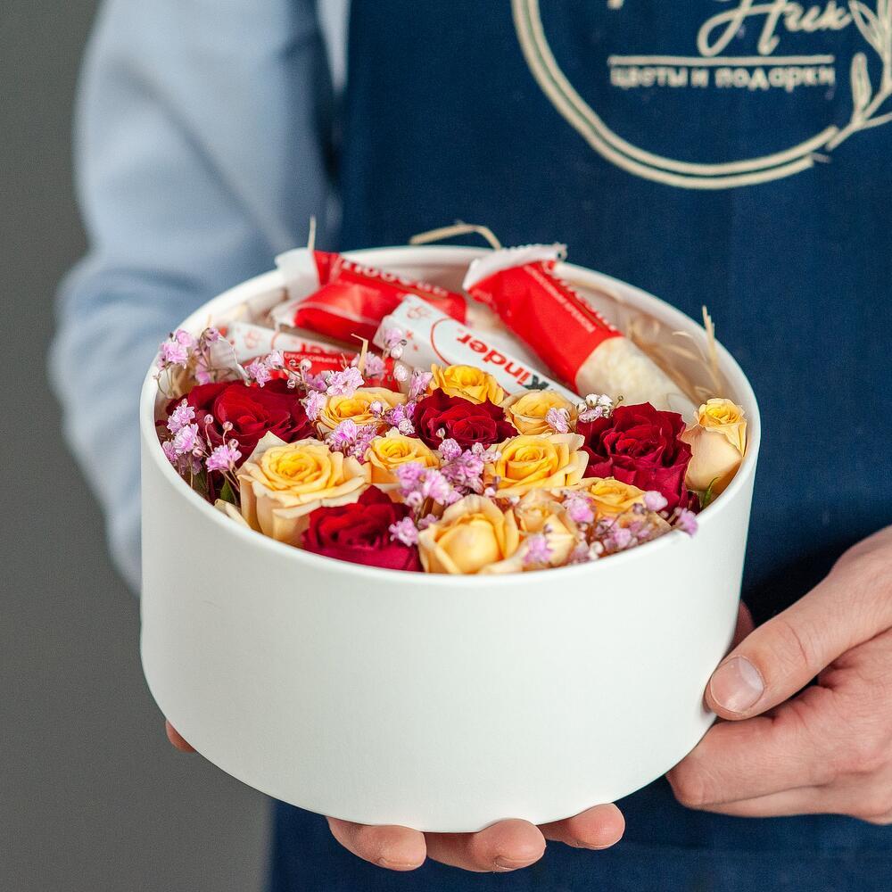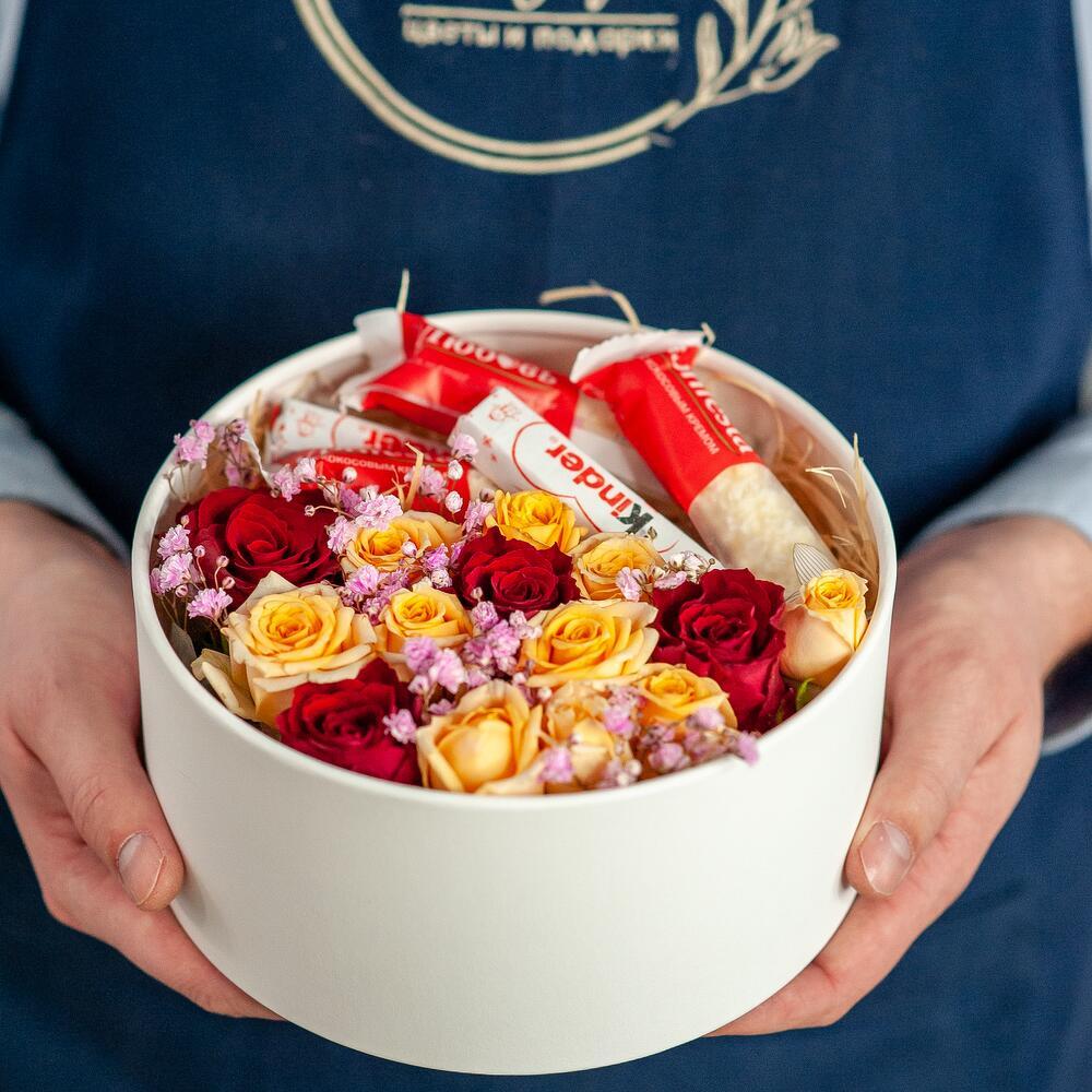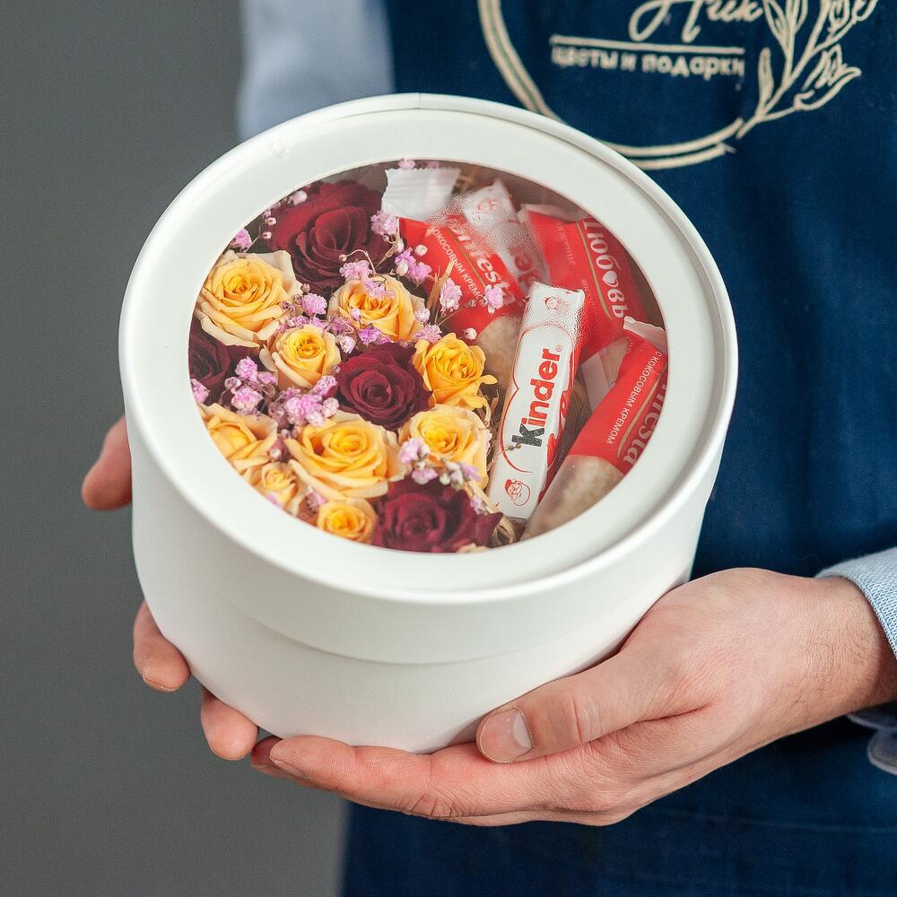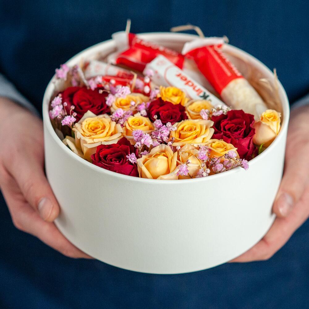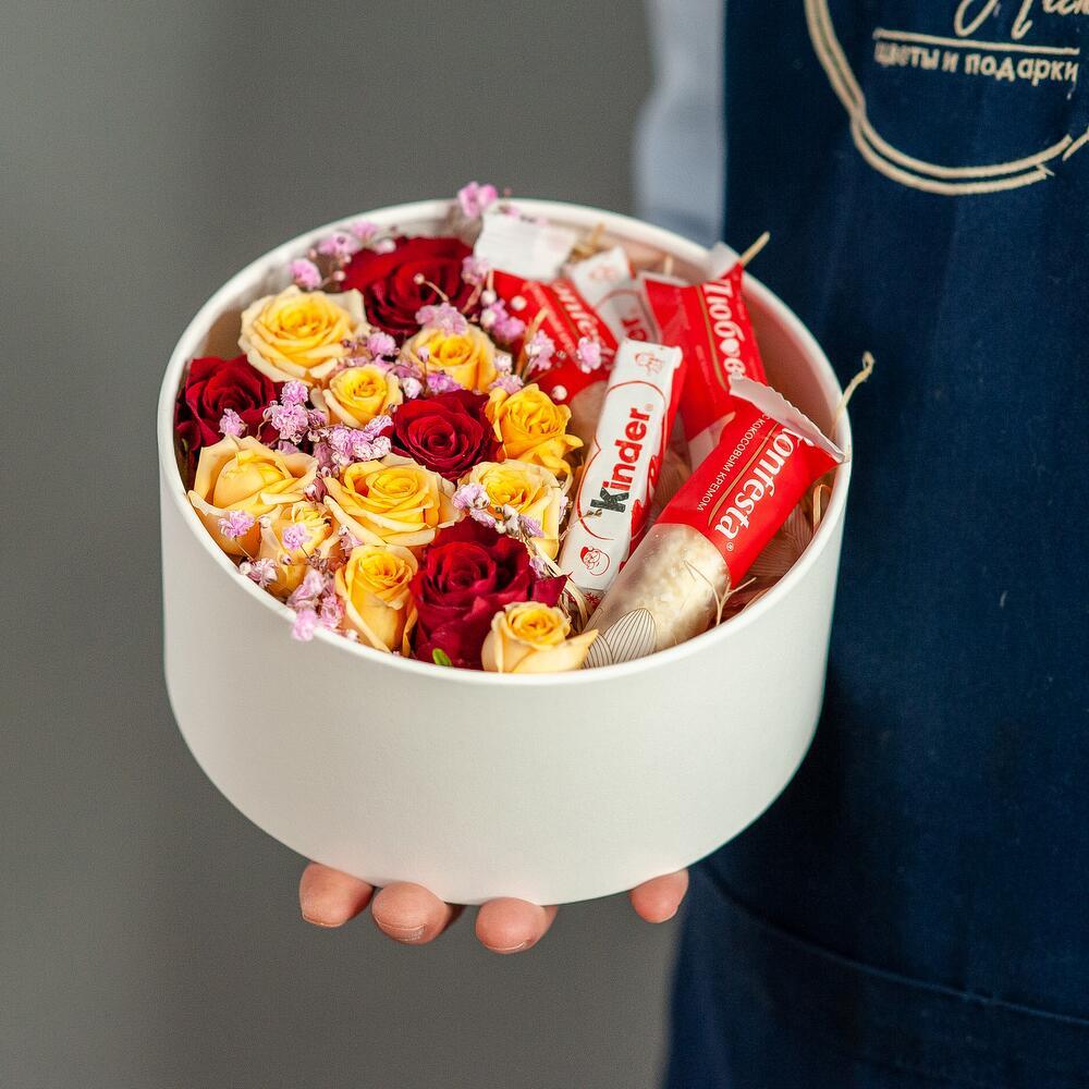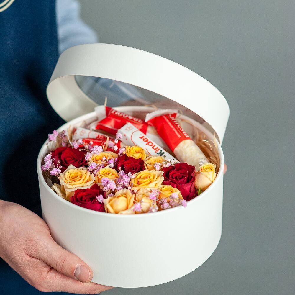 Цветы и конфеты, собранные в одной коробочке, дополненные личным посланием. Идеальный вариант для поздравления
