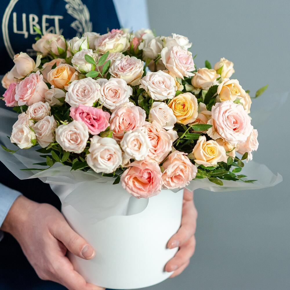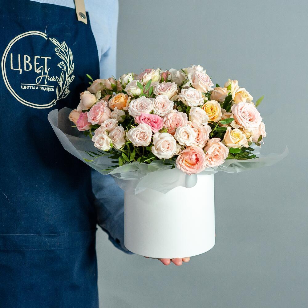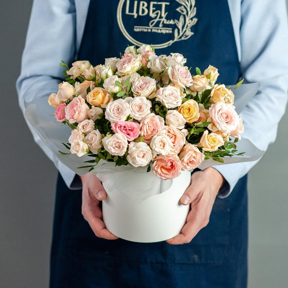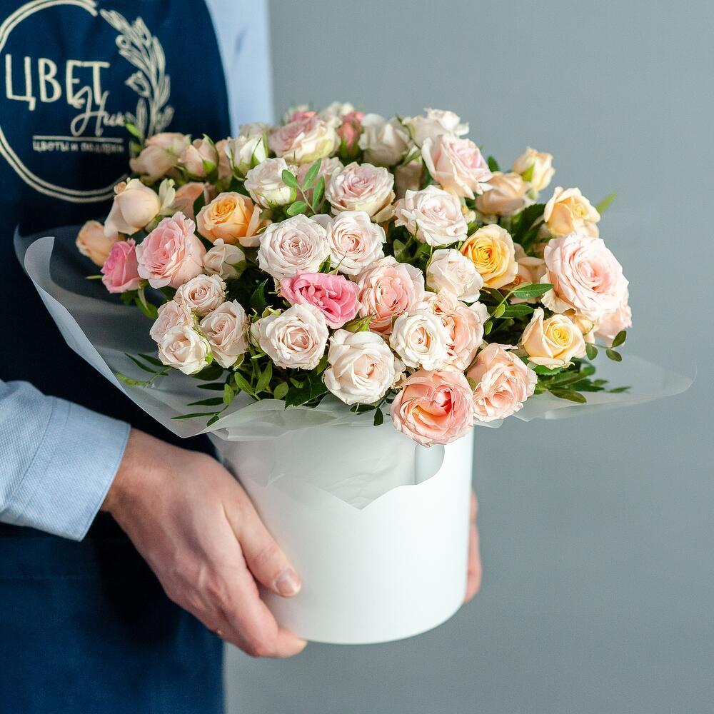 Букет кустовых роз в шляпной коробке Очаровательная композиция из нежных кустовых роз в пастельных тонах — идеальный подарок для любого случая! Воздушные бутоны кремовых, розовых и персиковых оттенков создают атмосферу утончённости и романтики, а стильное оформление в элегантной шляпной коробке обеспечивает удобство и сохранность букета. Состав: свежие кустовые розы, декоративная зелень, стильная упаковка Доставка: по городу Рязань Повод: день рождения, годовщина, признание в чувствах или просто без повода! Дарите улыбки и делитесь тёплыми эмоциями вместе с нашими цветами! Цвет коробки и оттенки роз могут отличаться