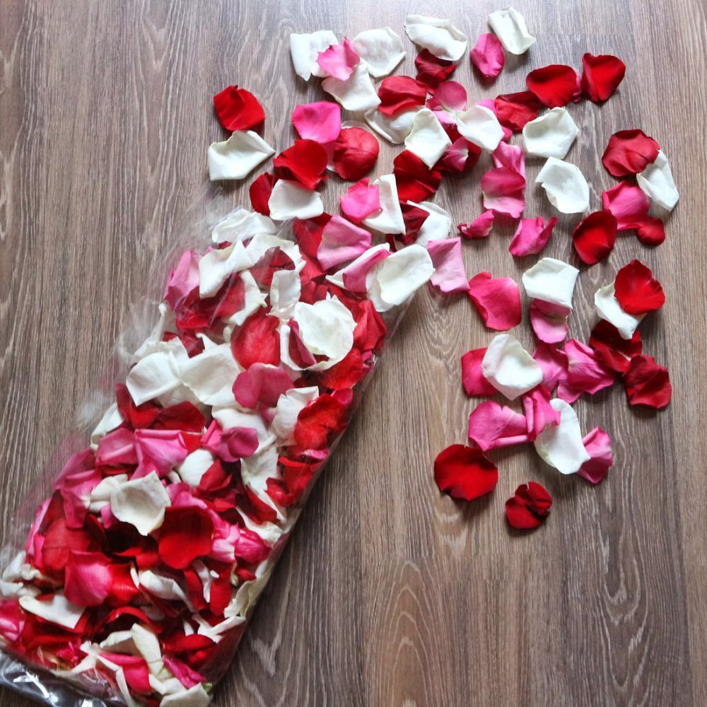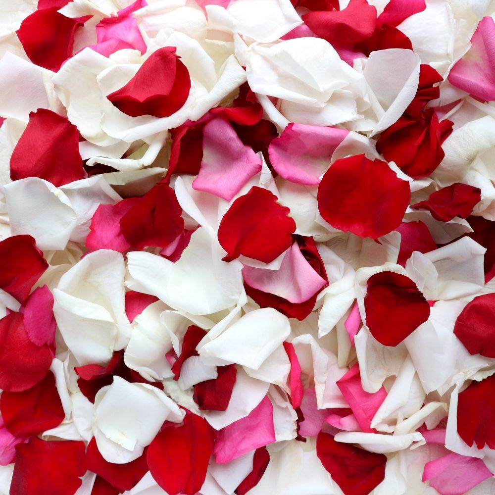 Свежие лепестки белых, розовых и красных роз для праздника или оформления мероприятий.