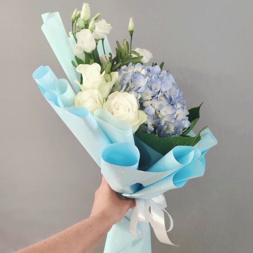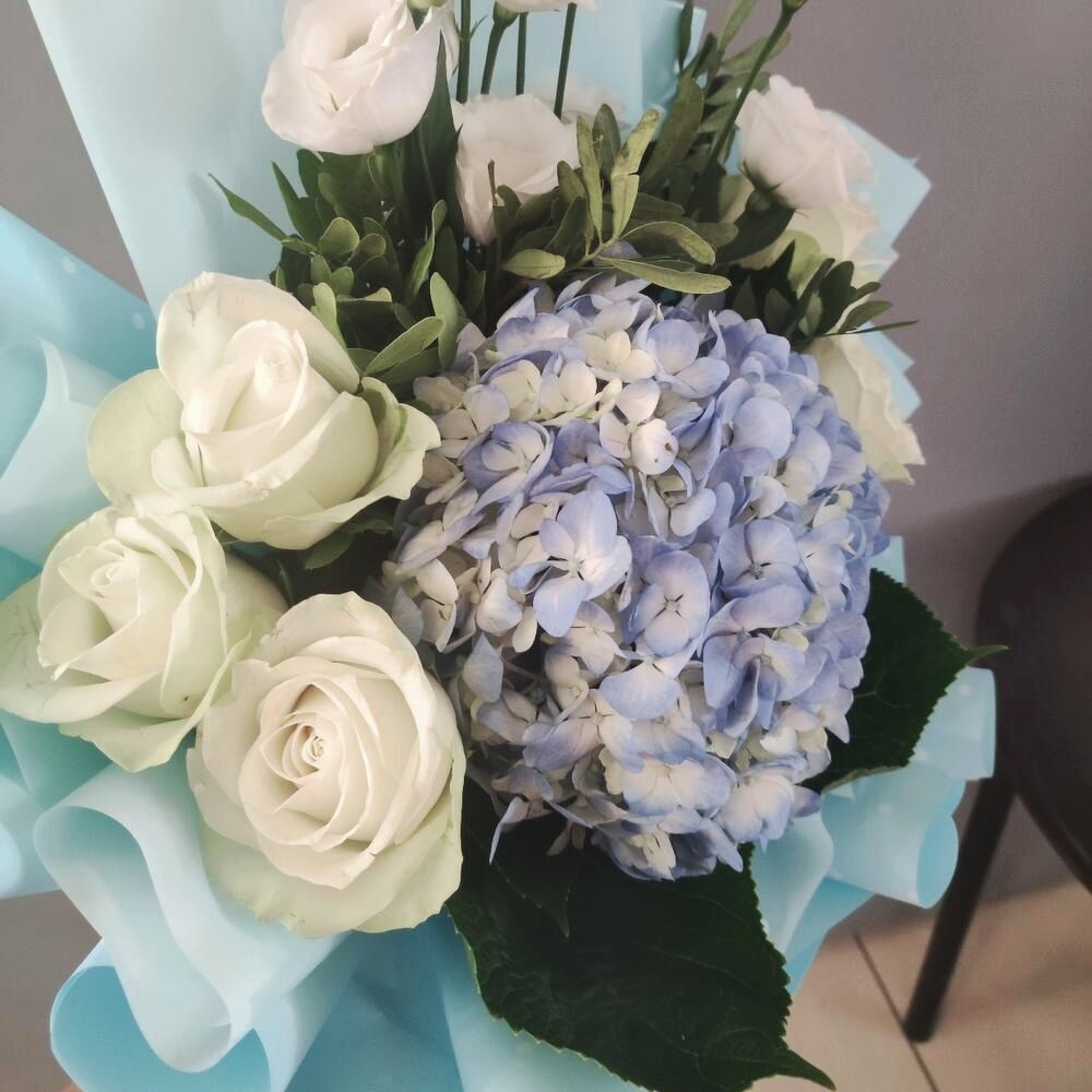 Нежный букет с шикарной пышной голубой гортензией в сочетании с воздушной эустомой и эквадорской одноголовой розой.
