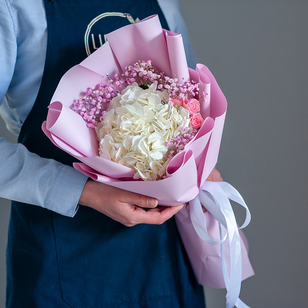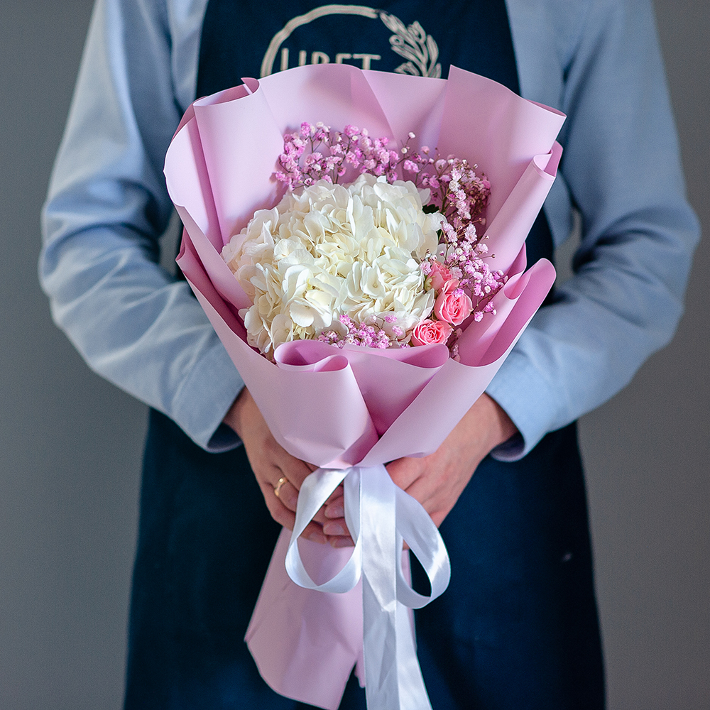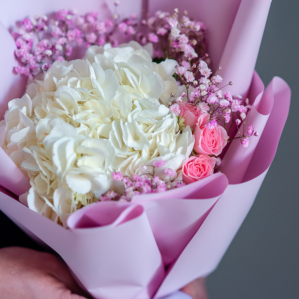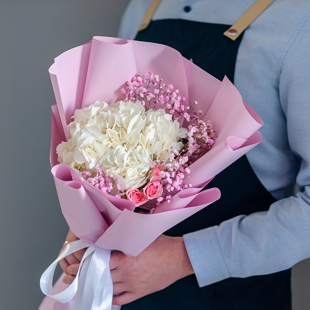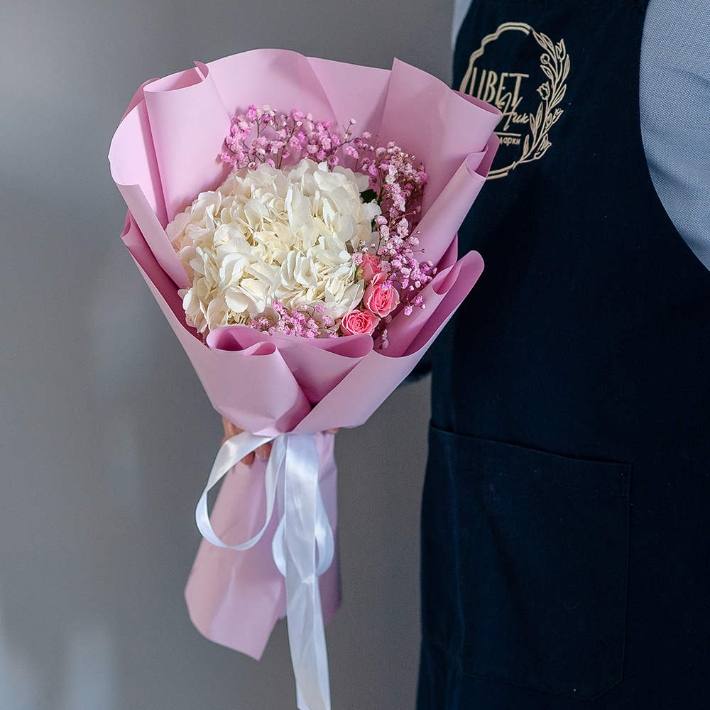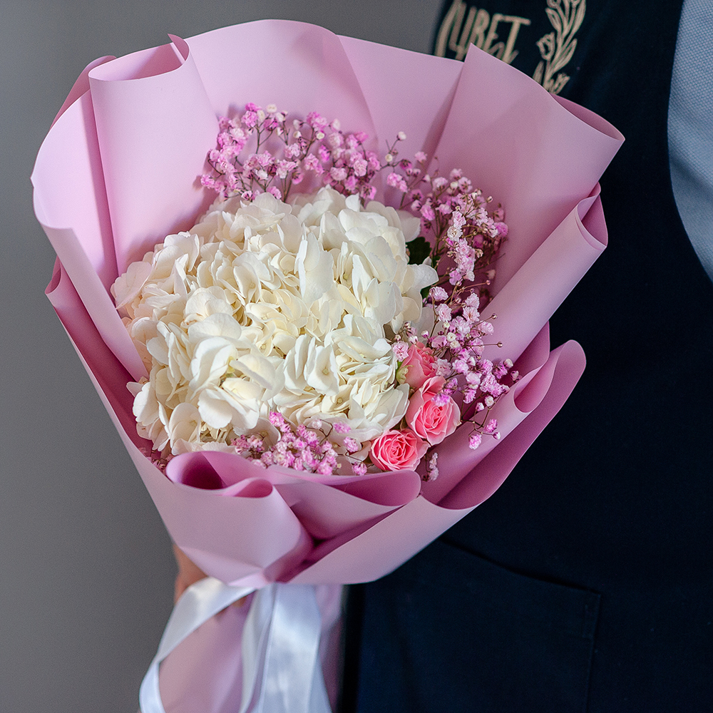 Нежность в каждом лепестке! Этот восхитительный букет из белоснежной гортензии, розовых роз и воздушной гипсофилы покорит сердце с первого взгляда! Нежное сочетание оттенков в стильной упаковке делает его идеальным подарком для особых моментов. Порадуйте любимых красотой и элегантностью – закажите букет в сети магазинов "Цветник" прямо сейчас!