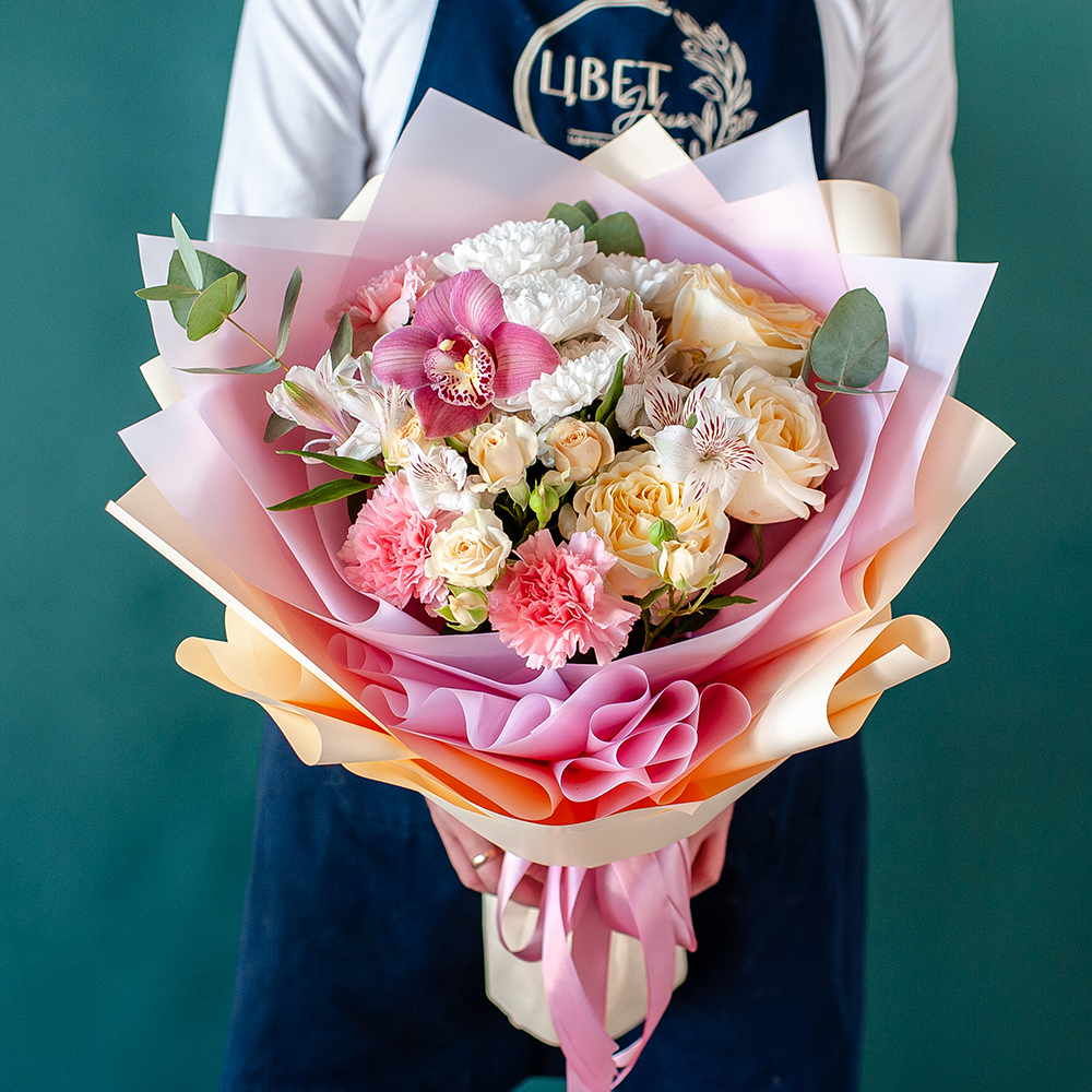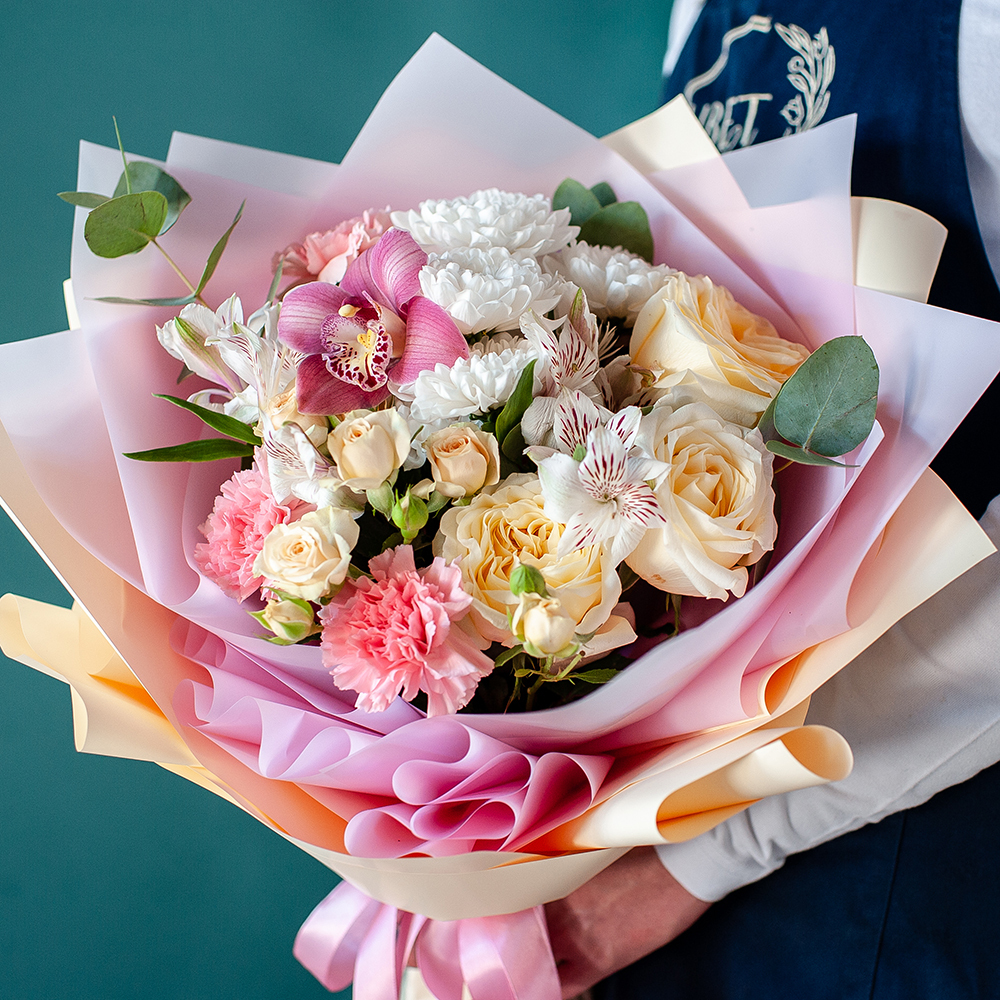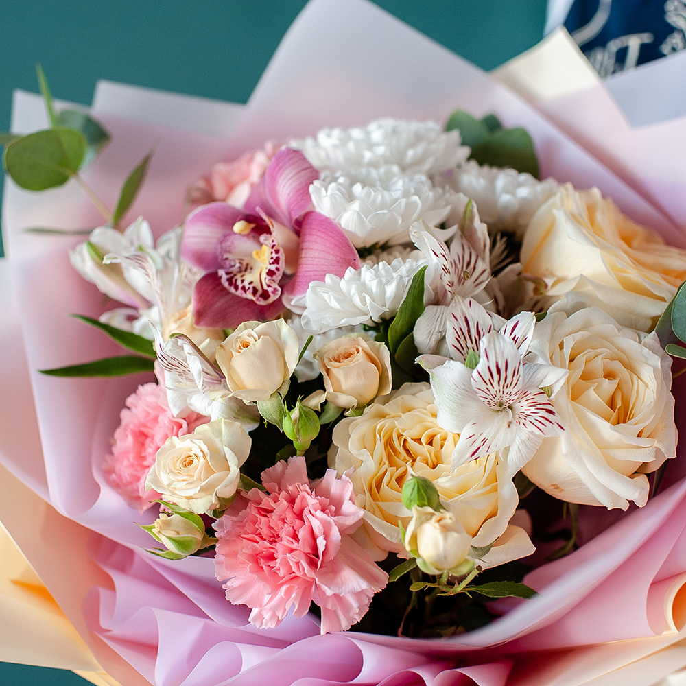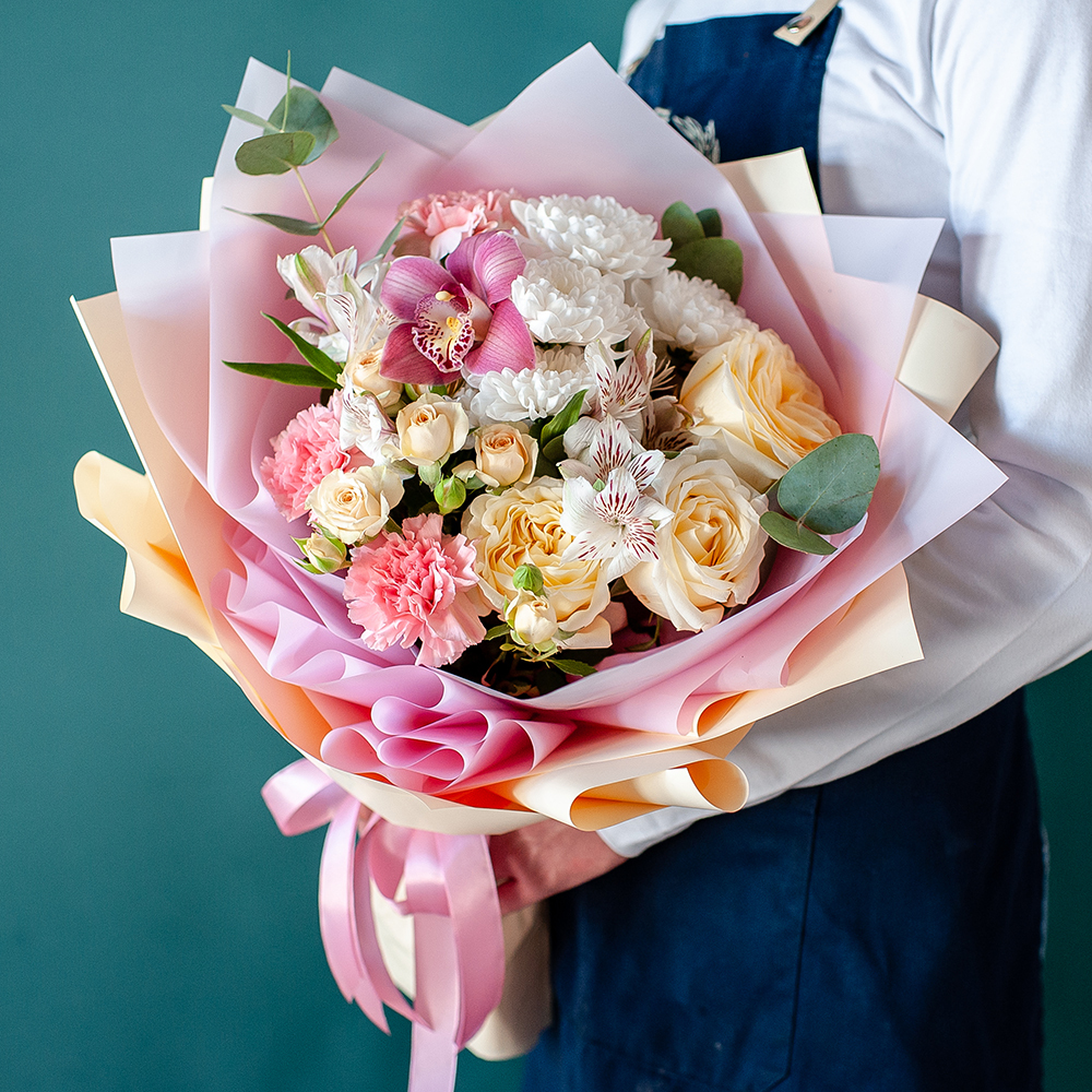 Букет "Нежность" – идеальный подарок для особенных моментов Подарите своим близким атмосферу тепла и гармонии с нежным букетом, созданным для радостных событий. В составе композиции – роскошные кремовые розы, элегантные альстромерии, изысканные орхидеи и воздушные хризантемы, дополненные зеленью и стильной упаковкой. Идеально подойдет для: - Дня рождения - Годовщины - Дня любви и признания - Приятного сюрприза без повода Доставка по Рязани – быстро и бережно привезем ваш заказ в удобное время. Красивое оформление – композиция уже готова для вручения! Закажите этот восхитительный букет и подарите эмоции, которые запомнятся навсегда!