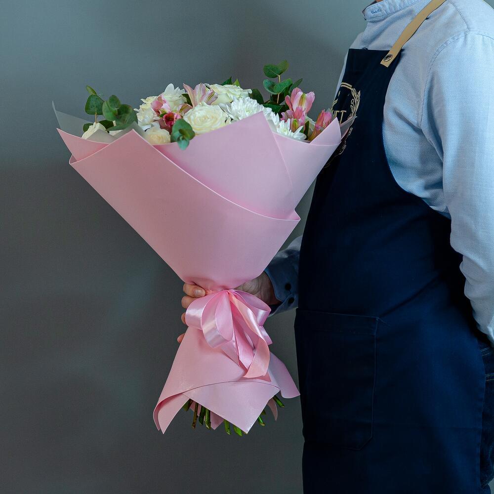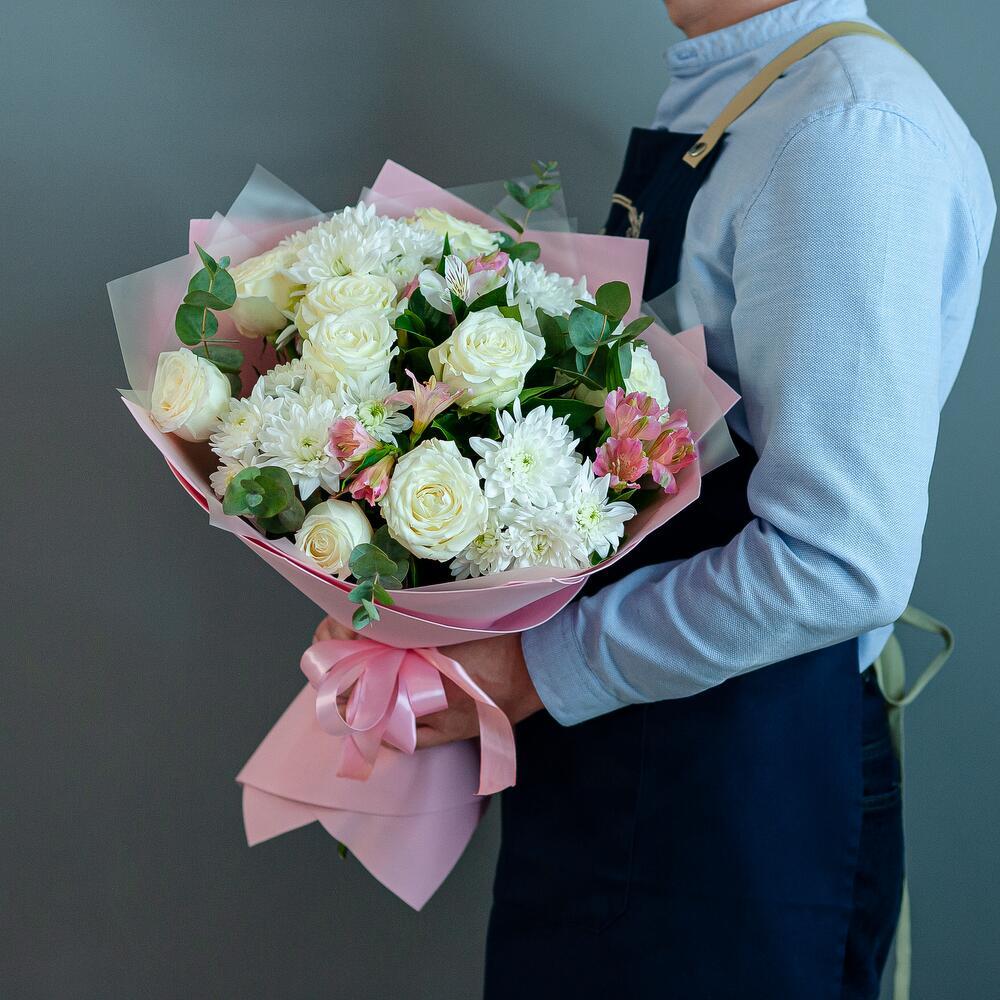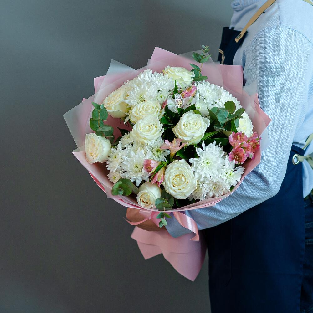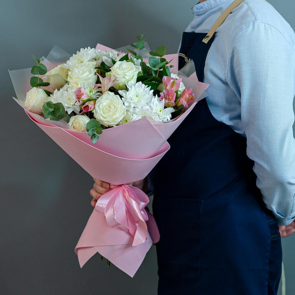 Ищете идеальный букет для особенной даты? Представляем вам букет, который покорит ваше сердце с первого взгляда! В его состав входит роскошная роза Мондиаль - символ изысканности и элегантности, нежная кустовая хризантема - воплощение женственности и грации, а также утонченная альстромерия и пышный эквалипт - добавляют букету свежести и яркости. Этот букет станет незабываемым подарком на свадьбу, день рождения или просто для выражения своих чувств. Подарите своим близким минуты радости и восхищения с букетом от магазина ЦветНик