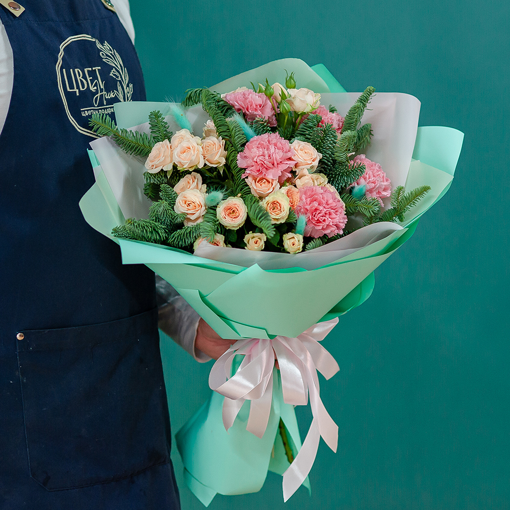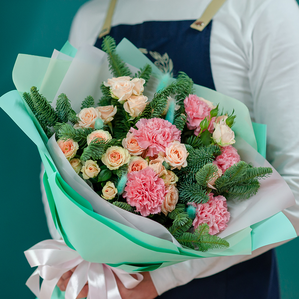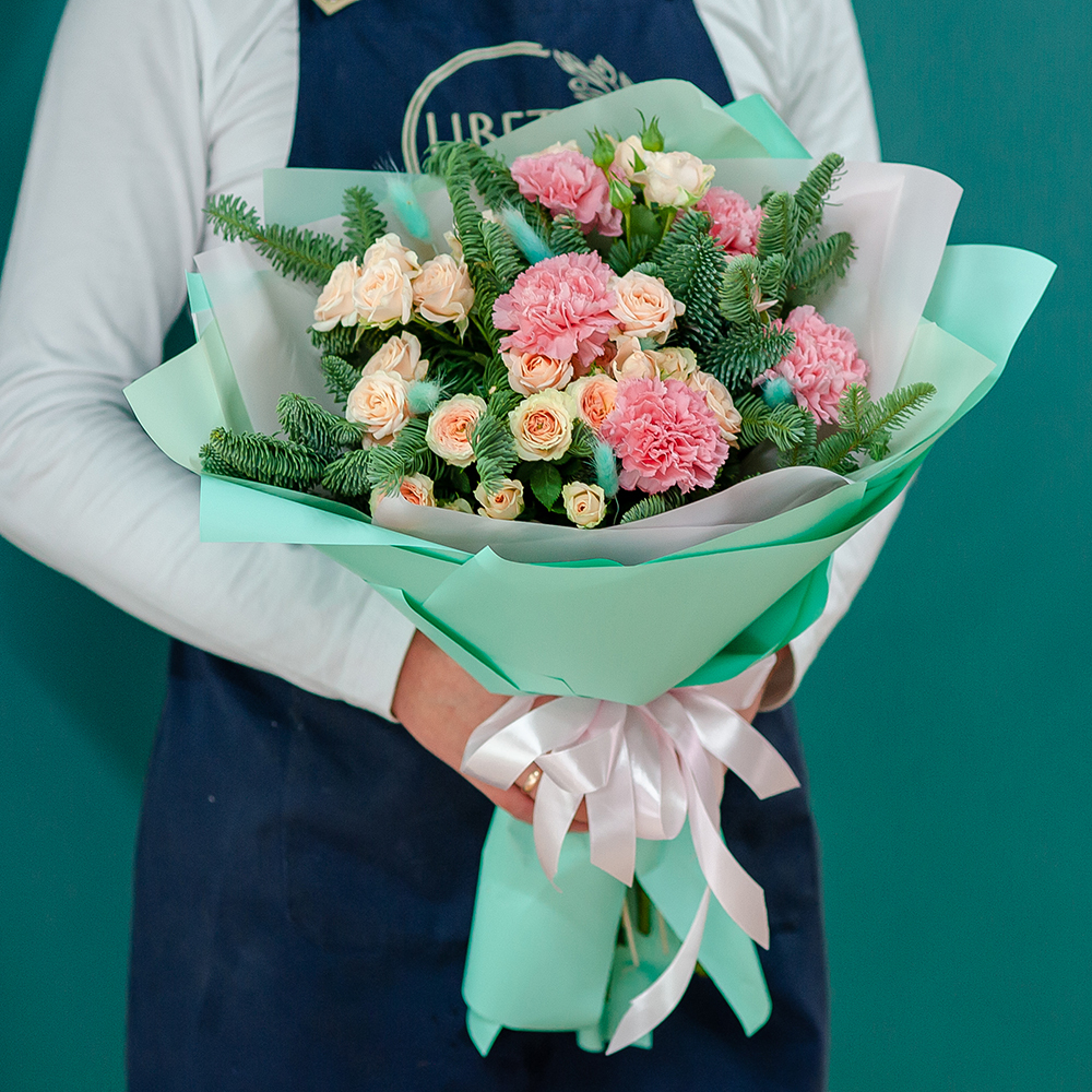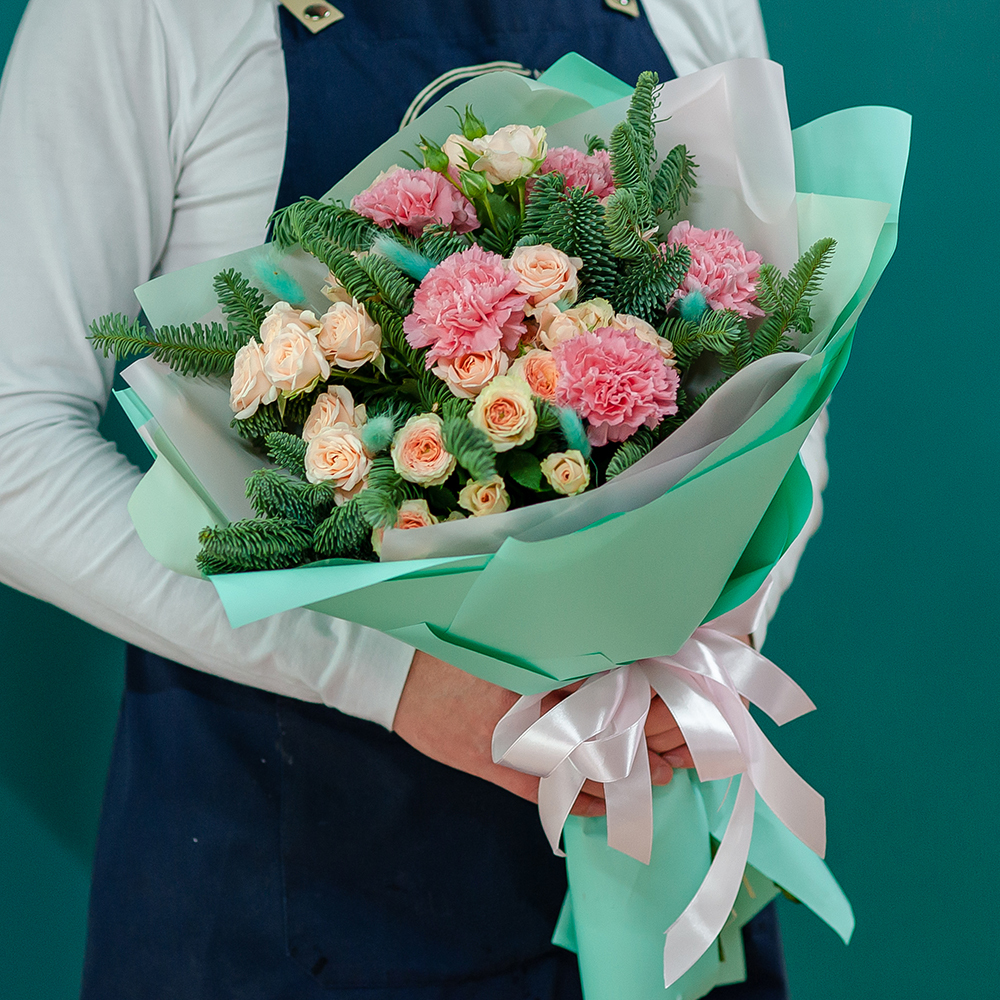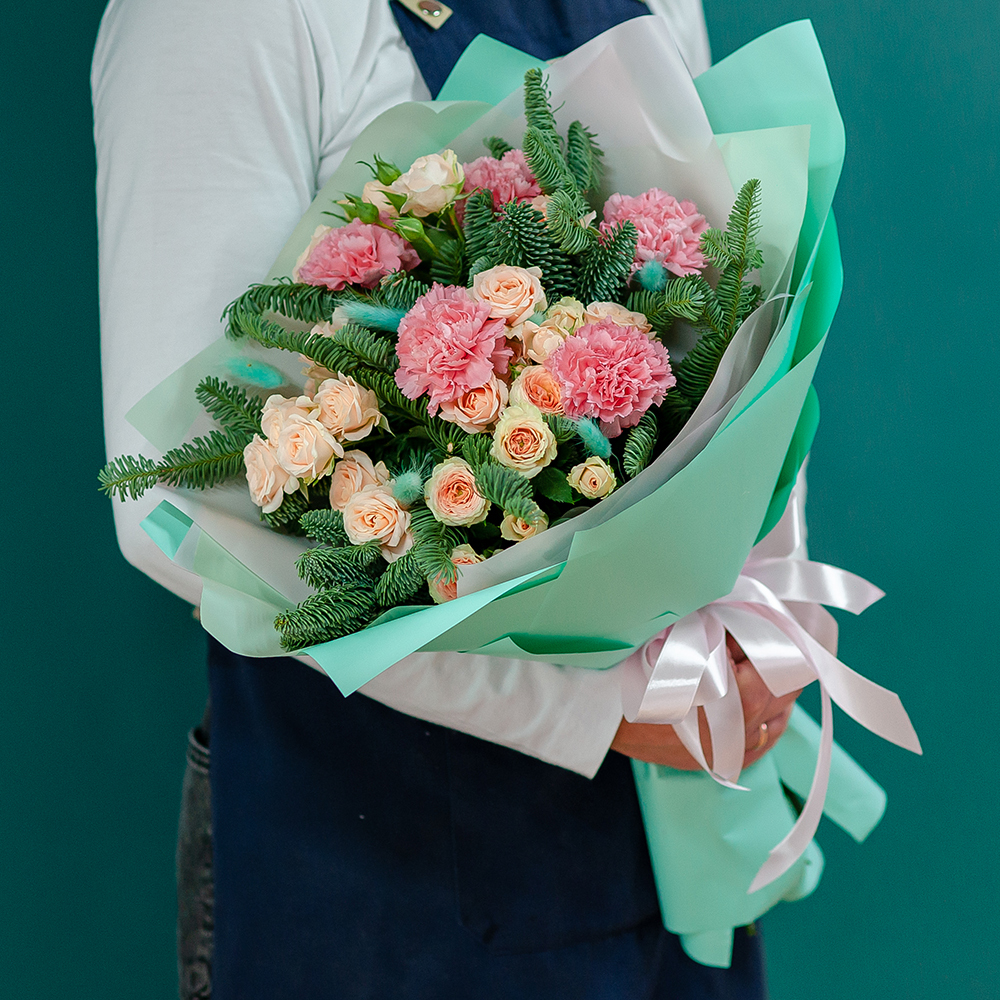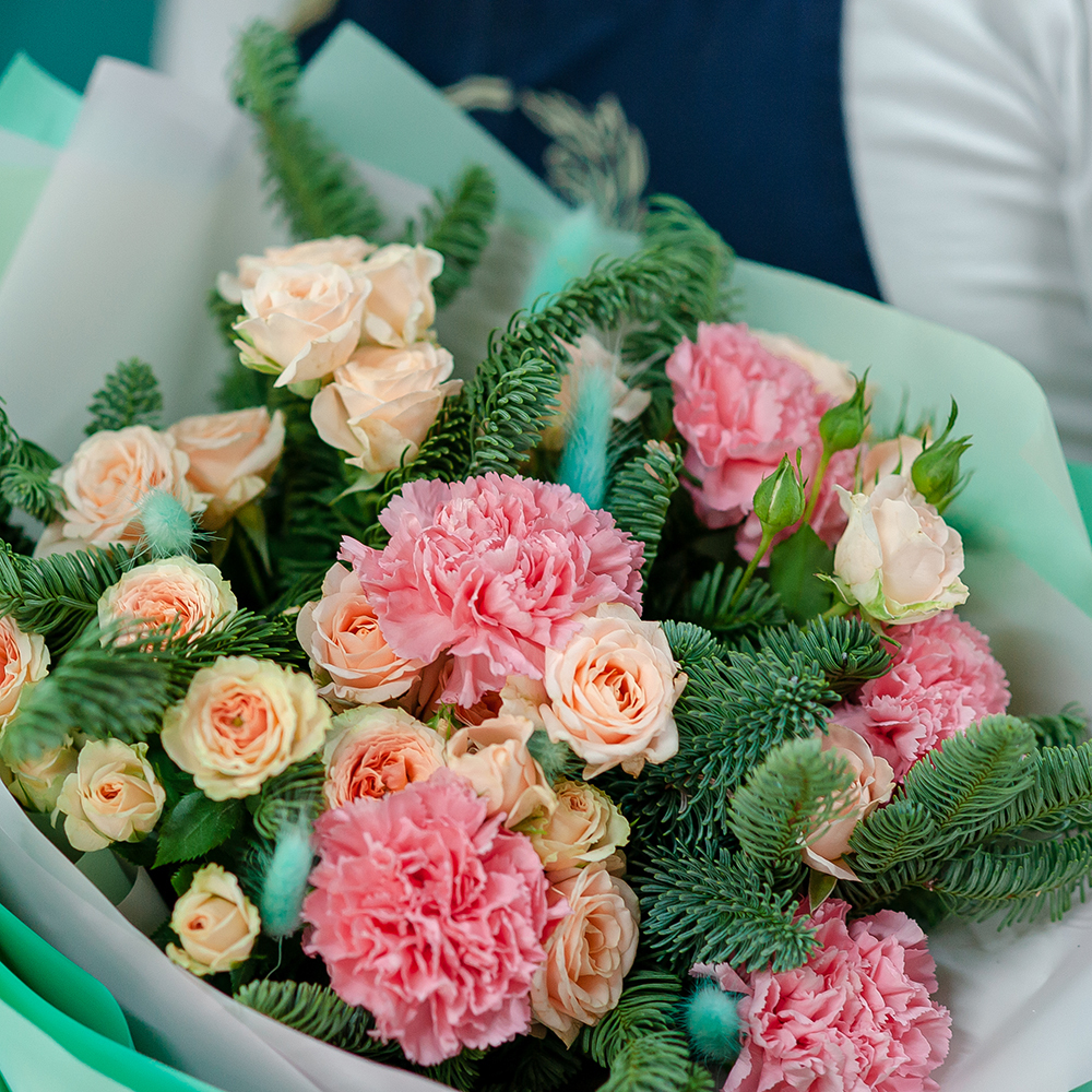 Подарите радость и волшебство зимних праздников с сезонным букетом из нобилиса с кустовой розой и диантусами в оформлении тиффани – этот букет станет великолепным выражением ваших чувств и уважения к особому зимнему событию!