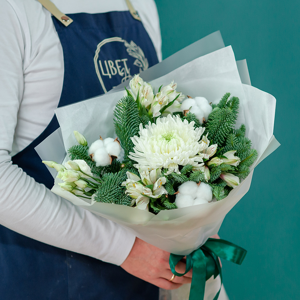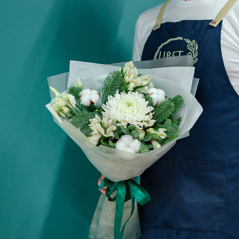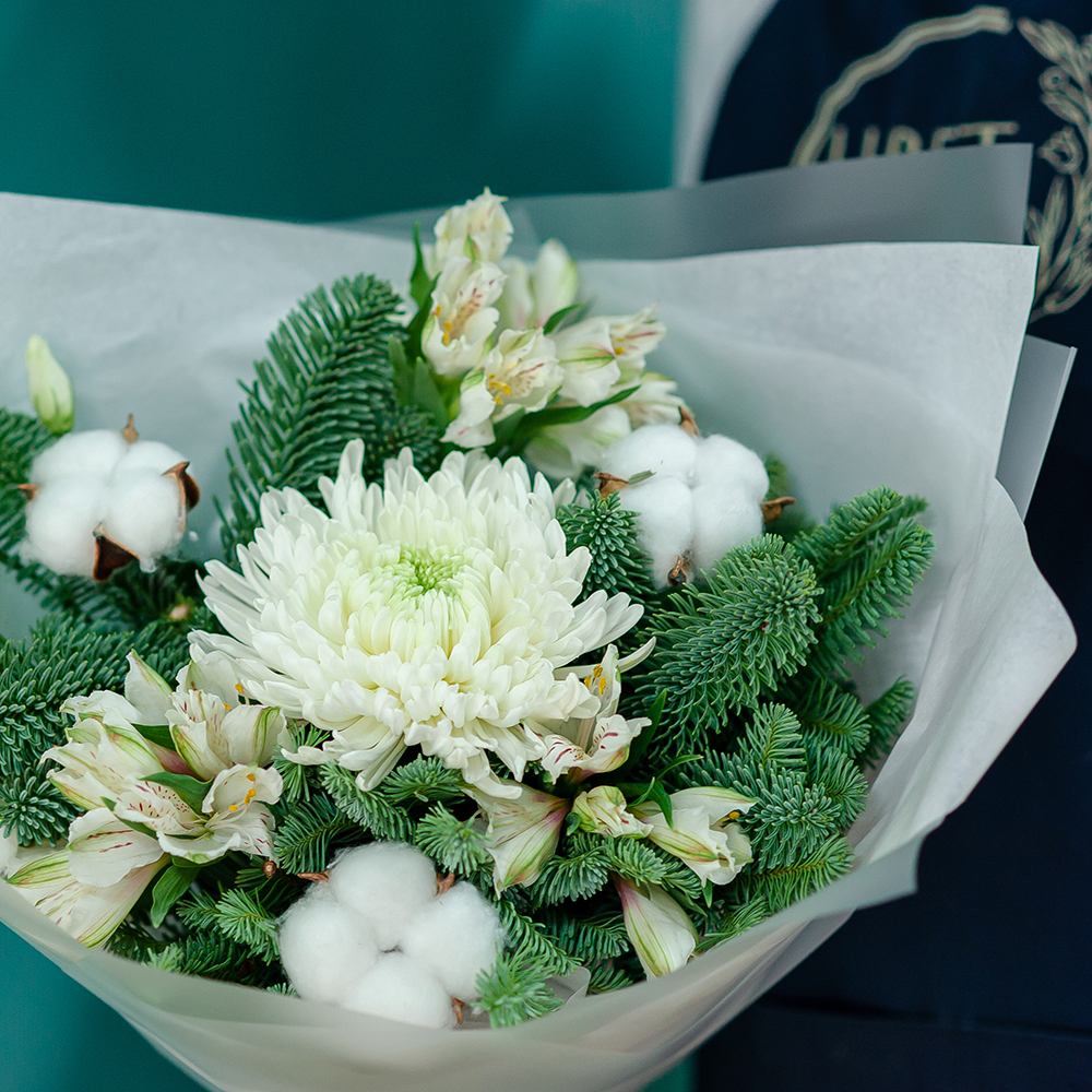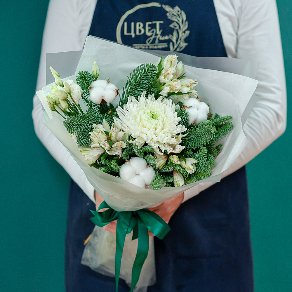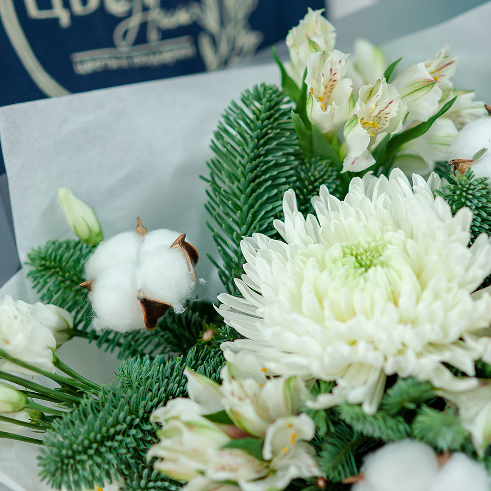 Погрузитесь в атмосферу зимних праздников с нашим великолепным сезонным букетом, сочетающим в себе нобилис, одноголовую хризантему и хлопок. Этот букет станет идеальным подарком для любого торжественного случая, будь то Рождество, Новый год или просто как знак внимания, чтобы подарить близким людям ощущение праздника и уюта.