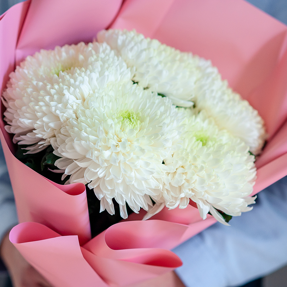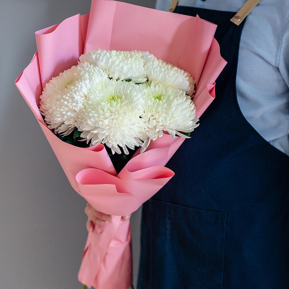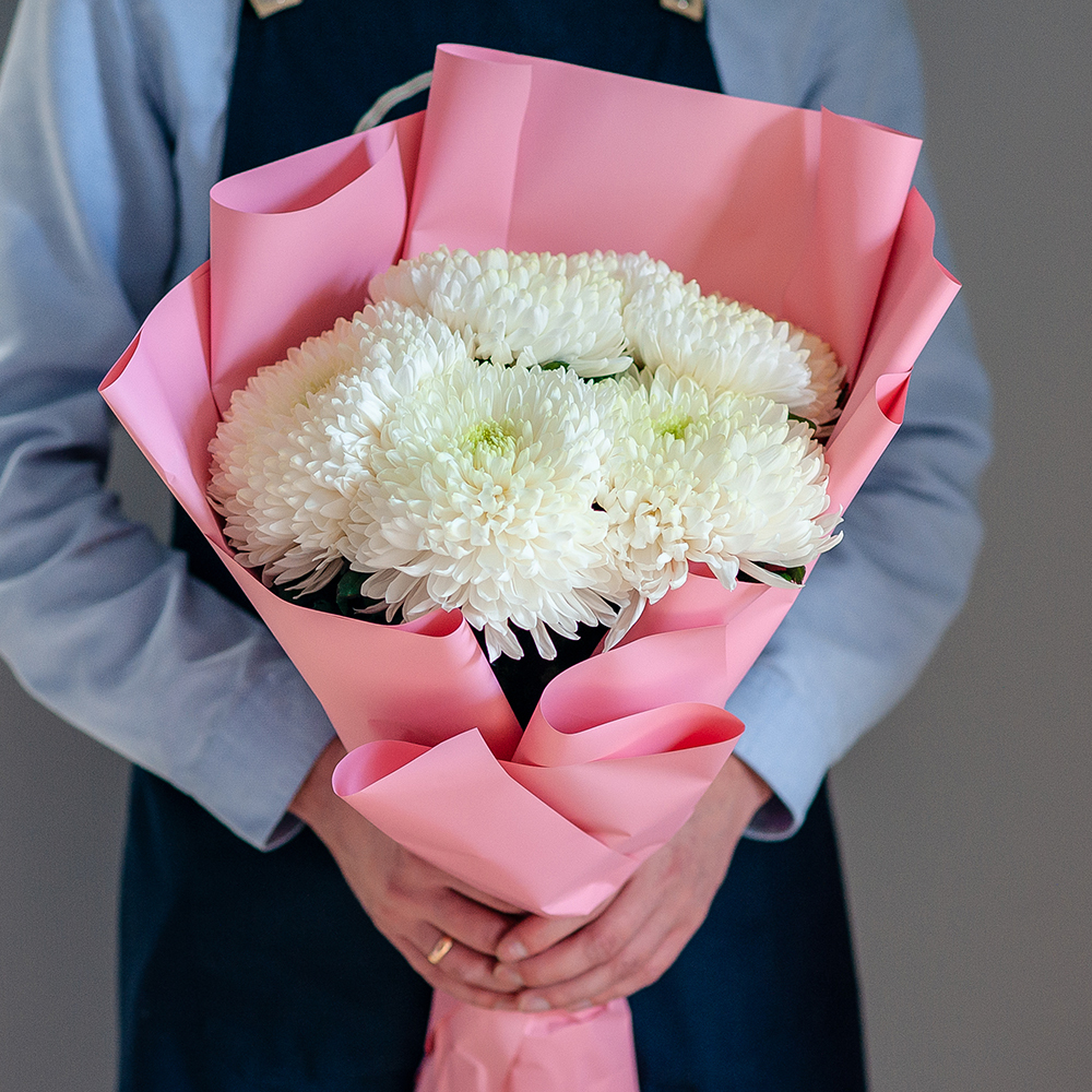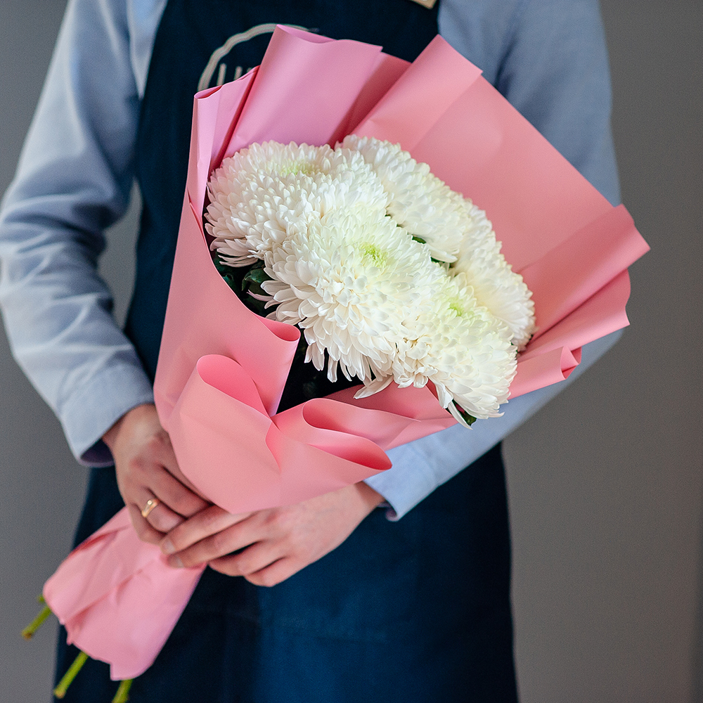 Букет из белых хризантем с доставкой по Рязани Подарите радость и теплые чувства с помощью элегантного букета из белых хризантем! Нежные, свежие цветы, оформленные в стильную упаковку, идеально подойдут для любого повода: день рождения, юбилей, знак внимания или просто без повода. ?? Состав: крупные белые хризантемы ?? Оформление: стильная упаковка в розовых оттенках ?? Доставка: по Рязани в удобное для вас время Закажите сейчас и порадуйте близкого человека красивым и свежим букетом! ????