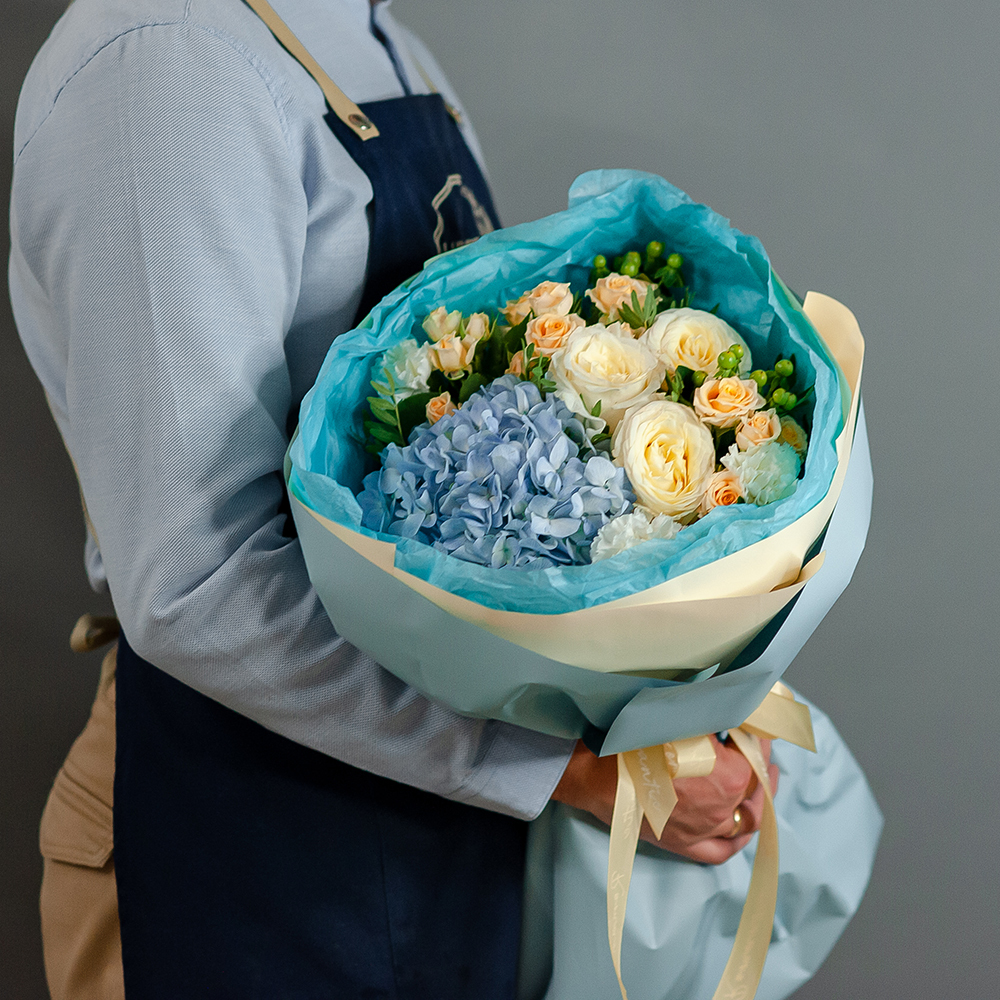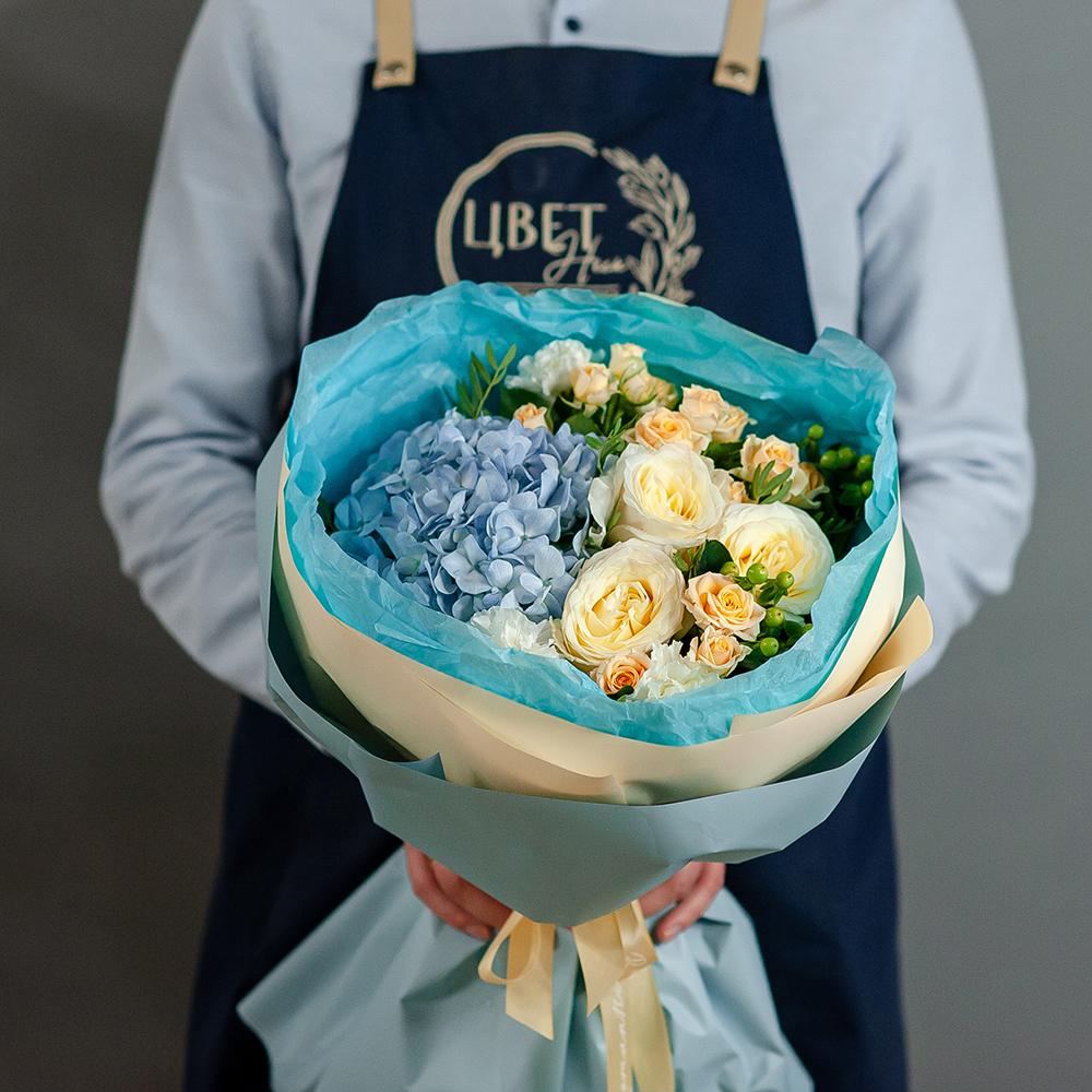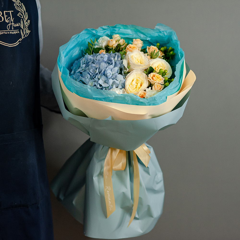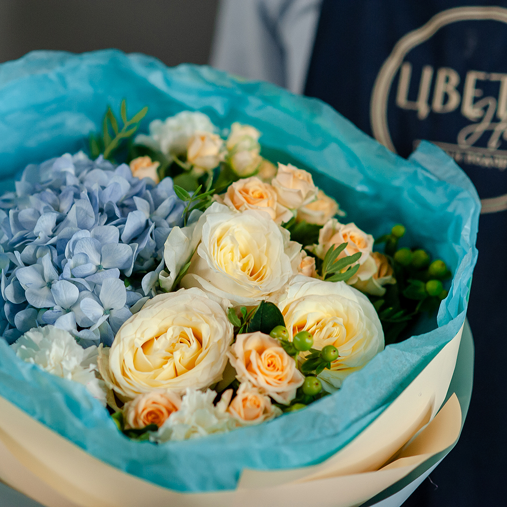 Подарите частичку настроения и тепла с этим утонченным букетом! Нежное сочетание кремовых роз, воздушной голубой гортензии и изящных мелких бутонов создаст атмосферу легкости и романтики. Аккуратно оформленный в стильную упаковку, он станет идеальным подарком для любого случая — дня рождения, годовщины, свидания или просто чтобы порадовать близкого человека. Доставка по Рязани Оформите заказ онлайн и порадуйте любимых уже сегодня!