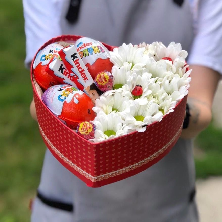 Коробочка в форме сердца (d=19 см) с ромашками и киндерами.