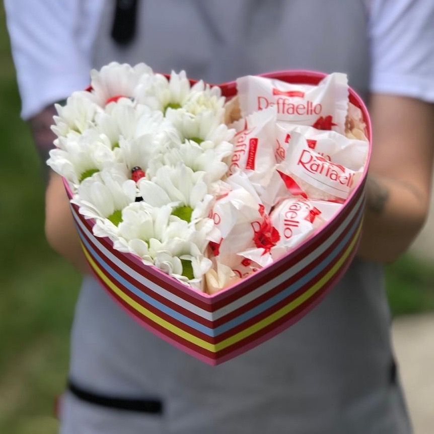 Коробочка в форме сердца (d=19 см) с ромашками и рафаэлло.