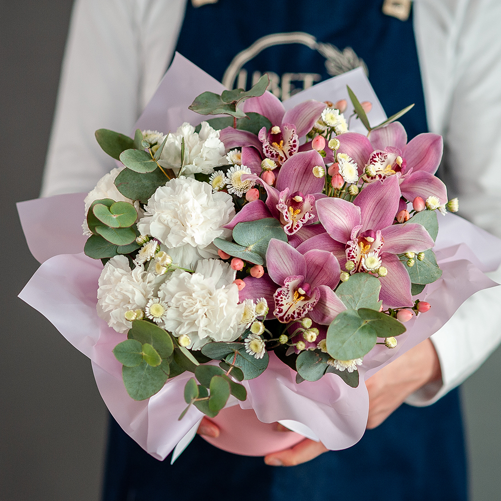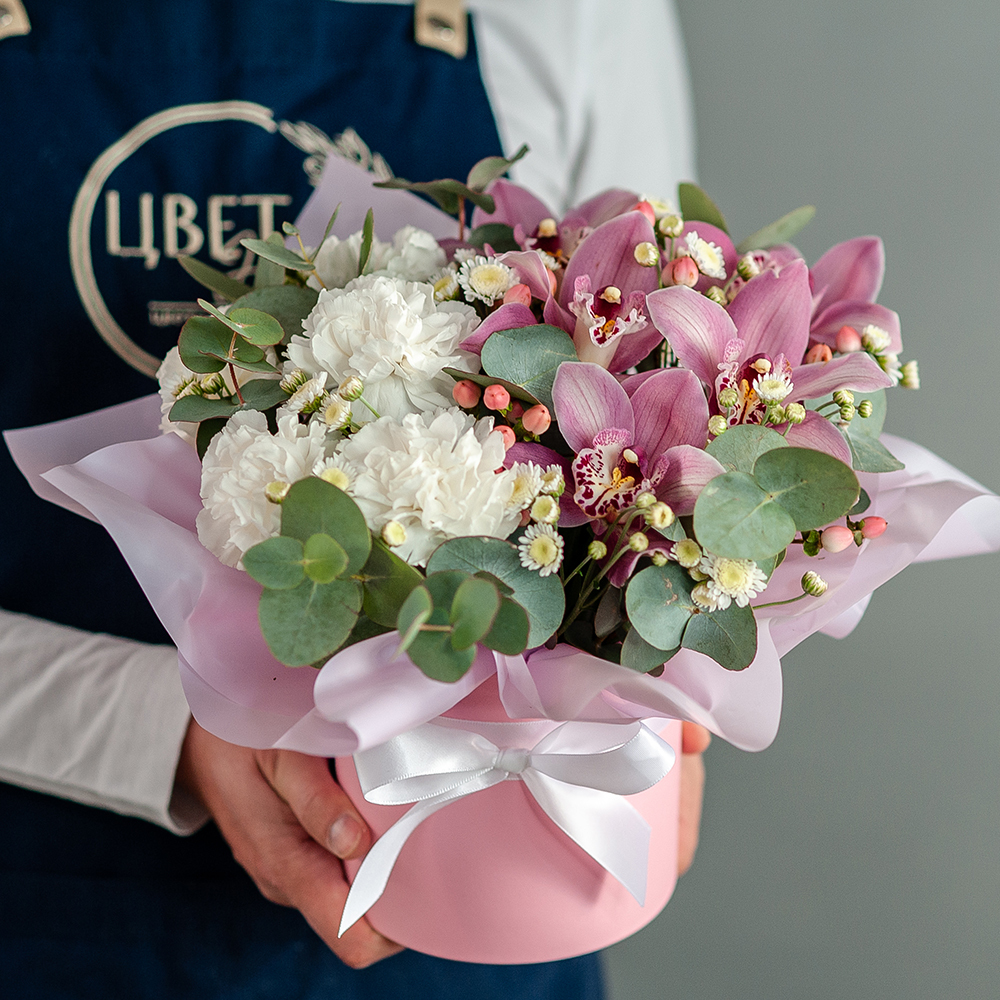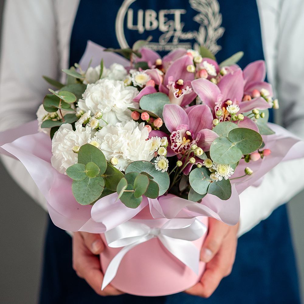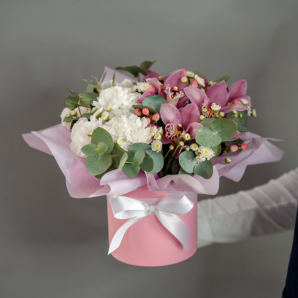 Элегантная цветочная композиция в коробке с доставкой по Рязани Подарите нежность и радость близкому человеку с нашей утончённой цветочной композицией! В нежно-розовой шляпной коробке собраны изысканные орхидеи, воздушные белые гвоздики, утончённые хризантемы и ароматный эвкалипт, создающие атмосферу изящества и гармонии. Почему выбрать этот букет? Стильно оформленная композиция в шляпной коробке – не требует вазы Свежие и отборные цветы от лучших флористов Идеальный вариант для подарка на День рождения, годовщину, 8 Марта или просто без повода Доставка по Рязани Закажите прямо сейчас, и мы бережно доставим этот красивый букет в любую точку города! Порадуйте любимых теплотой и красотой живых цветов!