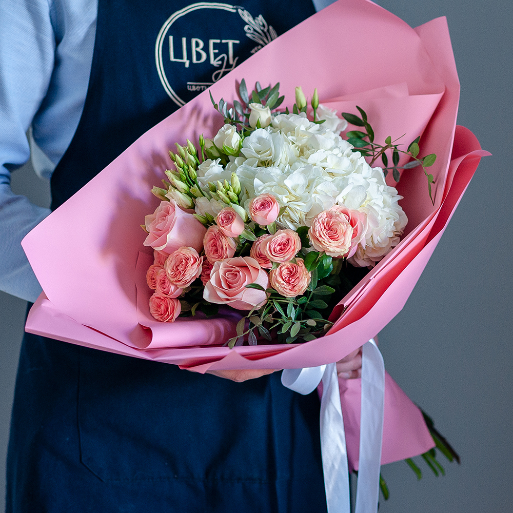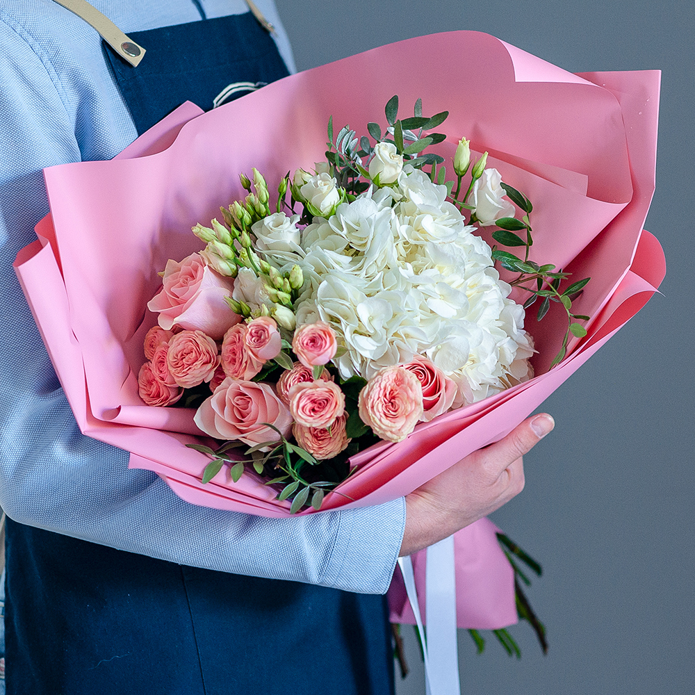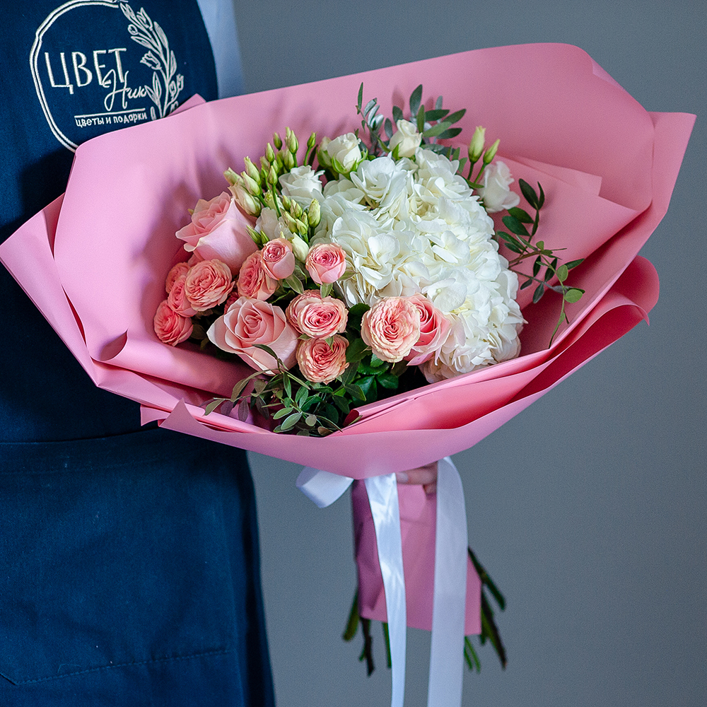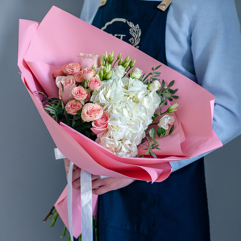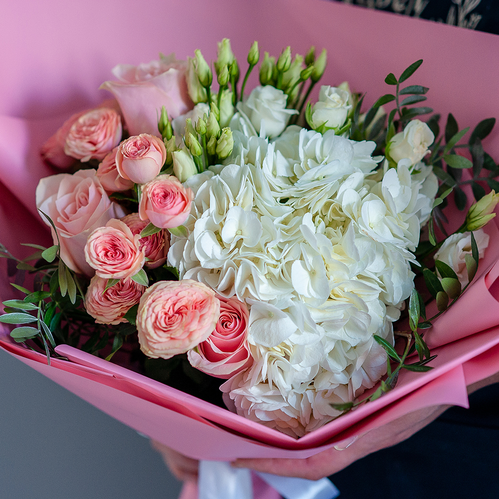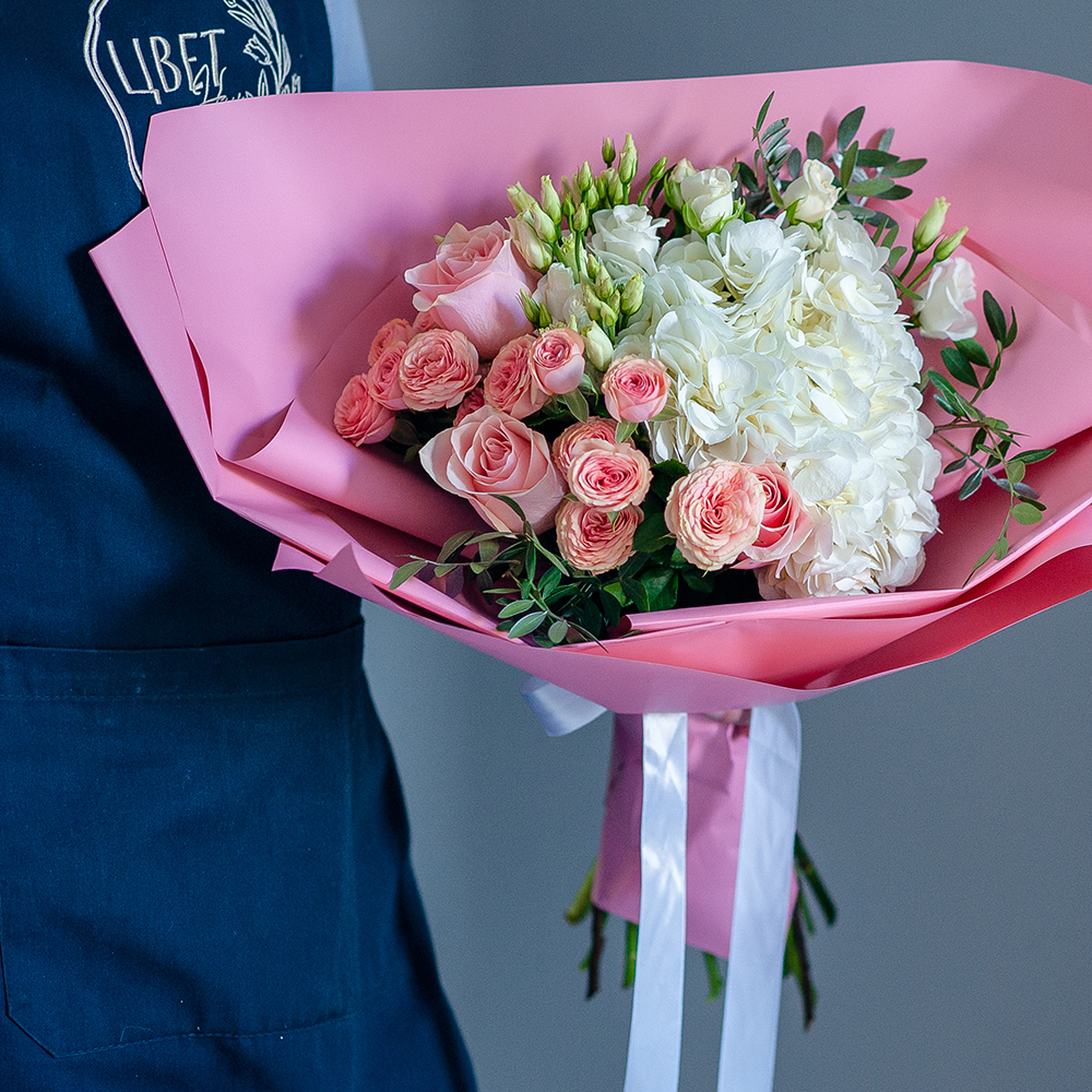 Изысканный и нежный букет, идеально передающий атмосферу теплых чувств и заботы. В его составе гармонично сочетаются воздушная белая гортензия, пудровые розы и кустовые розочки пастельных оттенков, дополненные зеленью для легкости и свежести. Этот элегантный букет станет прекрасным подарком на День рождения, годовщину, свадьбу или без повода — просто чтобы подарить радость и улыбку любимому человеку. Доставка по Рязани Красивое оформление в стильной упаковке Возможен срочный заказ Порадуйте близких утонченным цветочным комплиментом!