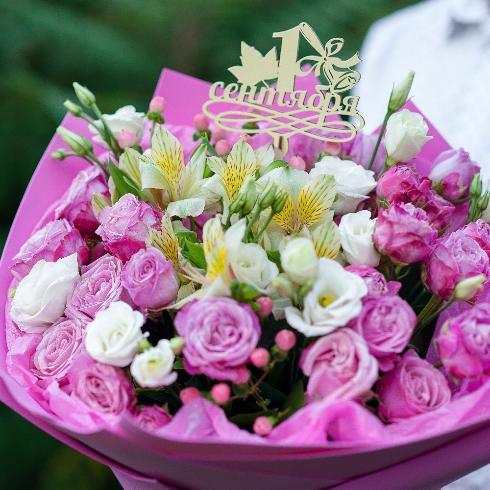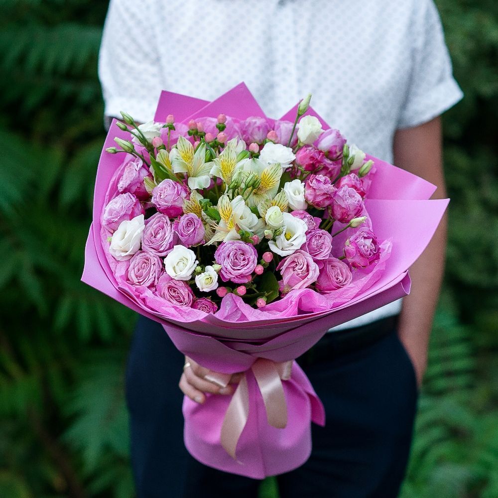 Согстав: кустовая роза, альстромерия,эустома, гиперикум, упаковка,атласная лента