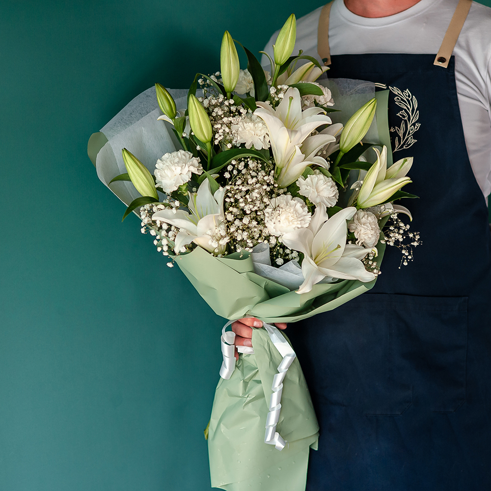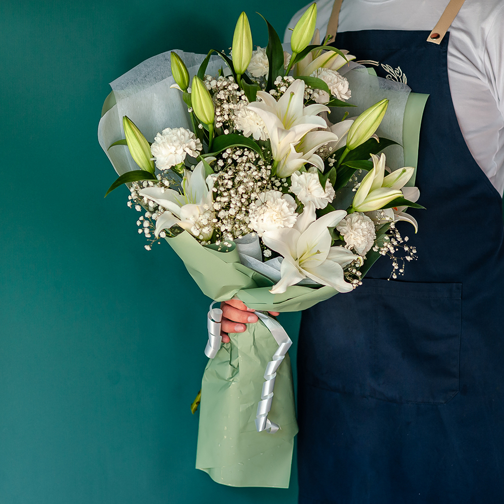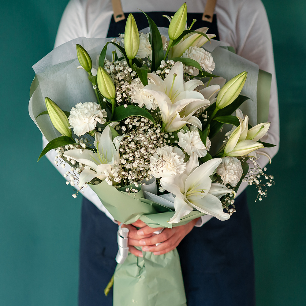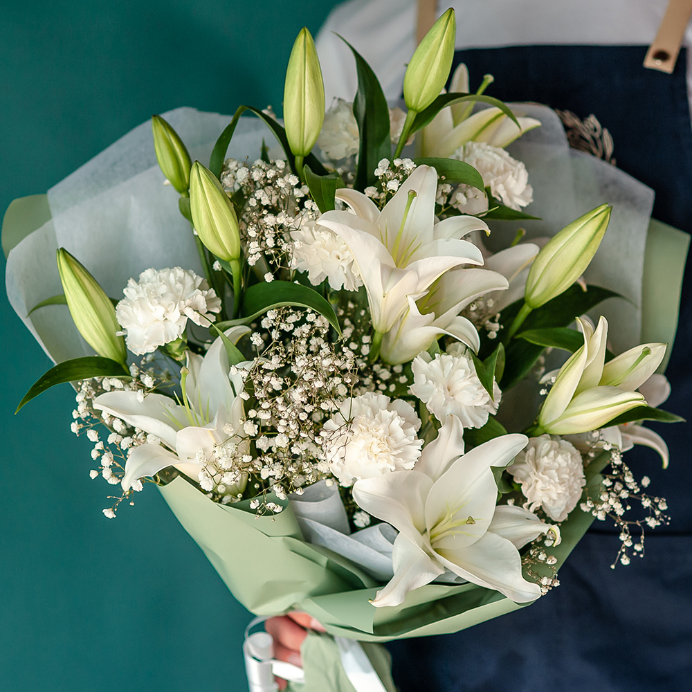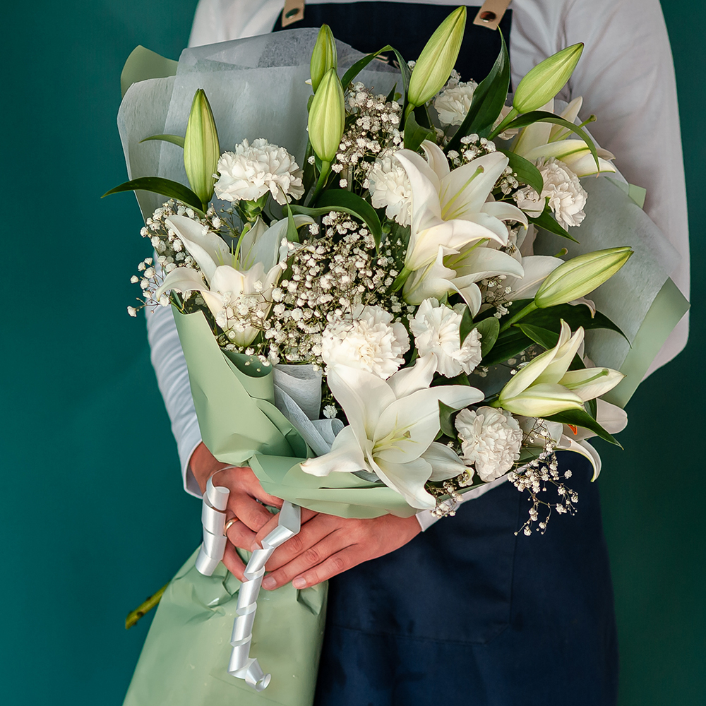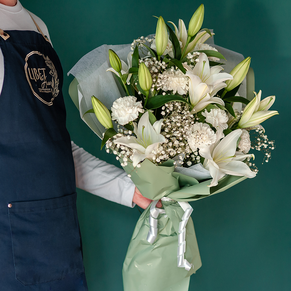 Это изысканный и нежный подарок, который подарит получателю ощущение лёгкости и свежести. Букет состоит из свежих цветов, которые долго будут радовать получателя своей красотой и ароматом. В центре букета — величественные лилии, символ чистоты и благородства. Их окружают нежные и воздушные диантусы и гипсофила, создавая гармоничную композицию. Букет оформлен в светлых тонах, что придаёт ему особую элегантность и изящество. Он станет прекрасным подарком на свадьбу, юбилей или просто как знак внимания и заботы.