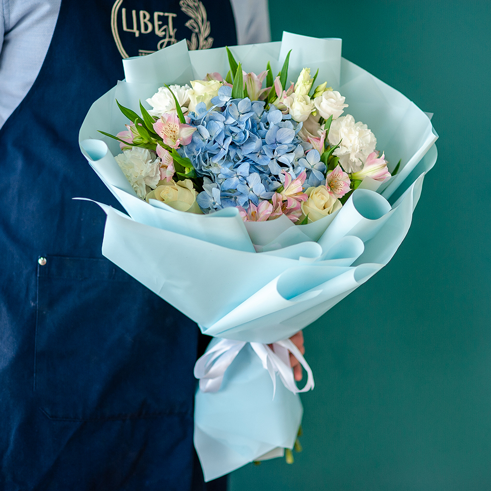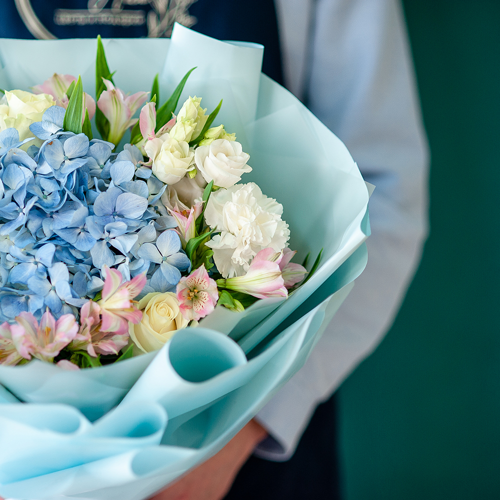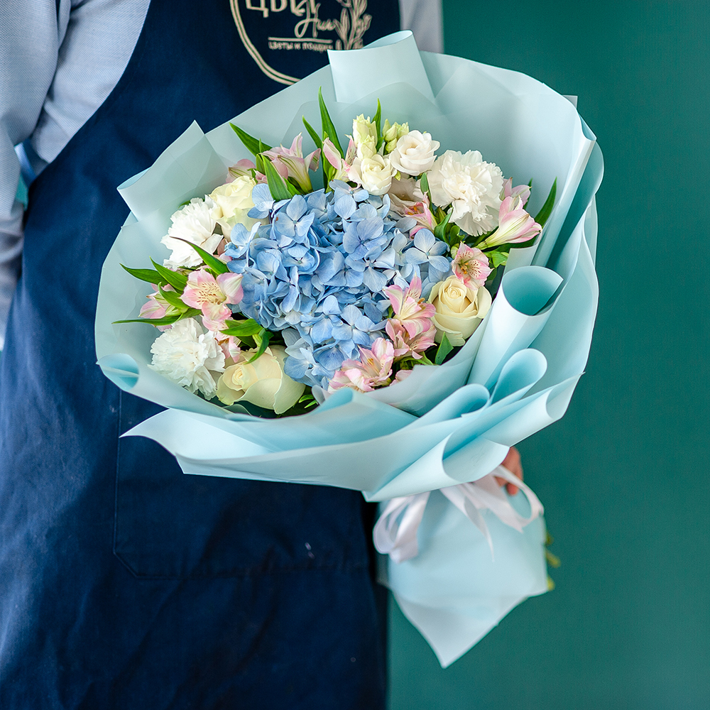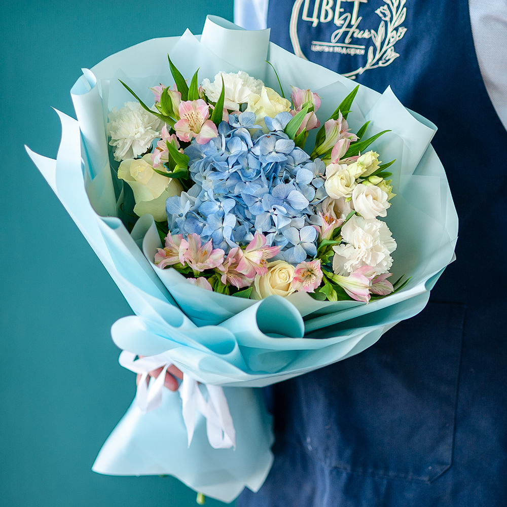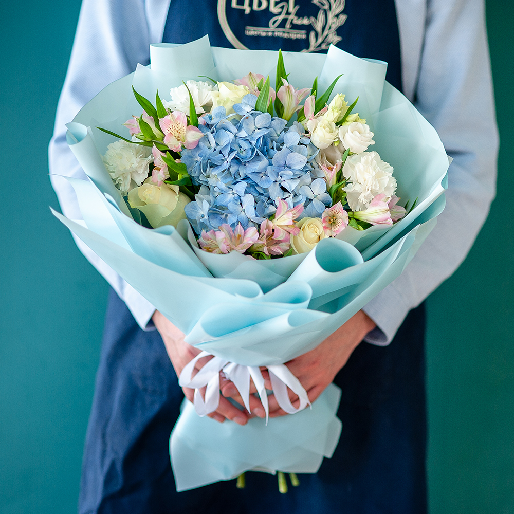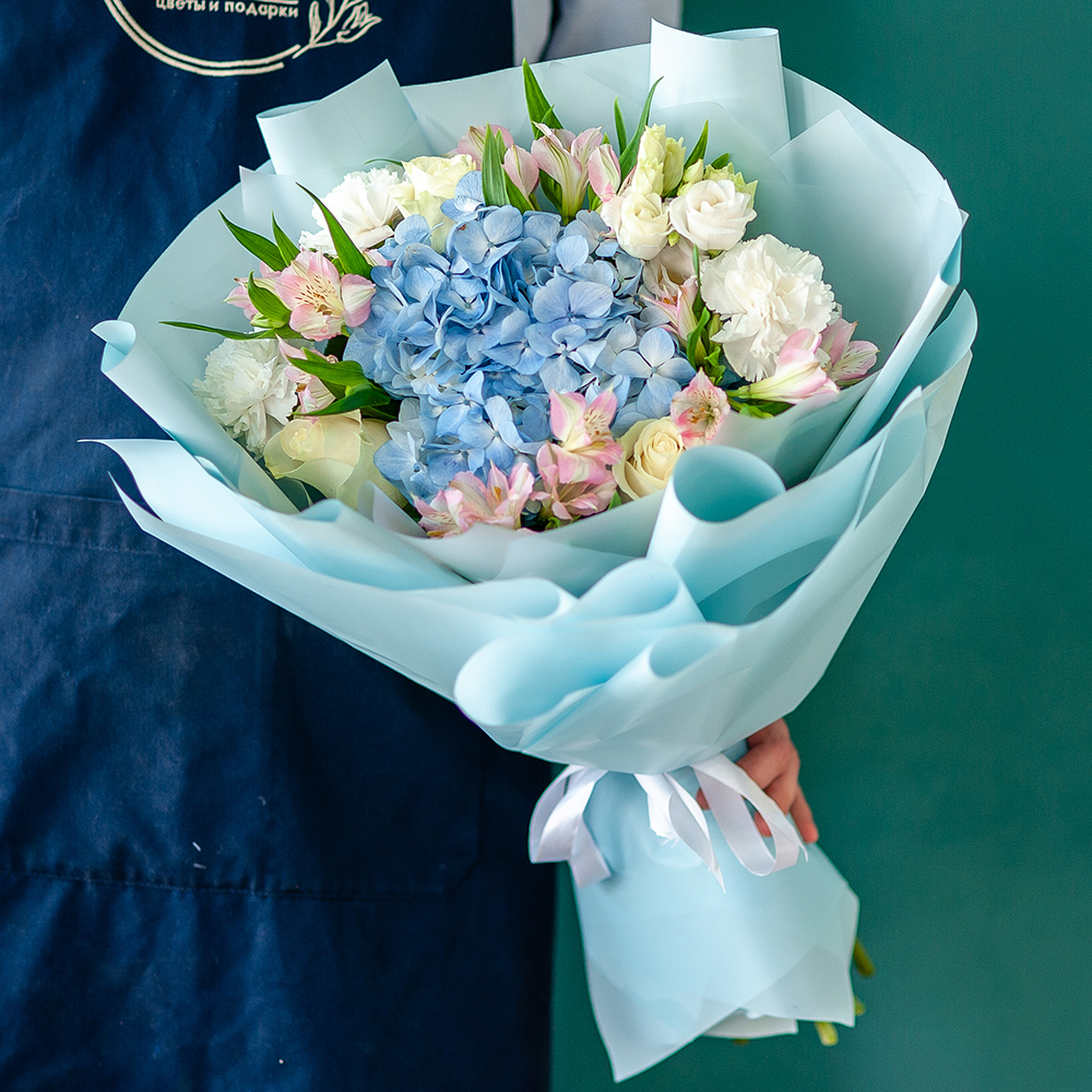 Букет "Нежность небес" Подарите волшебные эмоции с этим стильным букетом от сети магазинов "Цветник"! Очаровательное сочетание нежных оттенков – воздушная голубая гортензия, белоснежные розы и кустовые цветы, дополненные легкими розовыми акцентами альстромерии. Каждая деталь композиции собрана с любовью, чтобы передать всю теплоту ваших чувств. Состав: - Голубая гортензия - Белые розы - Альстромерии - Декоративная зелень - Стильная упаковка в пастельных тонах Доставка по Рязани – оперативно и бережно доставим ваш букет в любую точку города! Этот букет – идеальный выбор для особого случая, будь то день рождения, юбилей или просто способ сказать "Спасибо" и "Люблю". Дарите радость вместе с "Цветник"!