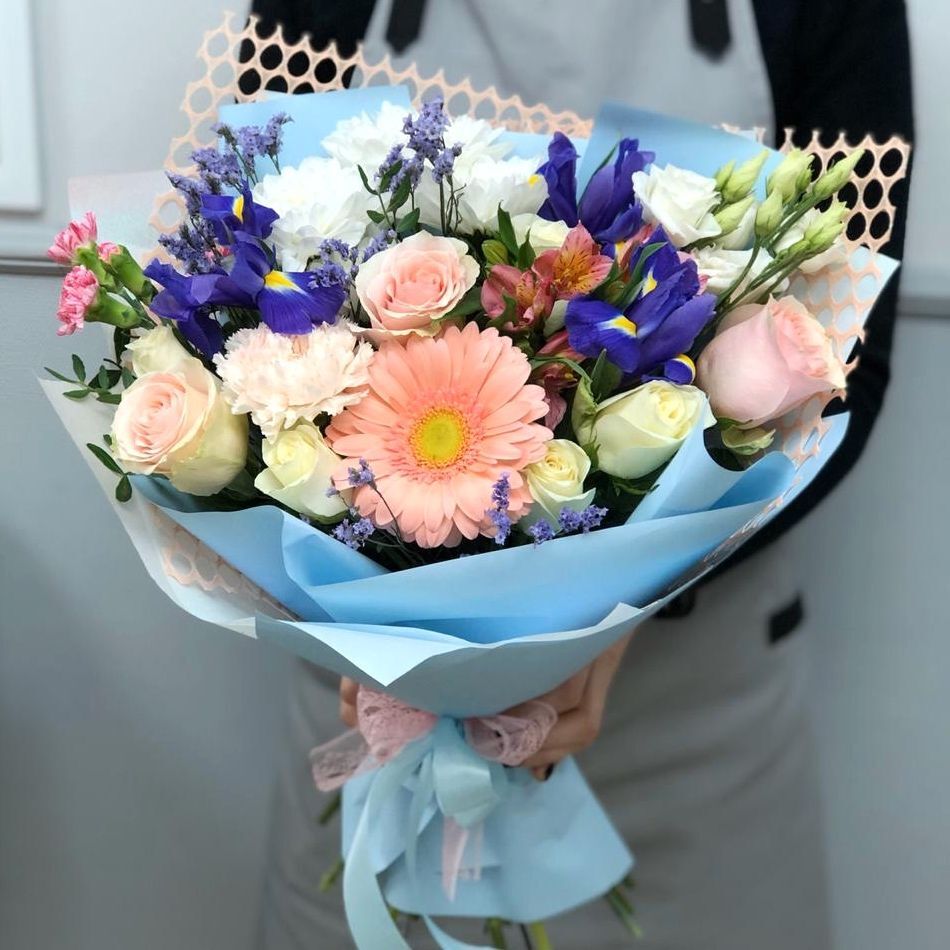 Сборный букет с ирисами, герберой, эквадорскими и кенийскими розами, эустомой и альстромерией.