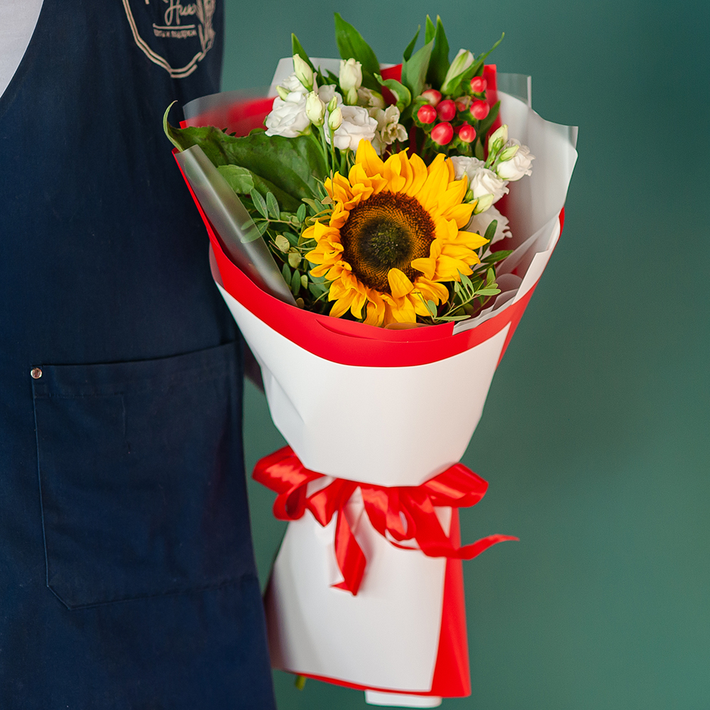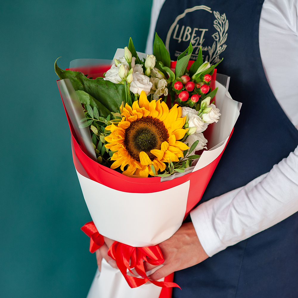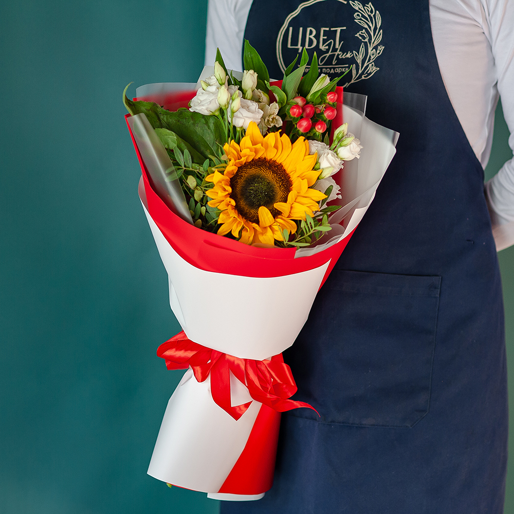 Хотите порадовать близкого человека ярким и запоминающимся подарком? Тогда сборный букет с подсолнухом в красно-белом оформлении — это то, что вам нужно!