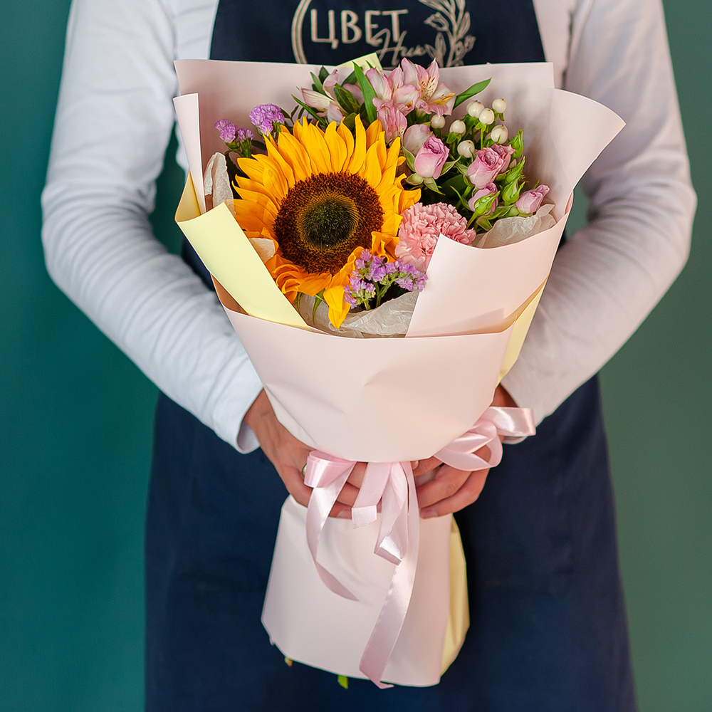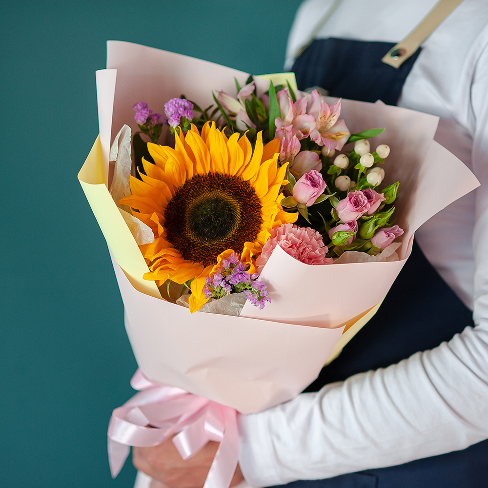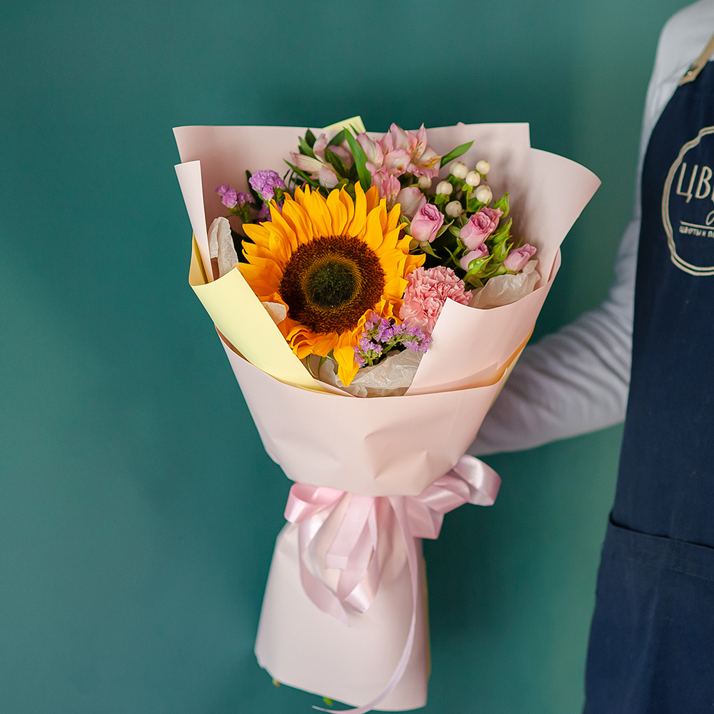Хотите порадовать близкого человека необычным и запоминающимся подарком? Тогда сборный букет с подсолнухом в розовом оформлении — это то, что вам нужно!