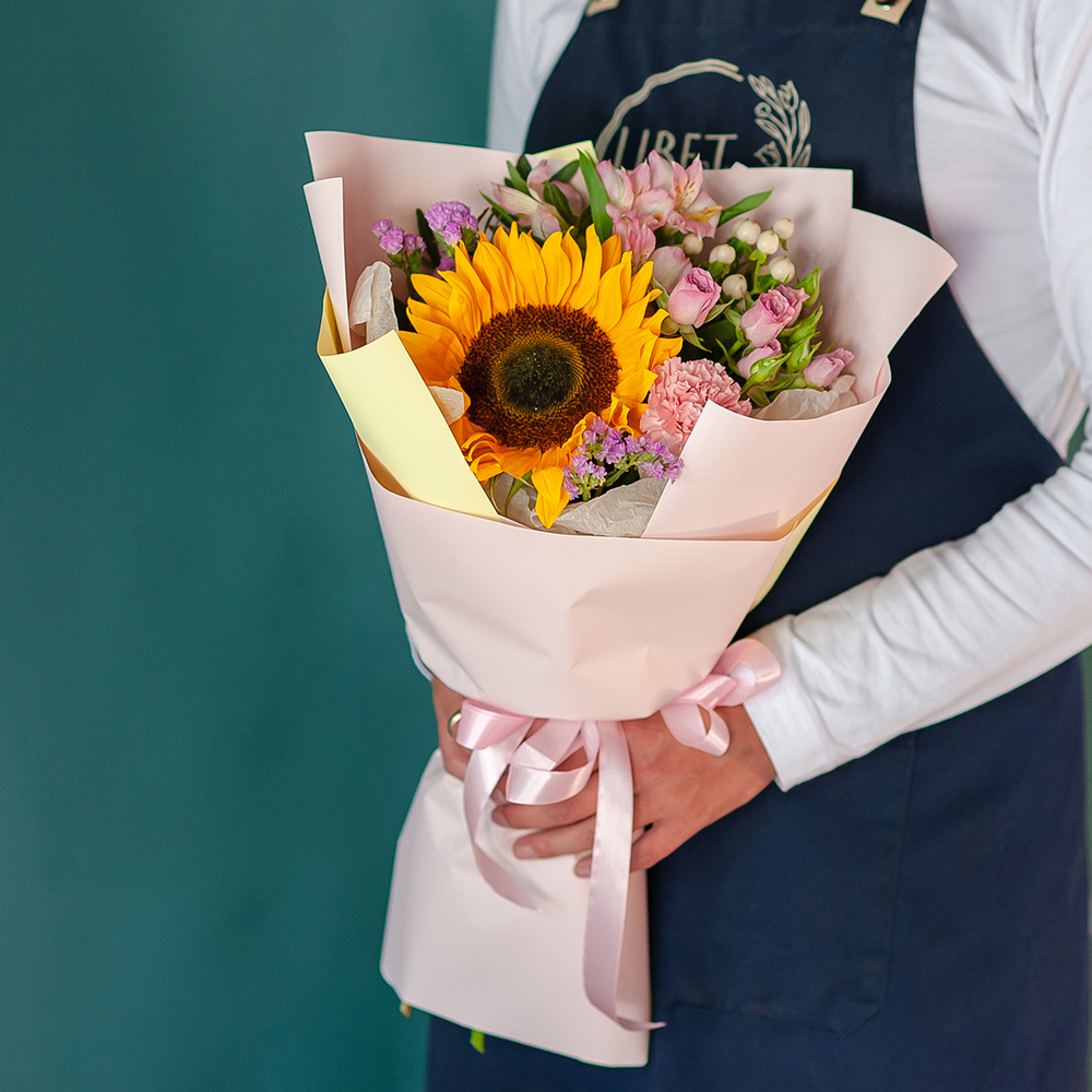 Букет сочетает в себе яркие краски лета и нежность розовых оттенков. Подсолнух символизирует радость, тепло и солнце, а розовое оформление добавляет букету изысканности и элегантности.