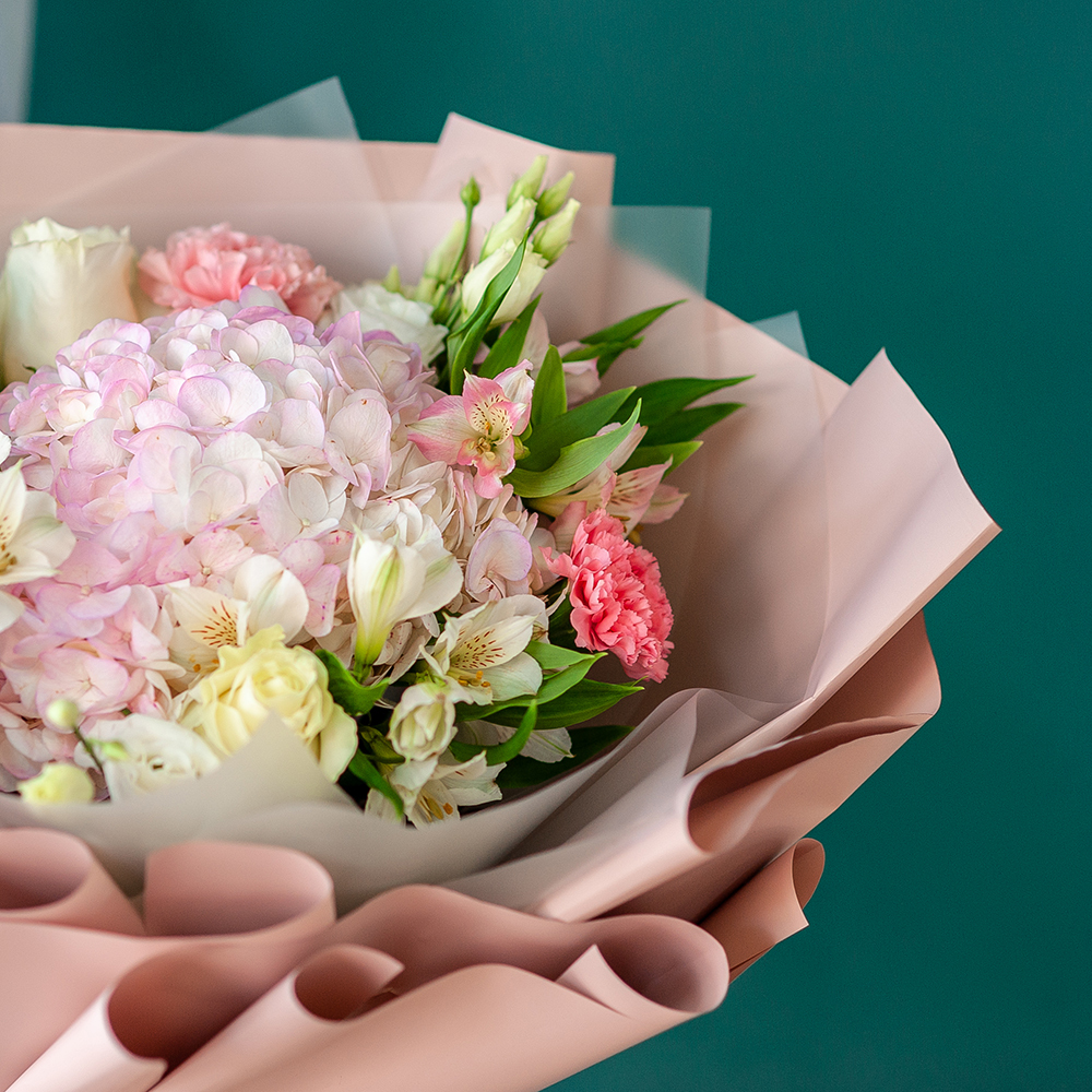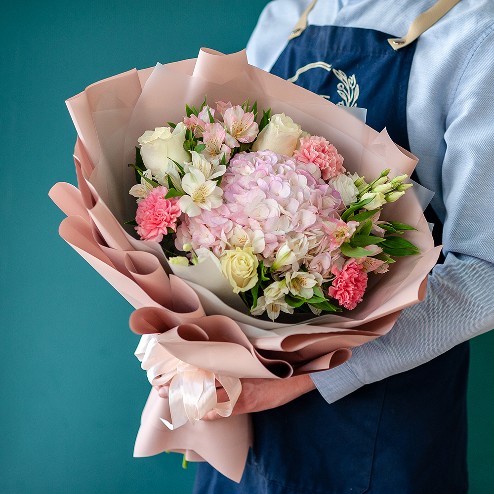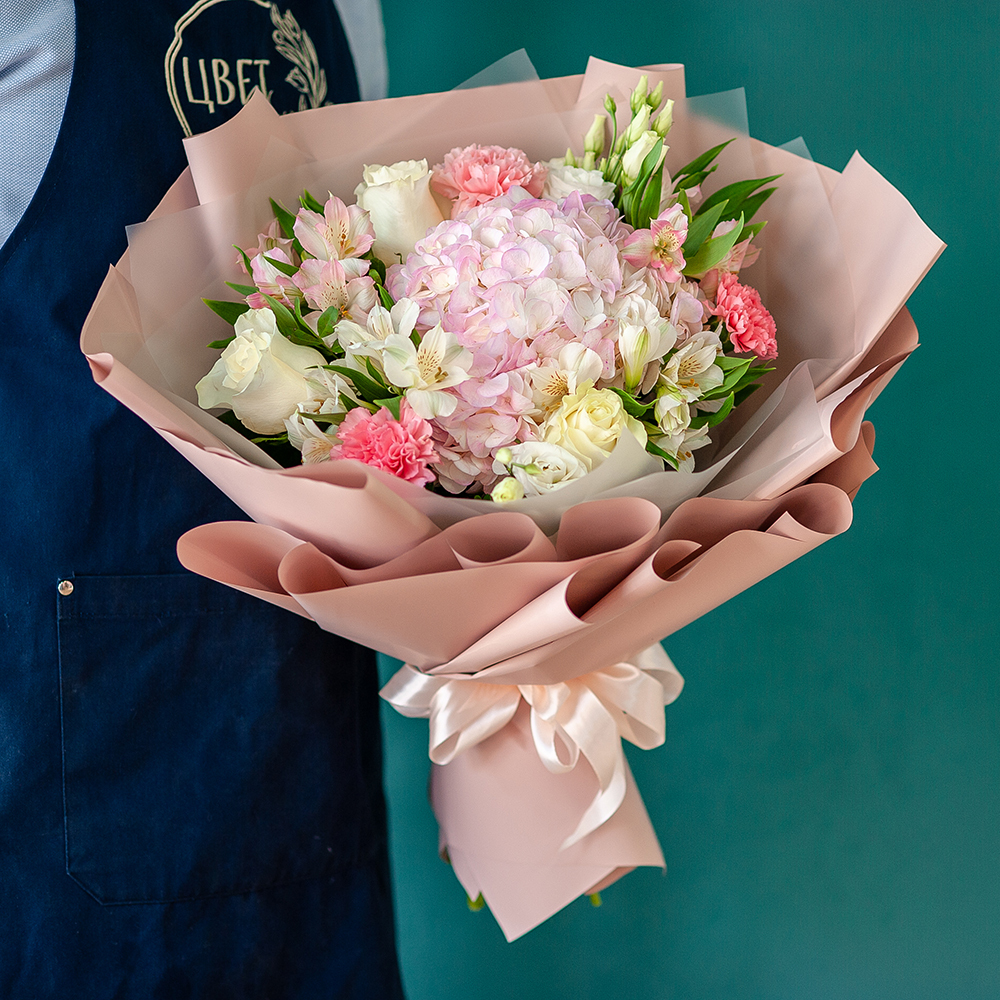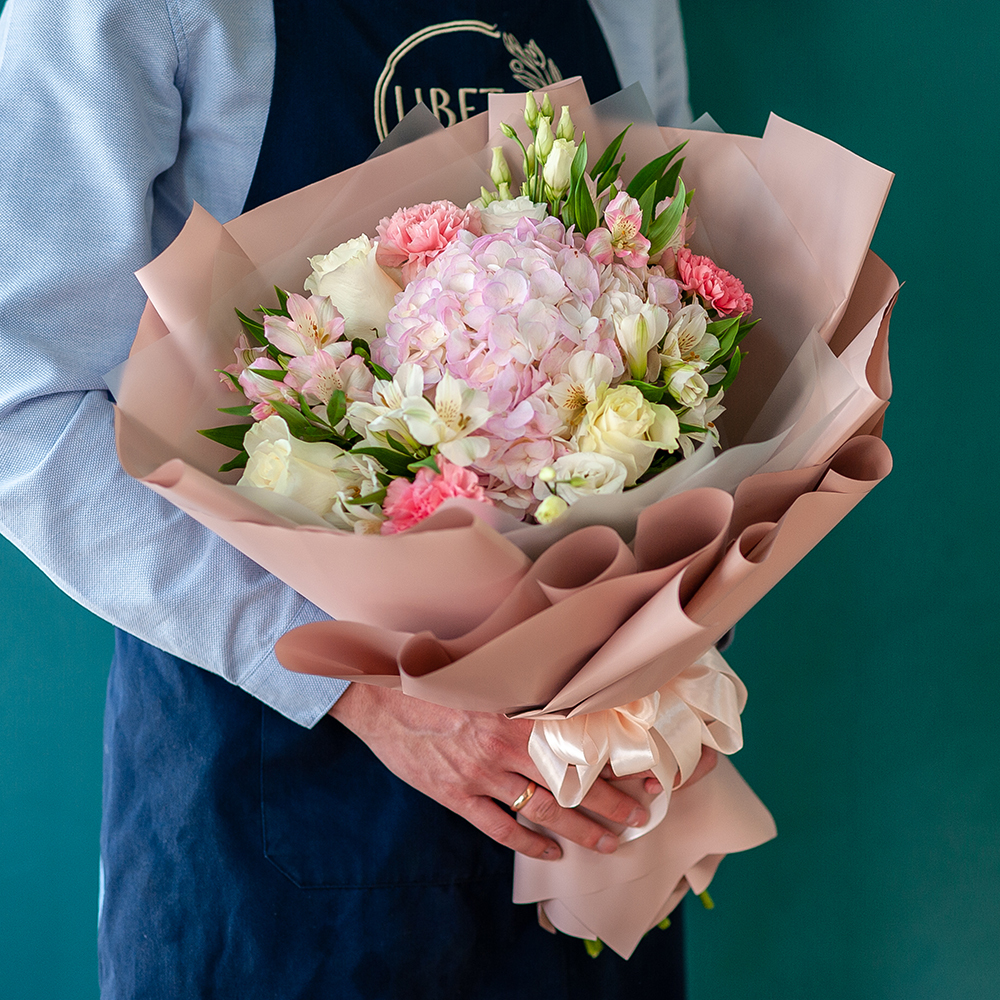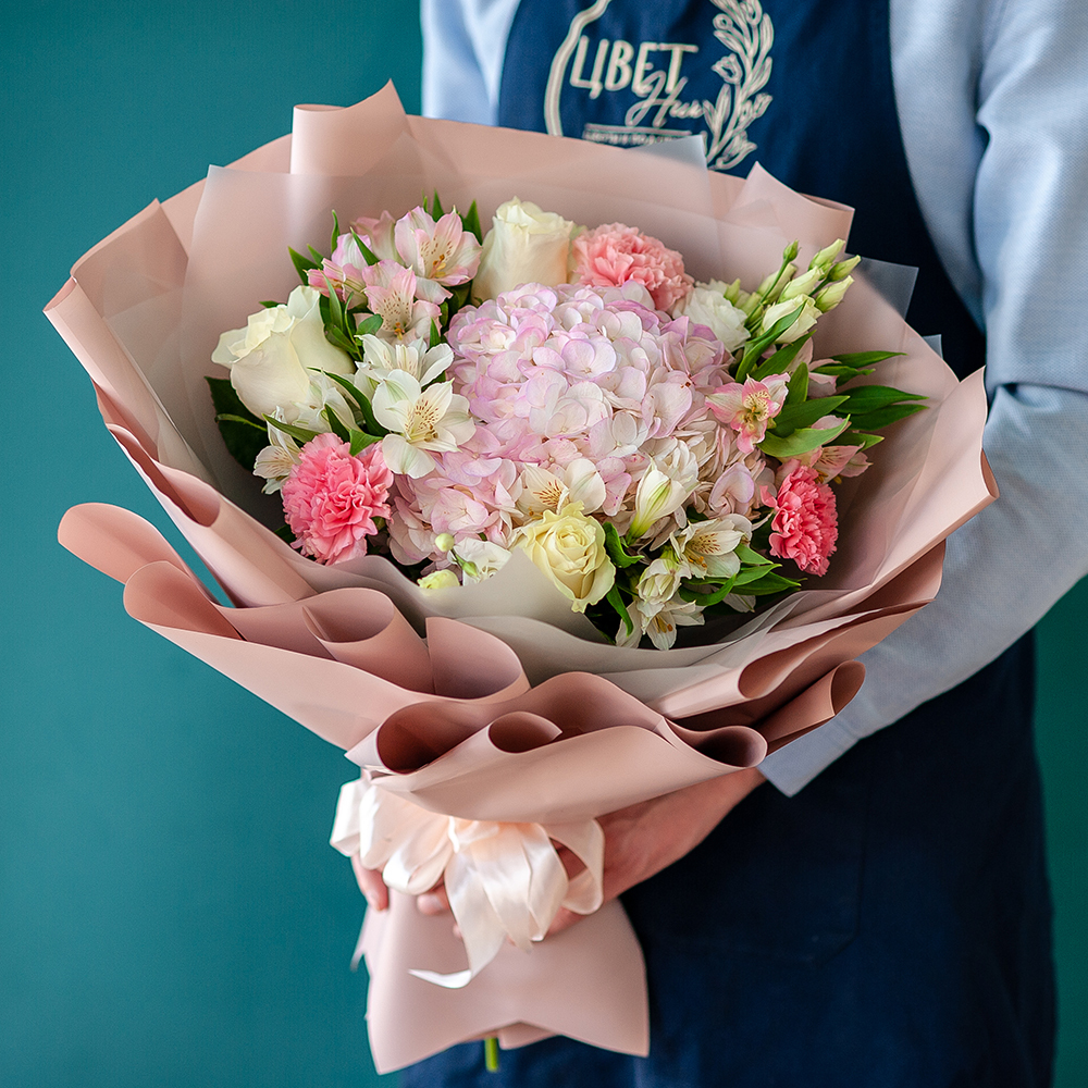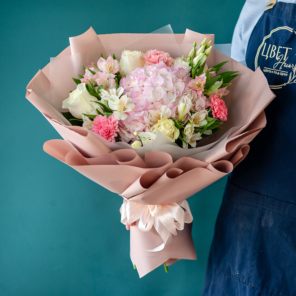 Подарите нежность и утонченность с этим восхитительным букетом, который станет идеальным сюрпризом для ваших близких. Состав: - Гортензия (розовая) - Розы кремовые - Альстромерии - Эустома - Гвоздики розовые - Декоративная зелень - Стильная упаковка с атласной лентой Идеально подходит для: - Дня рождения - Годовщины - Поздравления без повода - Декора интерьера Доставка по Рязани Оперативная доставка по городу – порадуйте дорогого человека свежими цветами в удобное время! Закажите уже сегодня и создайте атмосферу радости и тепла!