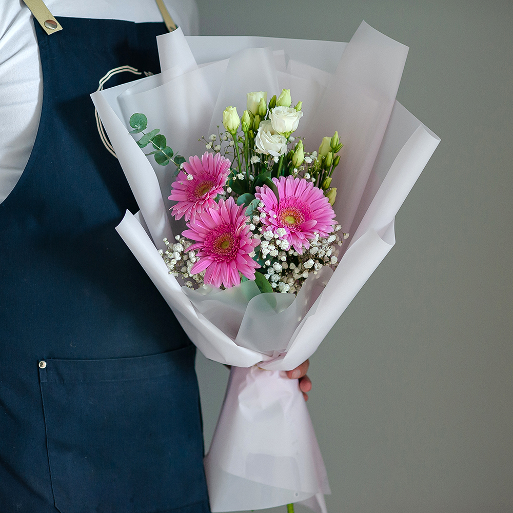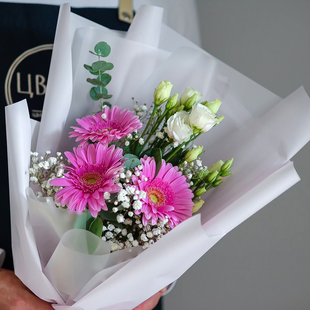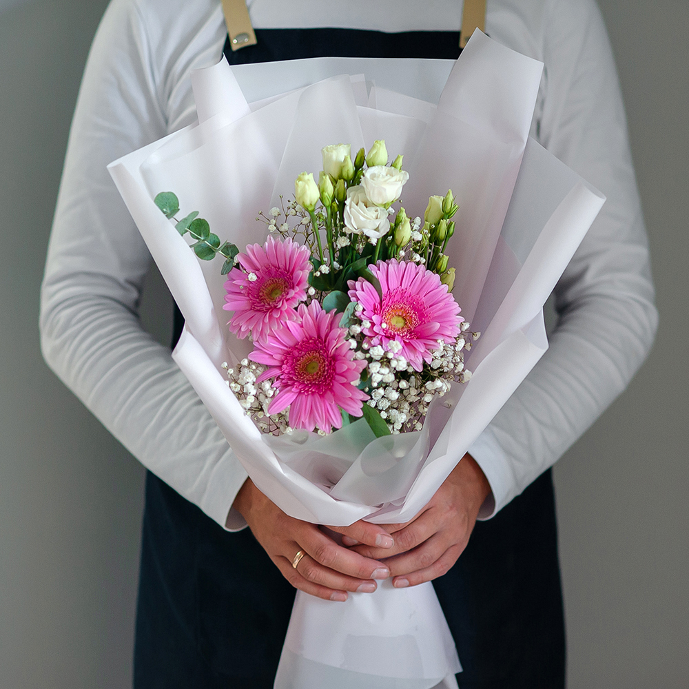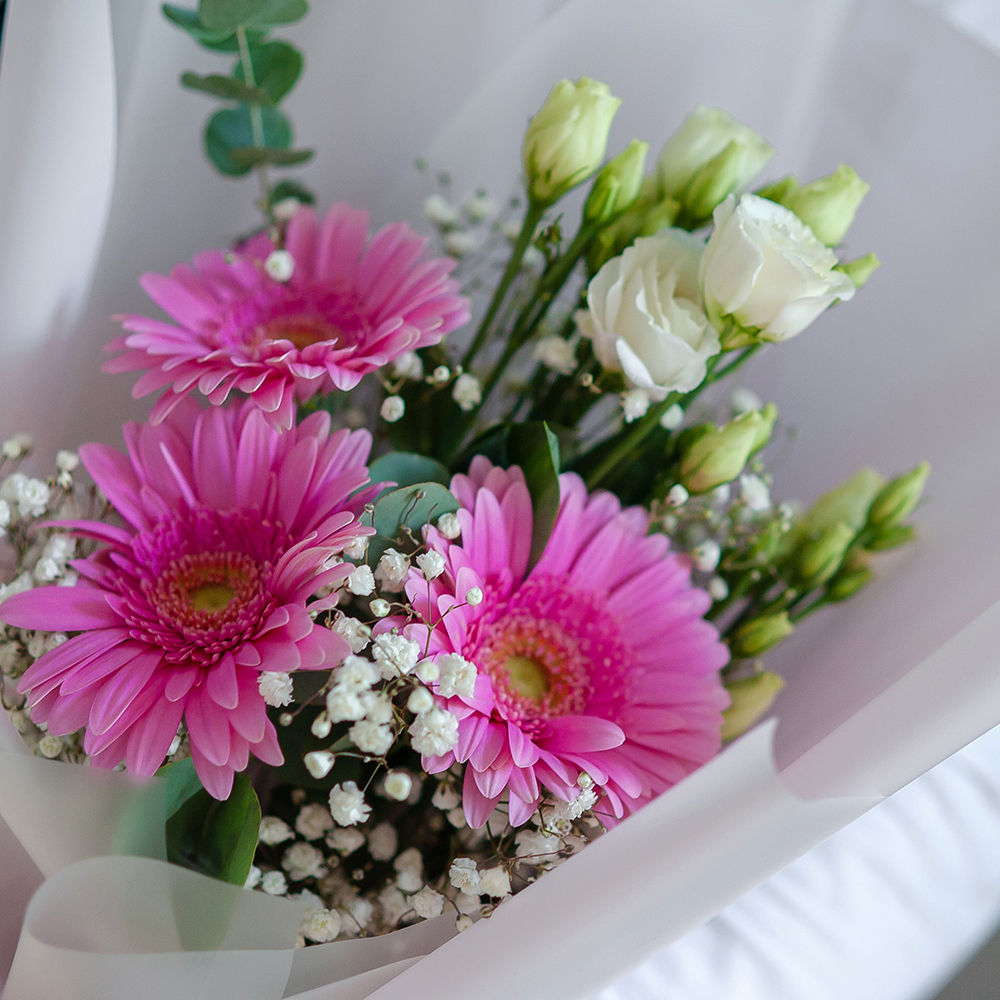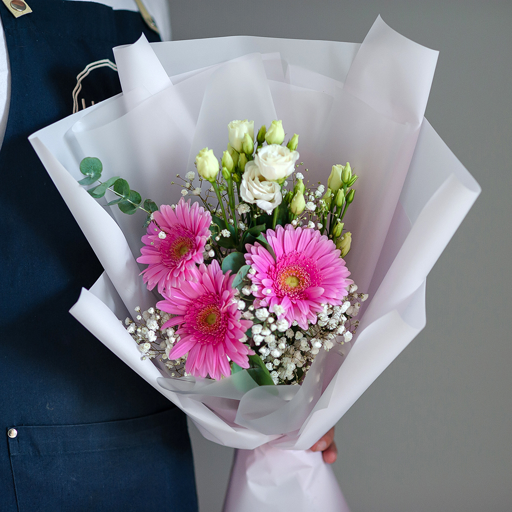 Сборный букет с розовыми герберами — это изысканный и нежный подарок, который порадует любого получателя. В букете гармонично сочетаются розовые герберы с белыми нежными гипсофилами и лизиантусом, создавая неповторимую композицию. Розовые герберы символизируют радость, лёгкость и нежность. Они прекрасно смотрятся в любом интерьере. Букет упакован в стильную упаковку, которая подчёркивает его красоту и элегантность. Он станет прекрасным подарком на любой праздник или просто для того, чтобы порадовать близкого человека.