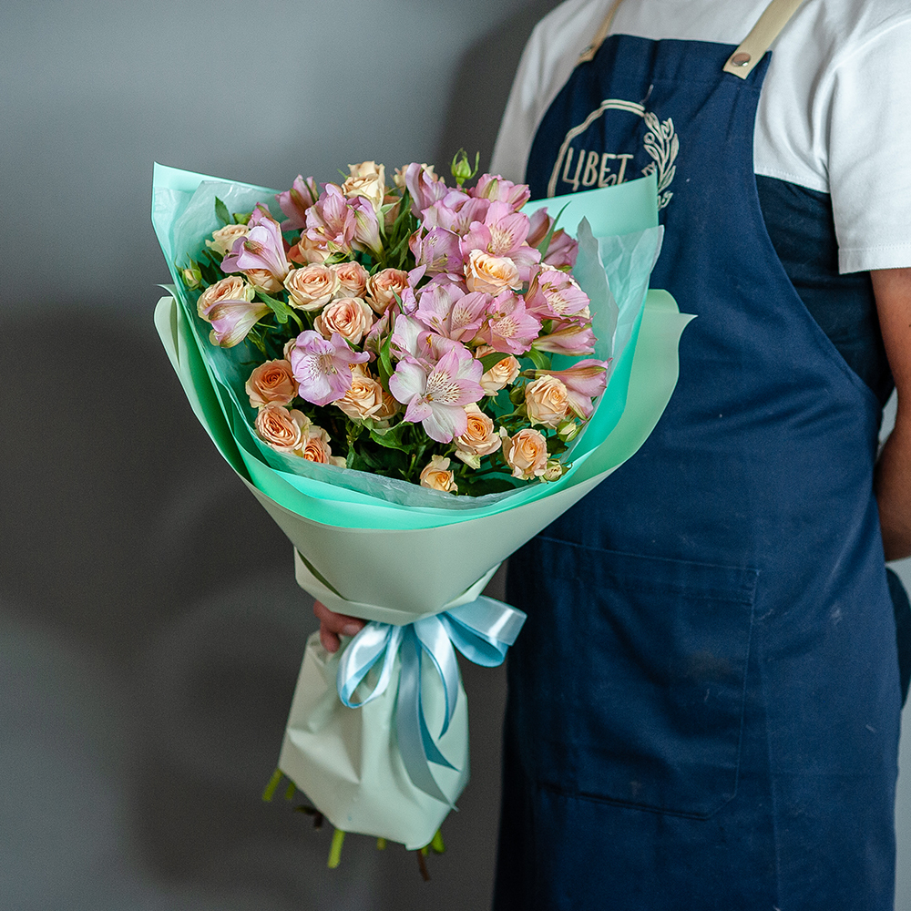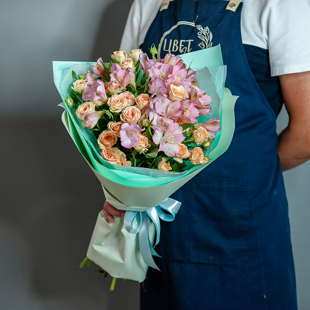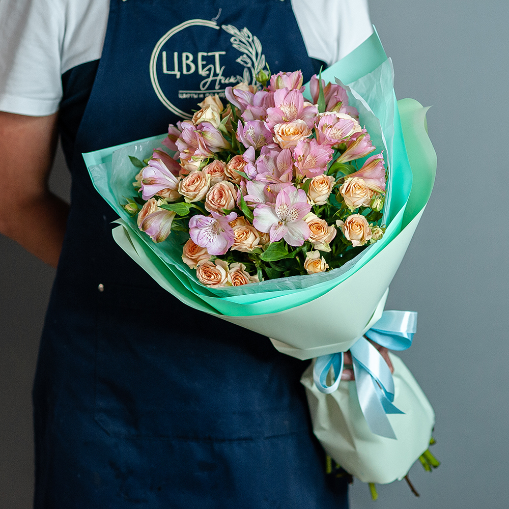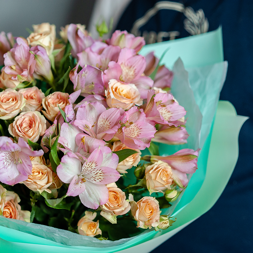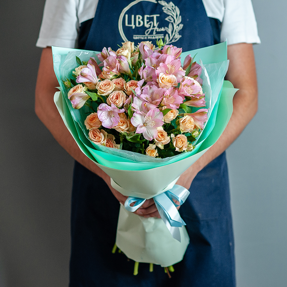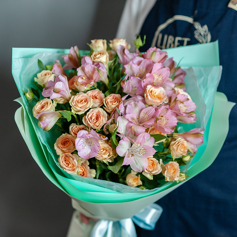 Этот букет олицетворяет собой элегантность и утонченность, идеально подходящий для любого случая. Основу букета составляют пышные и ароматные кустовые розы, которые придают композиции роскошный и романтичный вид. Их нежные оттенки гармонично сочетаются с яркими и экзотическими альстромериями, добавляя букету игривости и оригинальности Букет оформлен с особым вниманием к деталям. Он упакован в стильную дизайнерскую бумагу, которая подчеркивает красоту цветов и придает композиции завершенный вид. Этот сборный букет станет прекрасным подарком для ваших близких, друзей или коллег, выражая заботу и внимание к их чувствам. Он идеально подойдет для любого торжества, будь то день рождения, годовщина или просто приятный сюрприз без повода. Дарите радость и красоту с нашим сборным букетом в нежном оформлении с кустовой розой и альстромерией!